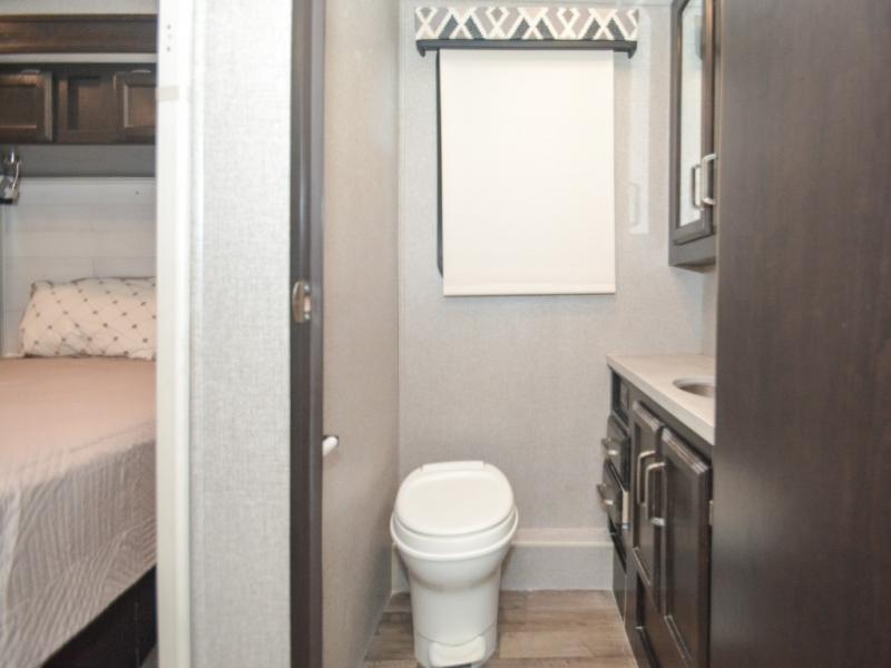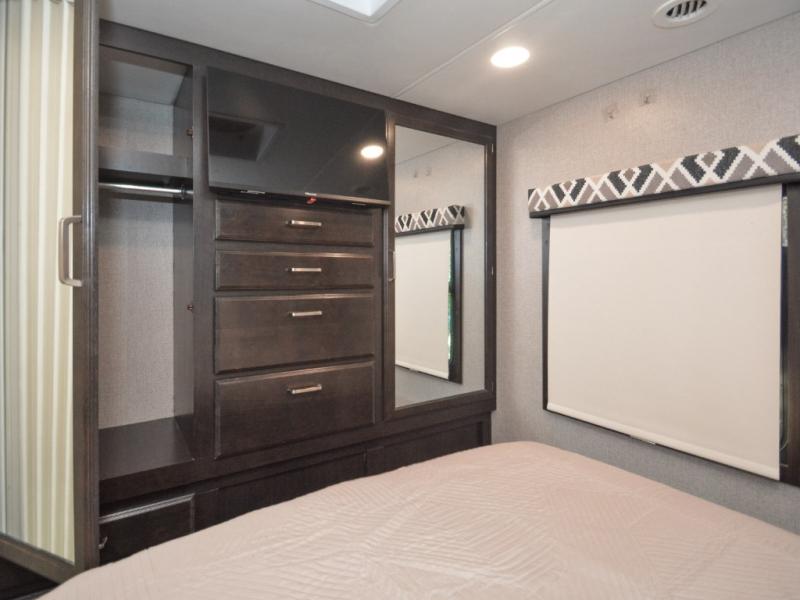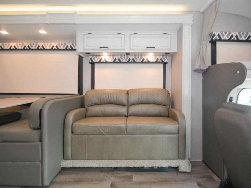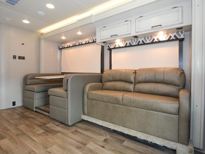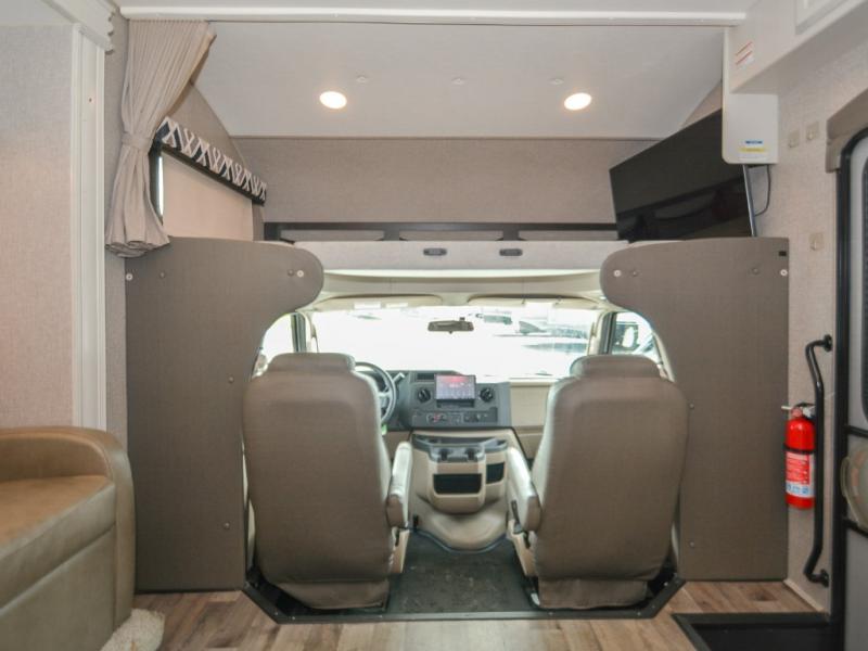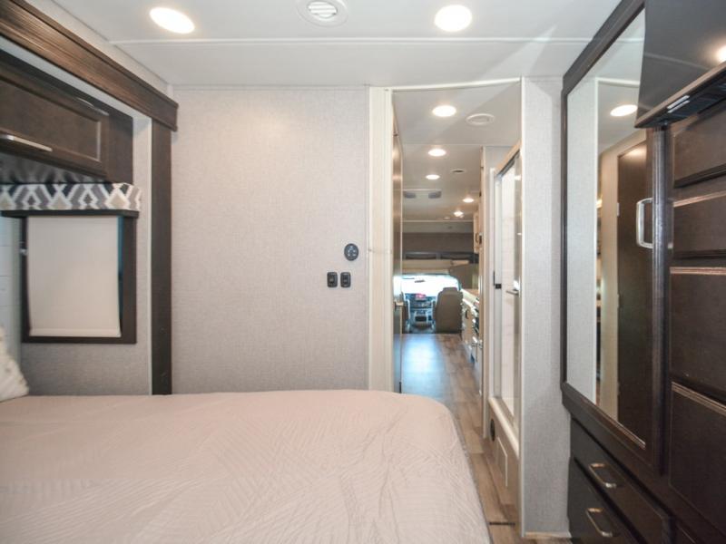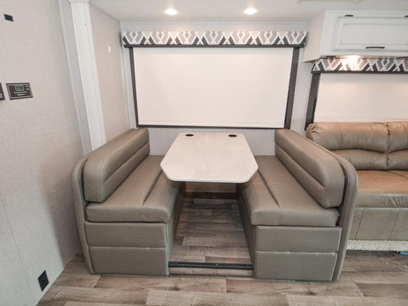 Pack your bags and head to the coast in this spacious motorhome. You'll find two slides throughout for added space, and a sleeping capacity of seven so the grandkids can come along. Relax on the sofa or play a game at the booth dinette while the chef of the family prepares a meal. The residential-size microwave will be great for quick meals, and the Furrion all-in-one cooktop oven can be used for casseroles. This model includes an independent shower with a private toilet and sink right across the hall so two people can freshen up at once. You will feel right at home in the rear bedroom that includes a privacy curtain, a slide out queen bed, dual wardrobes, plus your own LED TV!