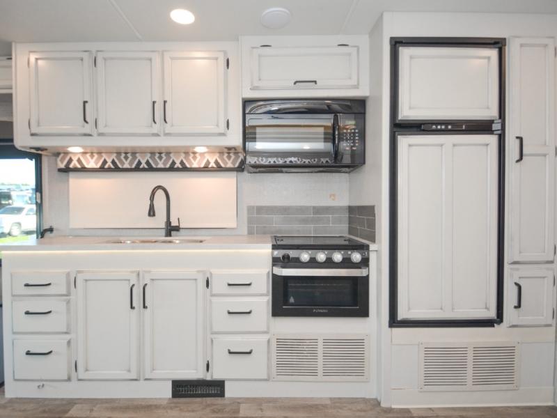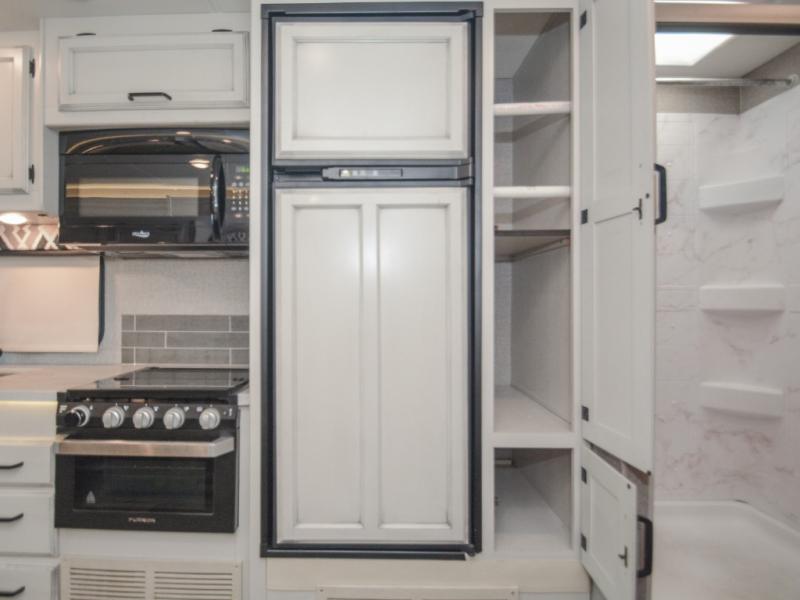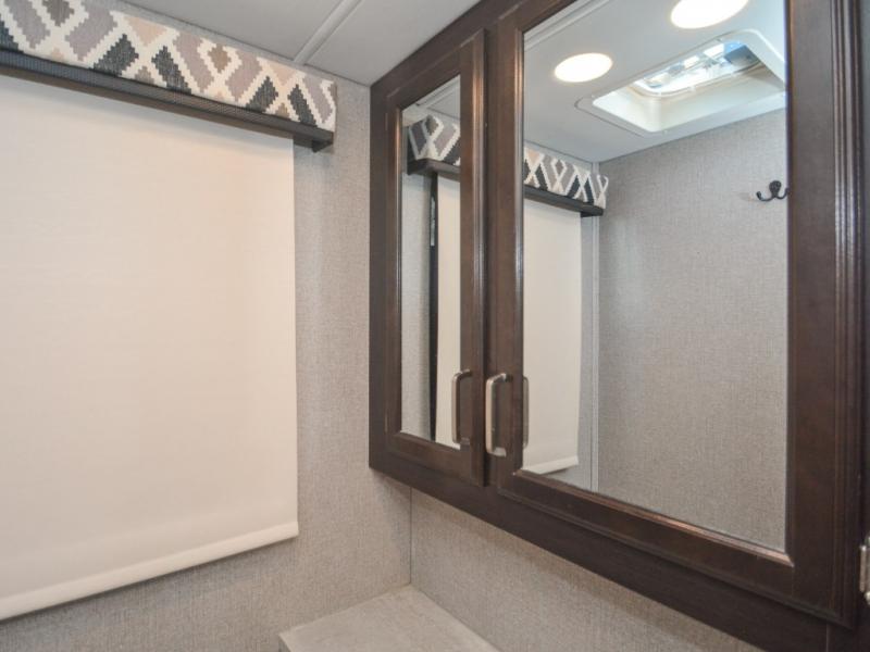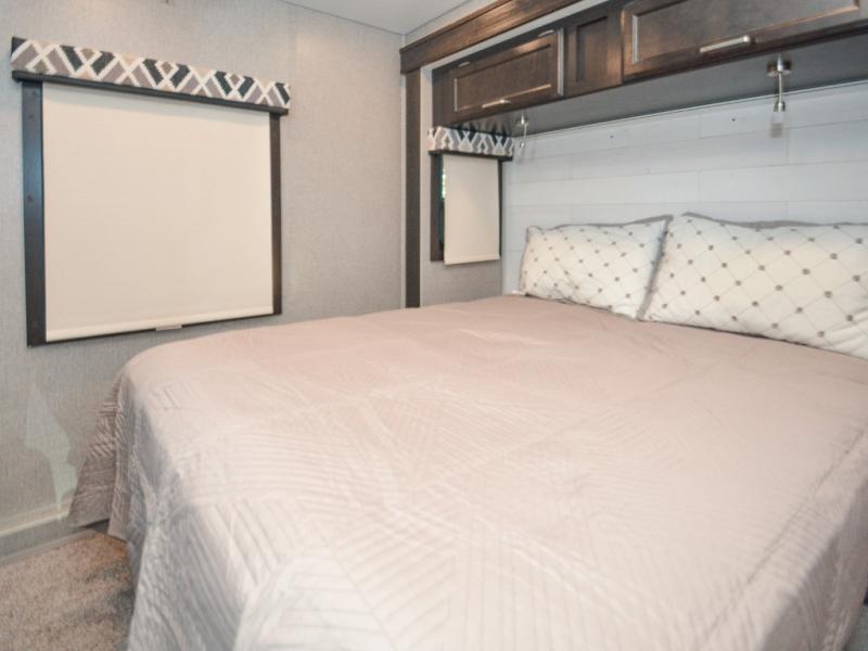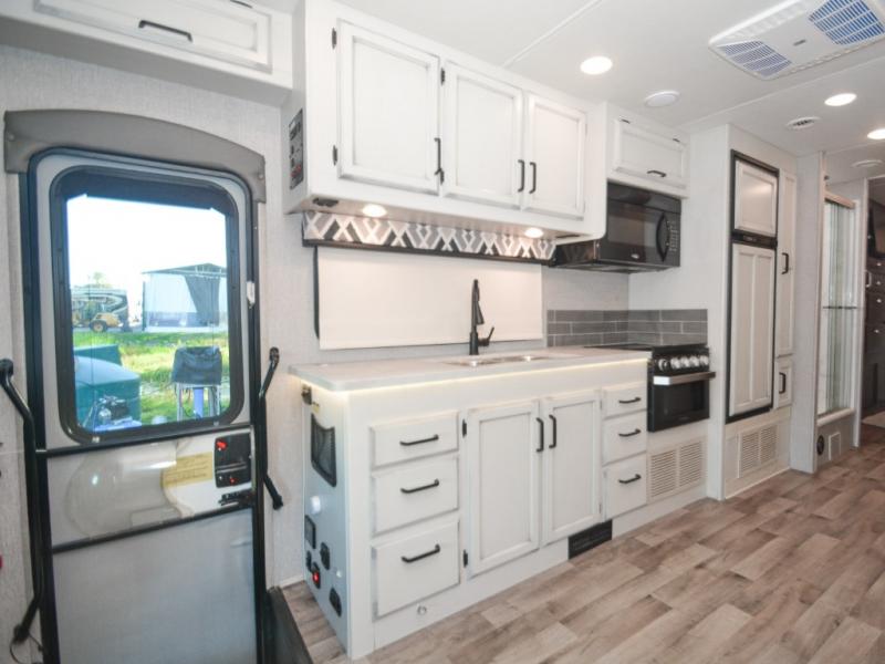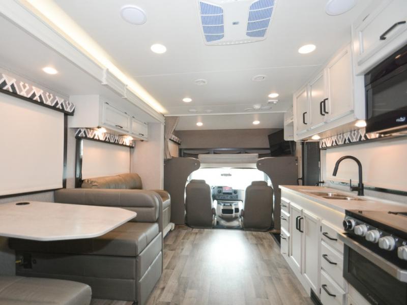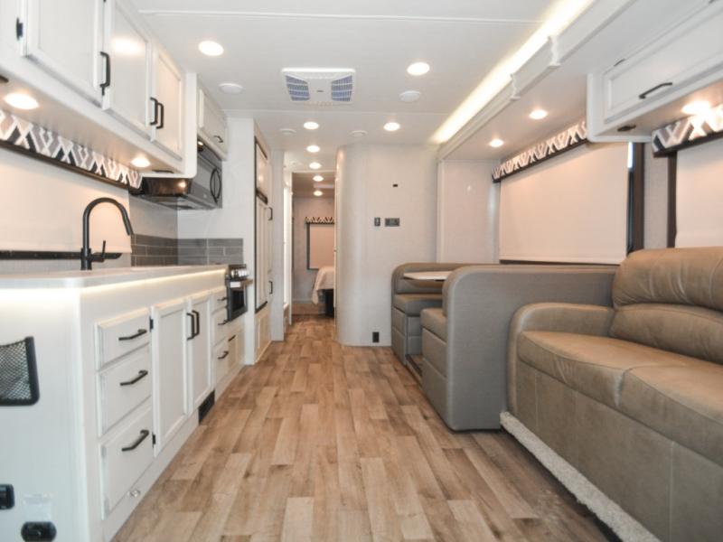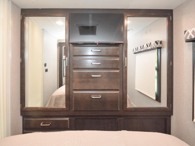 Pack your bags and head to the coast in this spacious motorhome. You'll find two slides throughout for added space, and a sleeping capacity of seven so the grandkids can come along. Relax on the sofa or play a game at the booth dinette while the chef of the family prepares a meal. The residential-size microwave will be great for quick meals, and the Furrion all-in-one cooktop oven can be used for casseroles. This model includes an independent shower with a private toilet and sink right across the hall so two people can freshen up at once. You will feel right at home in the rear bedroom that includes a privacy curtain, a slide out queen bed, dual wardrobes, plus your own LED TV!