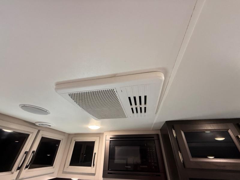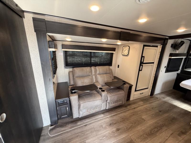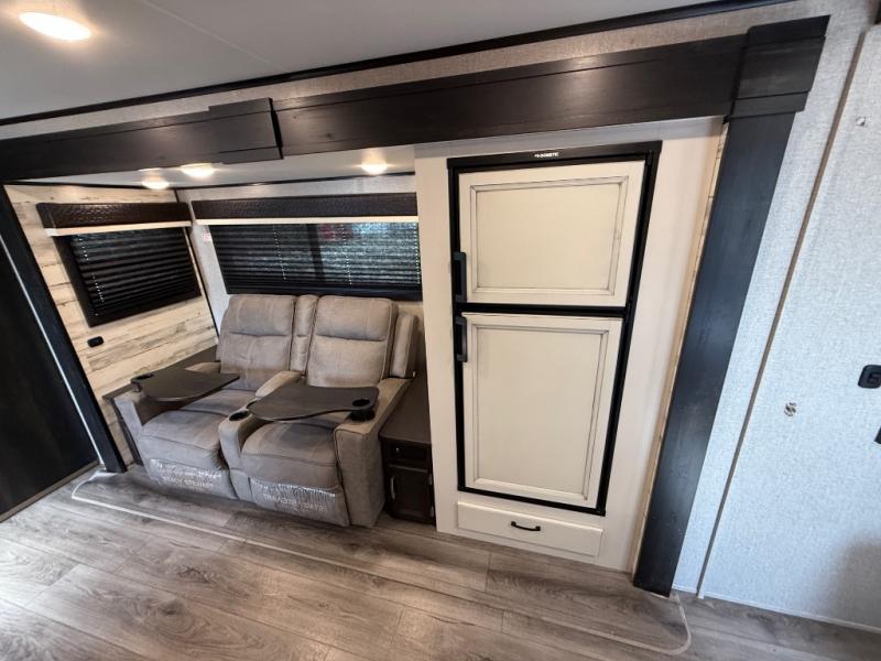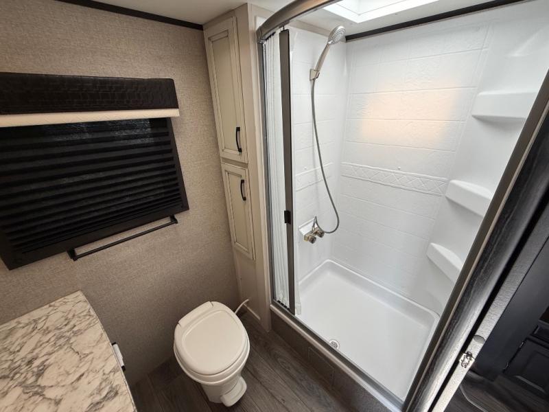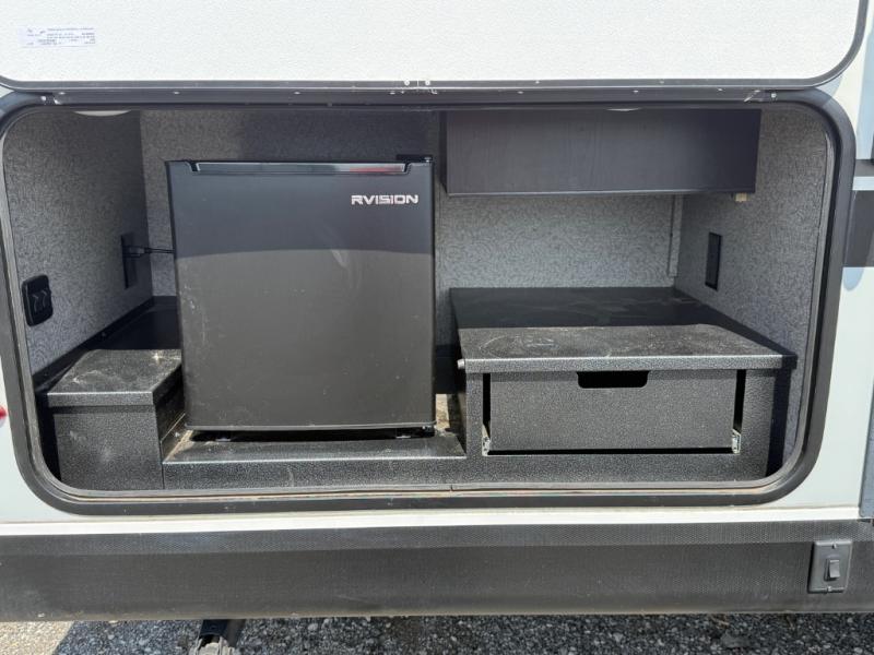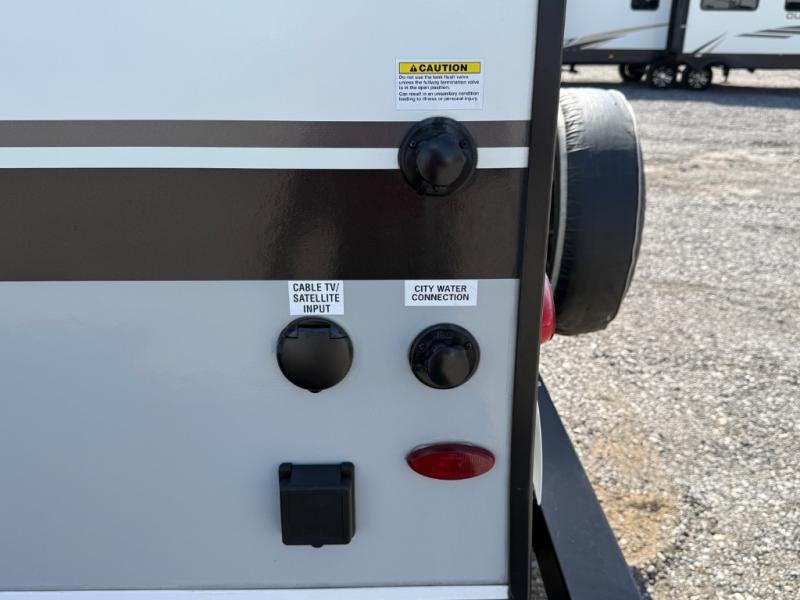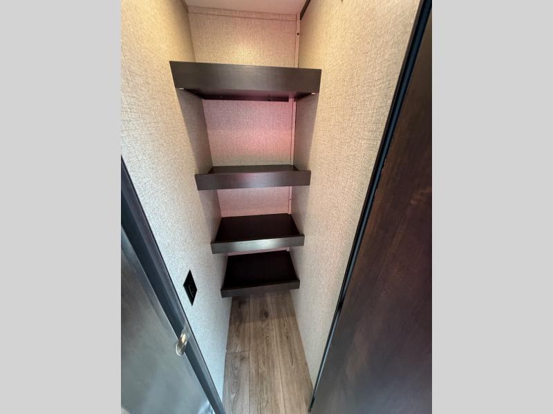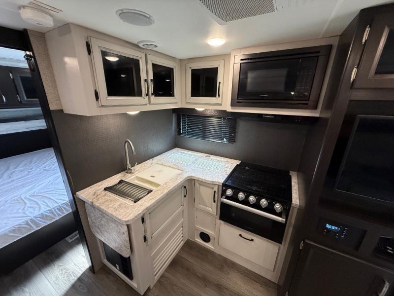This is a perfect couple's trailer with a spacious rear bathroom with lots of counter space and linen storage, plus the front bedroom offers a walk-around queen bed, dual wardrobes and a space savings sliding door for privacy. The L-shaped kitchen offers extra counter space on the flip-up table, a Furrion range including a three burner recessed glass cooktop and oven, plus a walk-in pantry near the entry for easy access while camping, loading and unloading. The outdoor cook will surely love the outside camp kitchen allowing them to visit with other RVers as they walk by and they will have the 16' power awning with LED lights to relax underneath. The slide out includes the 6 cu. ft. refrigerator and U-dinette or maybe you choose the L-lounger option or theater seating with table trays option.