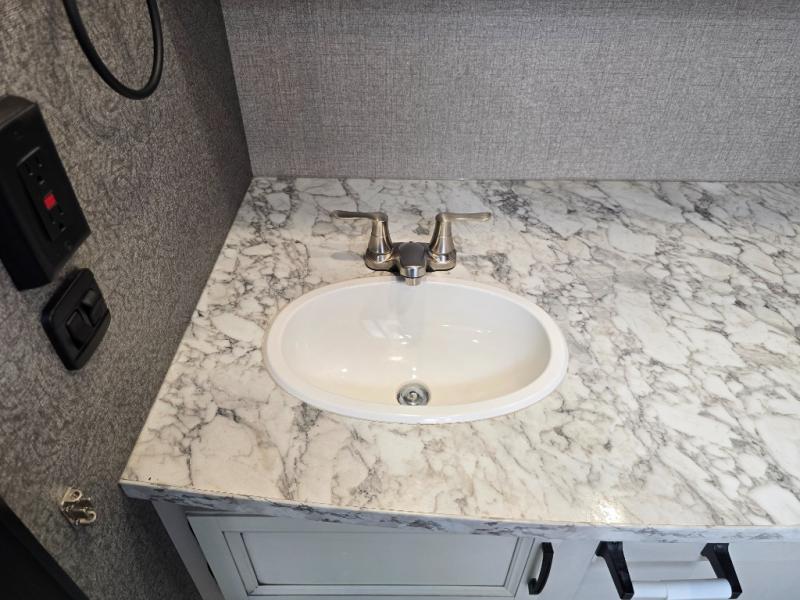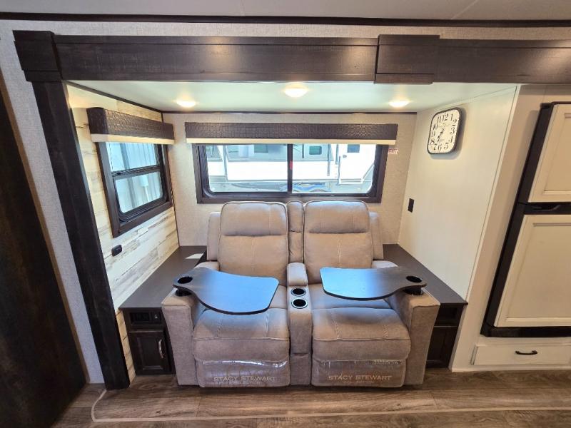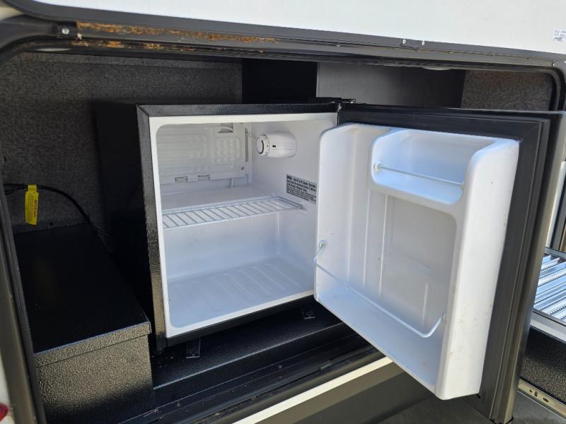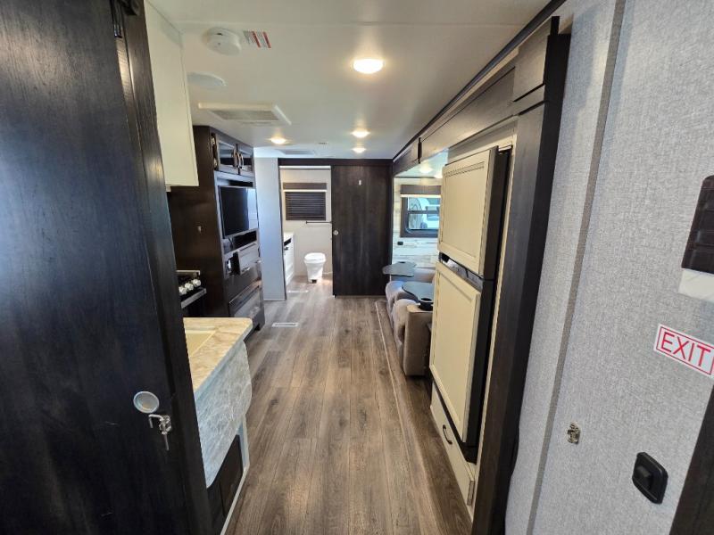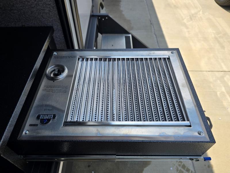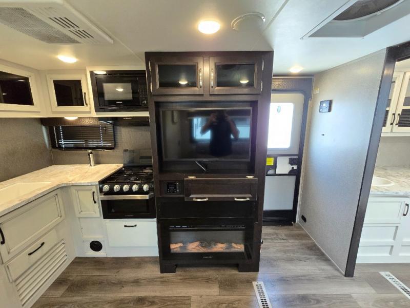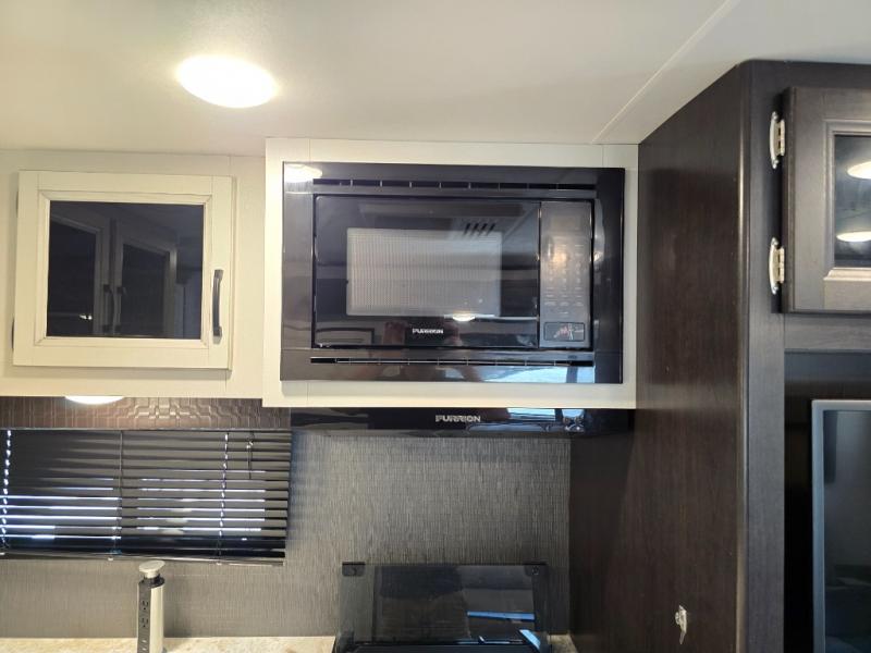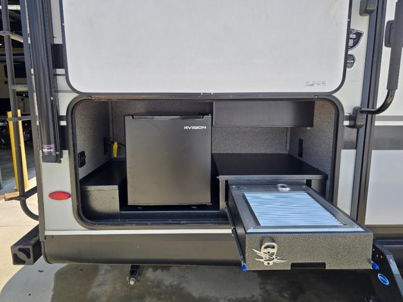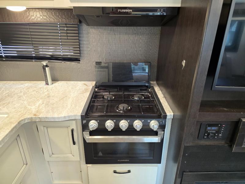 This is a perfect couple's trailer with a spacious rear bathroom with lots of counter space and linen storage, plus the front bedroom offers a walk-around queen bed, dual wardrobes and a space savings sliding door for privacy. The L-shaped kitchen offers extra counter space on the flip-up table, a Furrion range including a three burner recessed glass cooktop and oven, plus a walk-in pantry near the entry for easy access while camping, loading and unloading. The outdoor cook will surely love the outside camp kitchen allowing them to visit with other RVers as they walk by and they will have the 16' power awning with LED lights to relax underneath. The slide out includes the 6 cu. ft. refrigerator and U-dinette or maybe you choose the L-lounger option or theater seating with table trays option.
