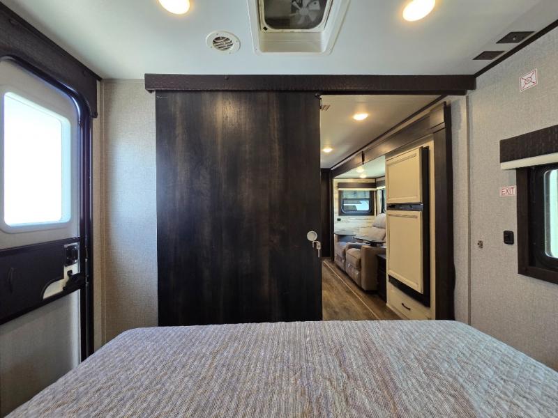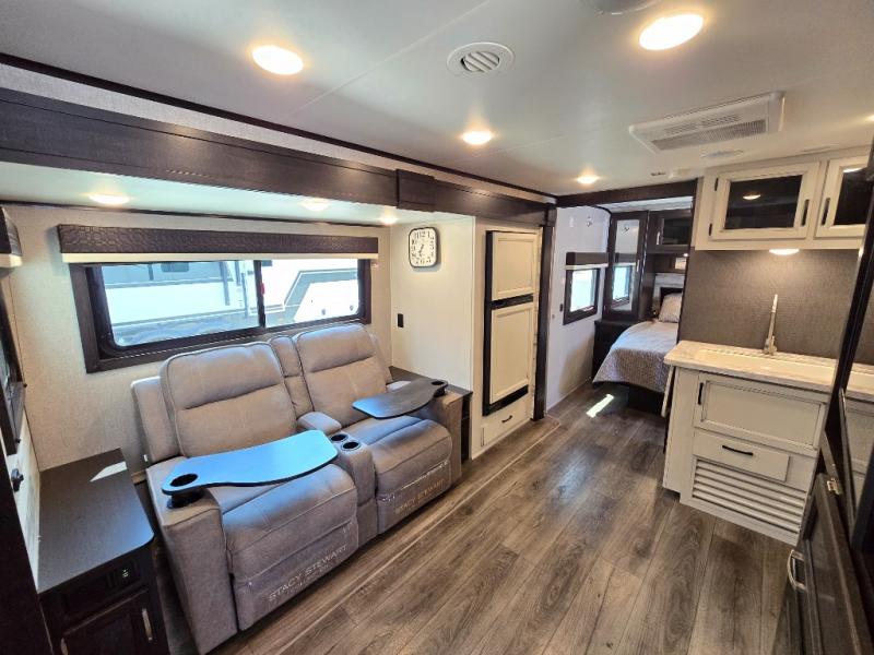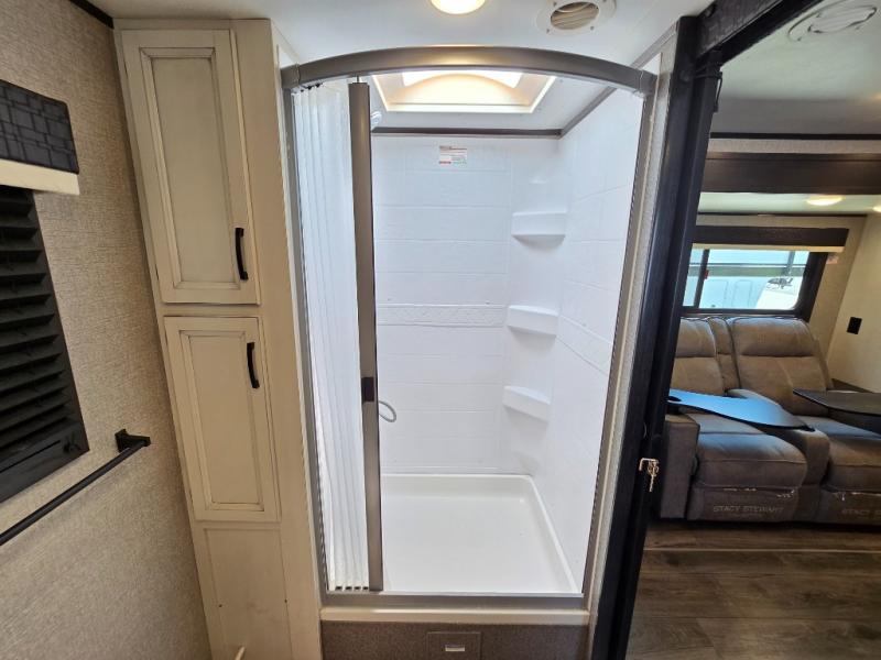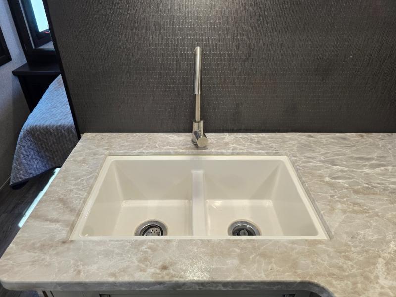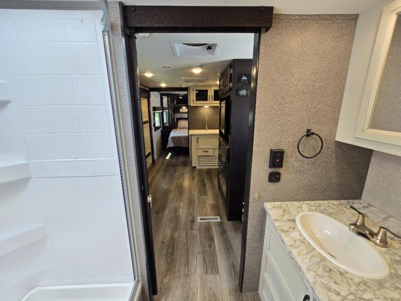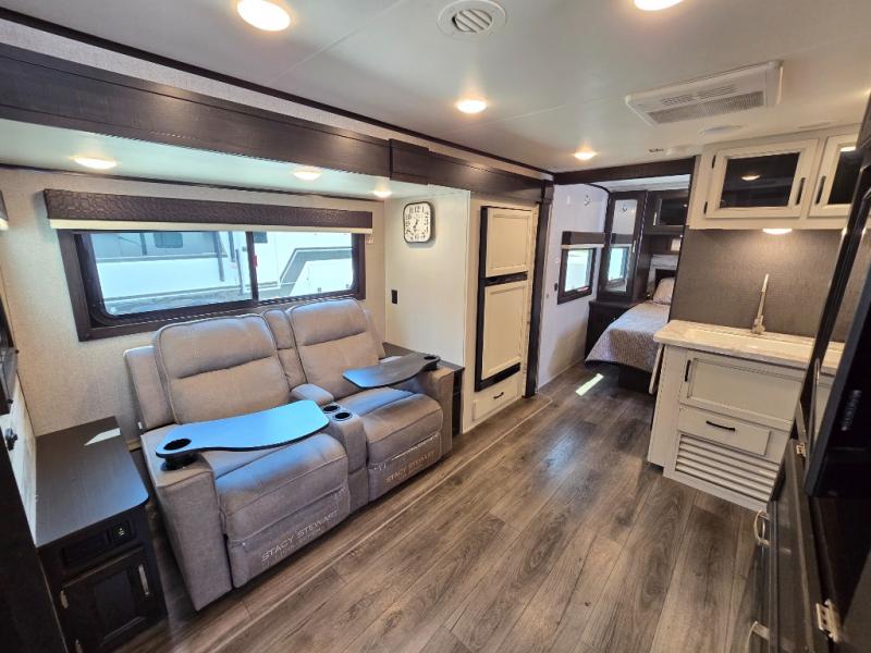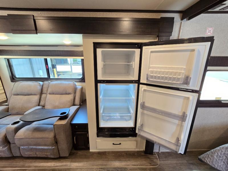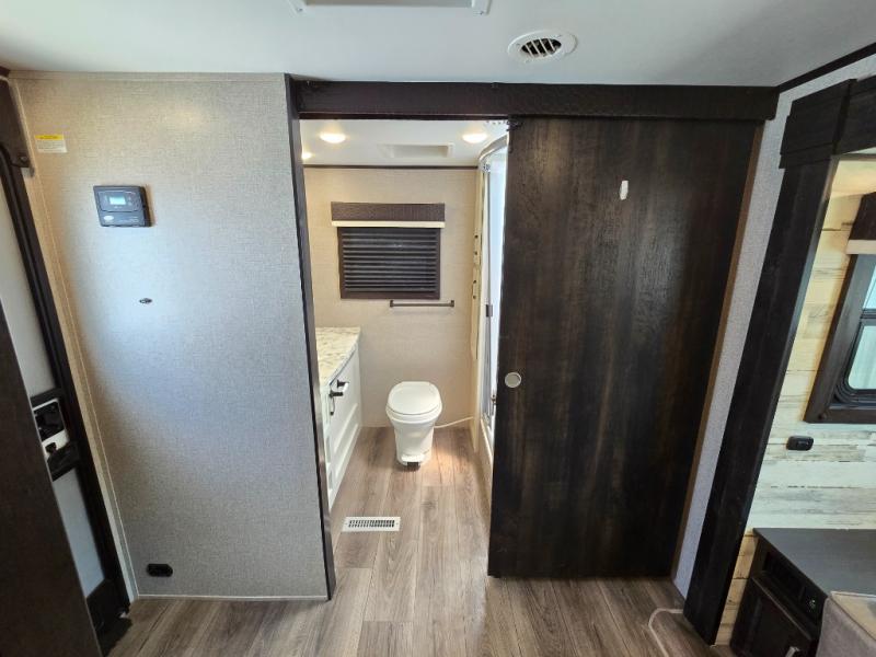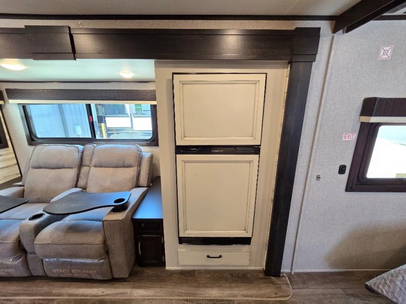 This is a perfect couple's trailer with a spacious rear bathroom with lots of counter space and linen storage, plus the front bedroom offers a walk-around queen bed, dual wardrobes and a space savings sliding door for privacy. The L-shaped kitchen offers extra counter space on the flip-up table, a Furrion range including a three burner recessed glass cooktop and oven, plus a walk-in pantry near the entry for easy access while camping, loading and unloading. The outdoor cook will surely love the outside camp kitchen allowing them to visit with other RVers as they walk by and they will have the 16' power awning with LED lights to relax underneath. The slide out includes the 6 cu. ft. refrigerator and U-dinette or maybe you choose the L-lounger option or theater seating with table trays option.