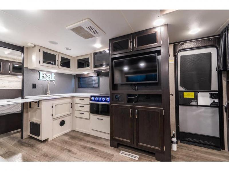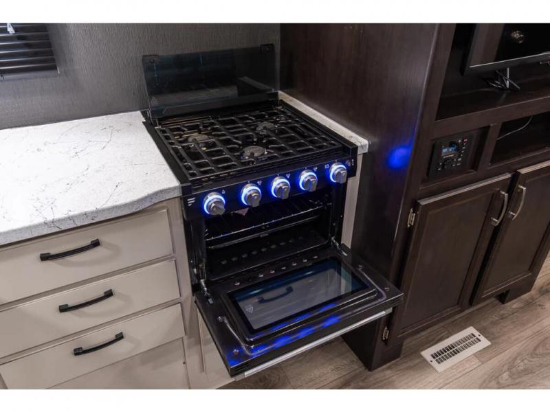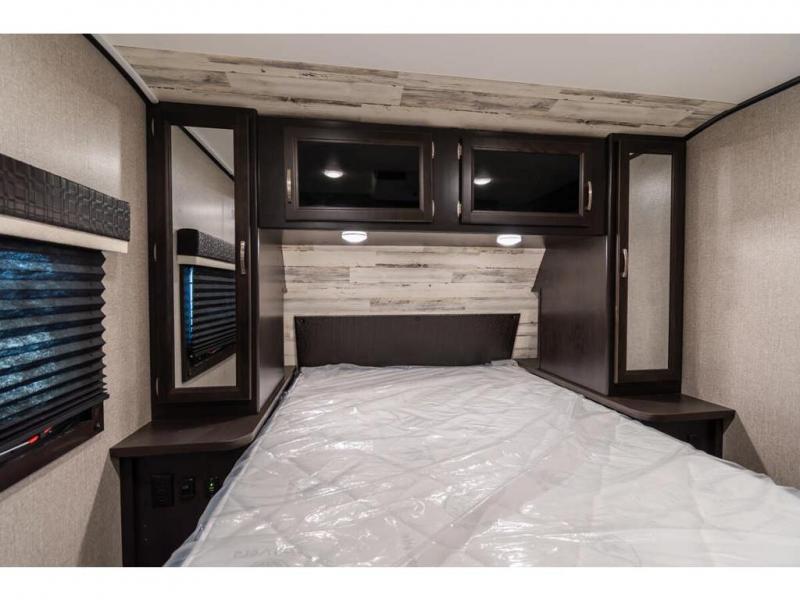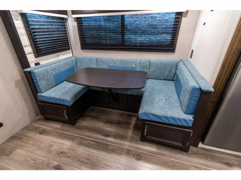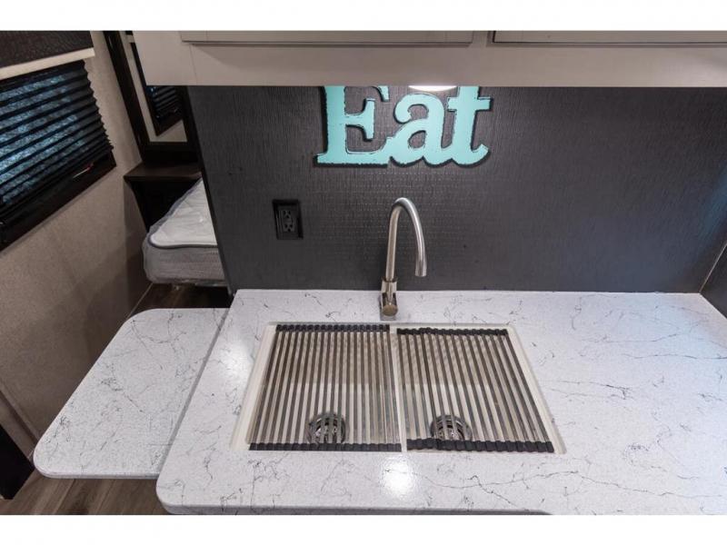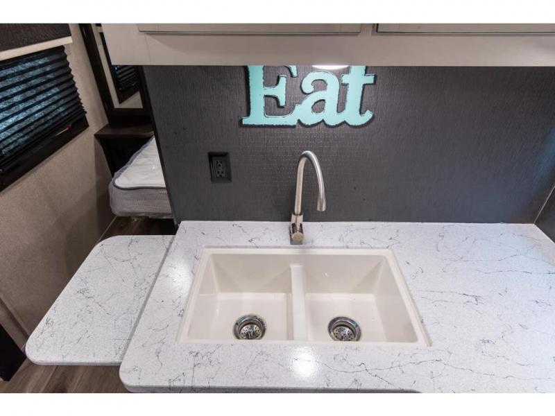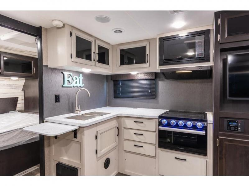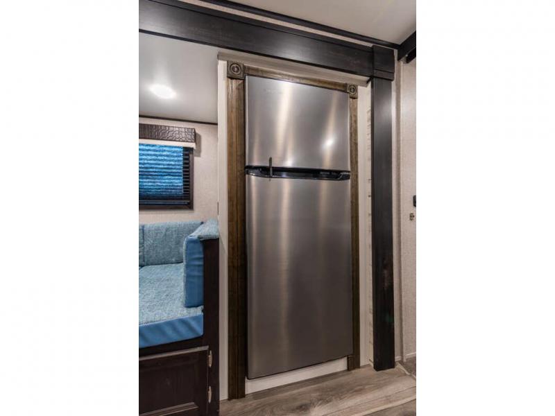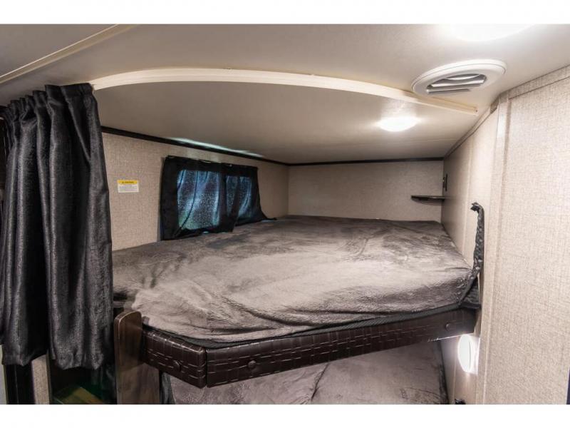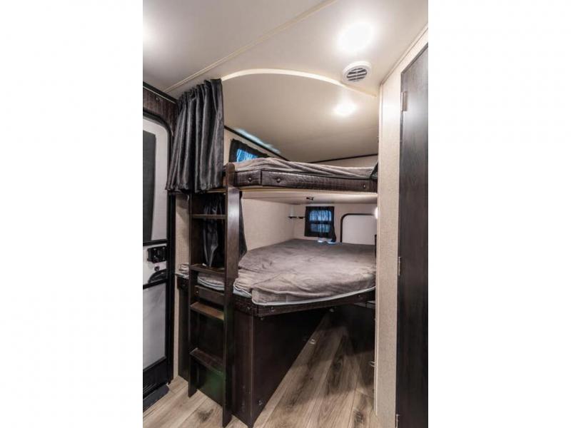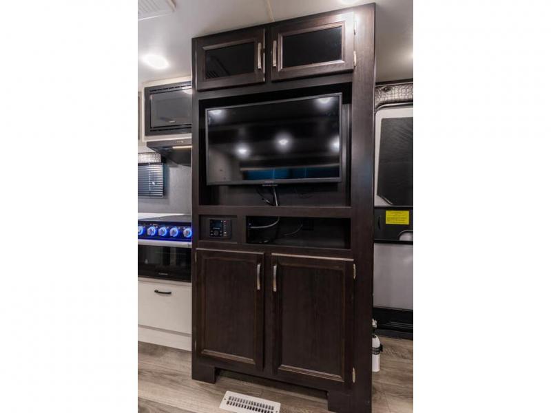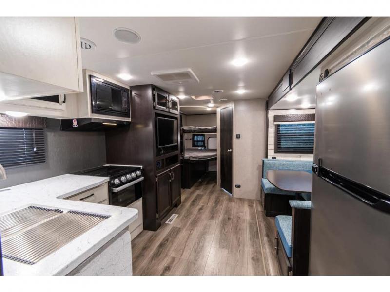 Whether you cook indoors at the L-shaped kitchen with a flip-up table for more counter space and a walk-in pantry for plenty of storage, or outdoors on the outside camp kitchen, you will have all the appliances you need. If you want to dine outdoors, the 21' power awning with LED lights offers protection from the elements, or you can eat inside at the U-shaped dinette. However, you might like to add the L-lounger option or the theater seating option in place of the dinette, the choice is yours. At night the kids will love their own double size bunk beds, ladder and privacy curtain while you have your own walk-around queen bed in the rear bedroom which also includes a large pocket door entry into the bedroom. And the rear corner full bathroom offers a radius shower, linen storage and much more!