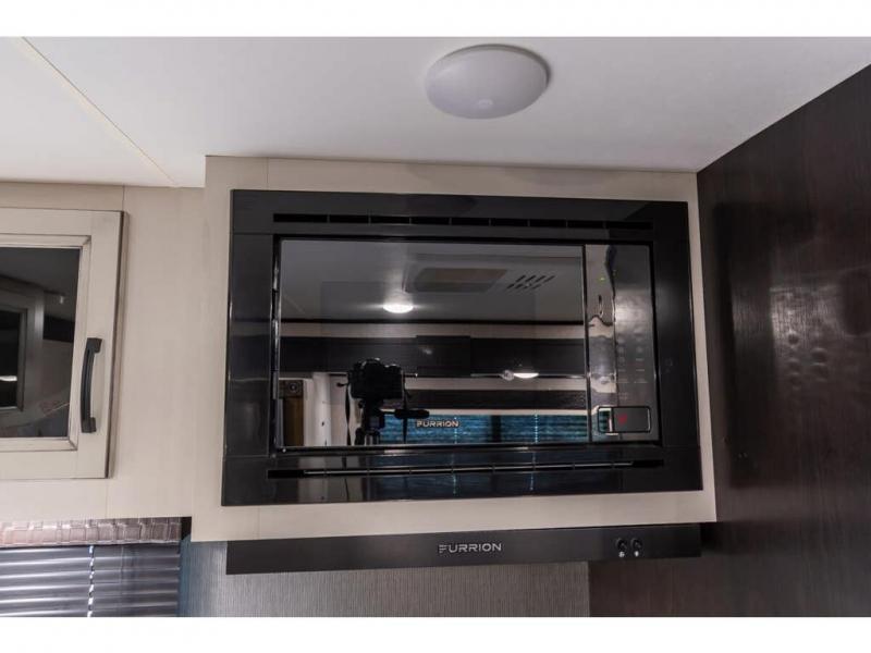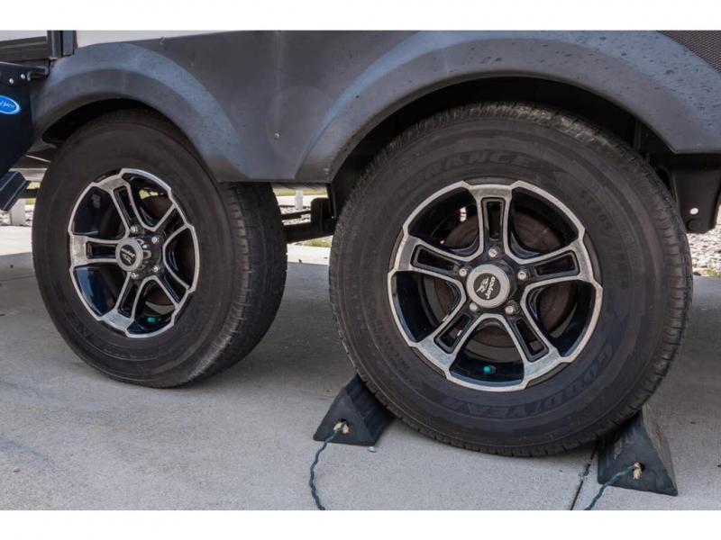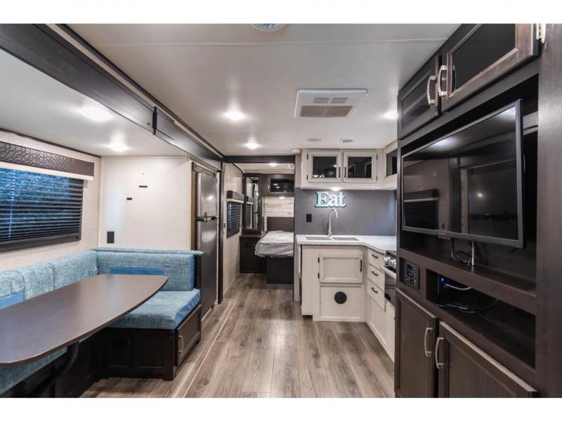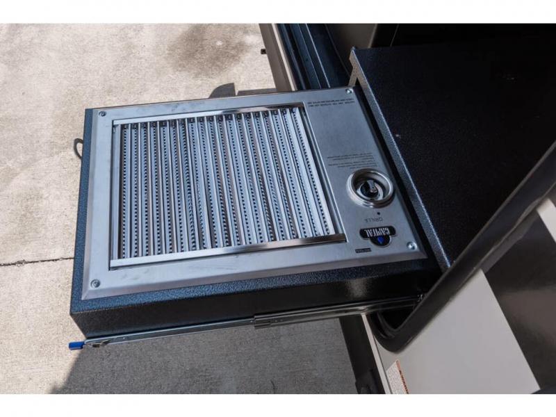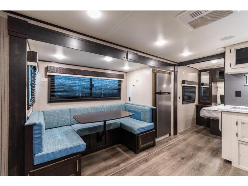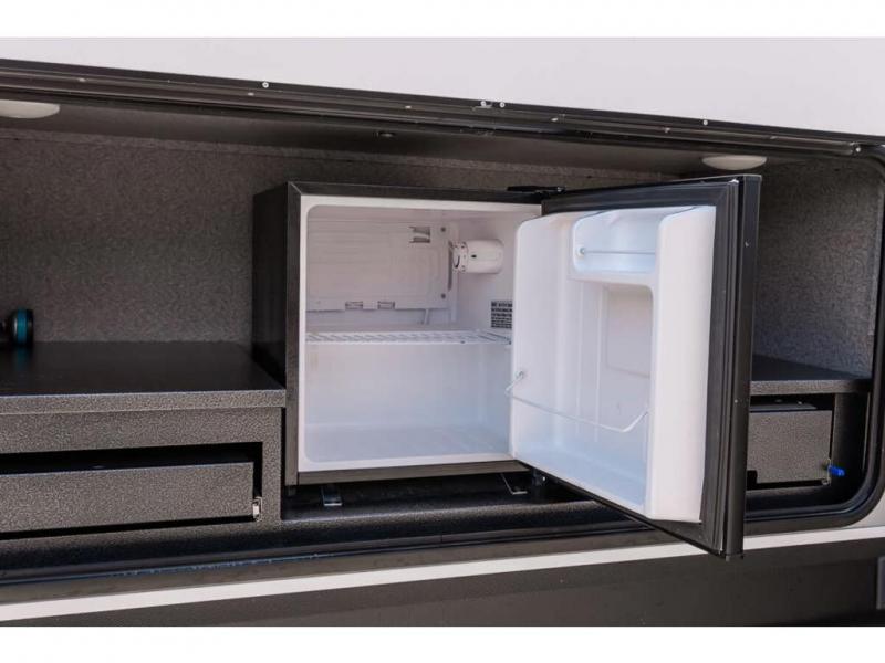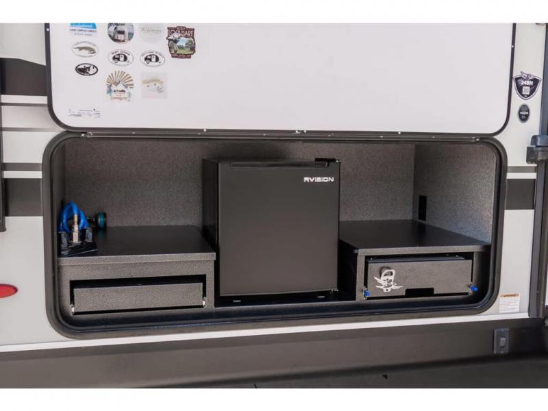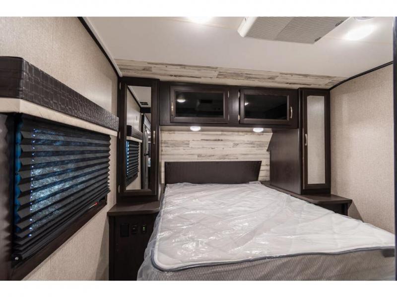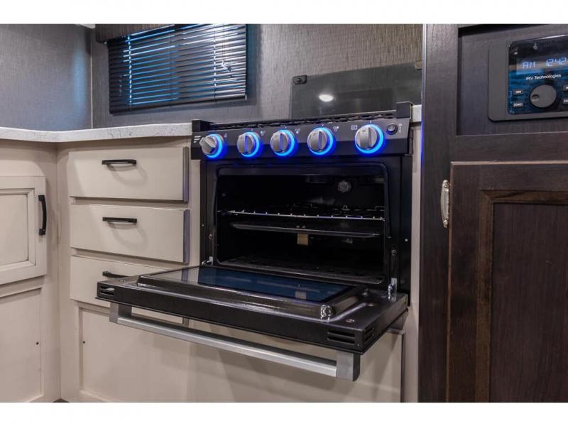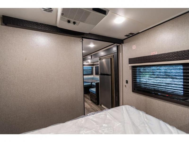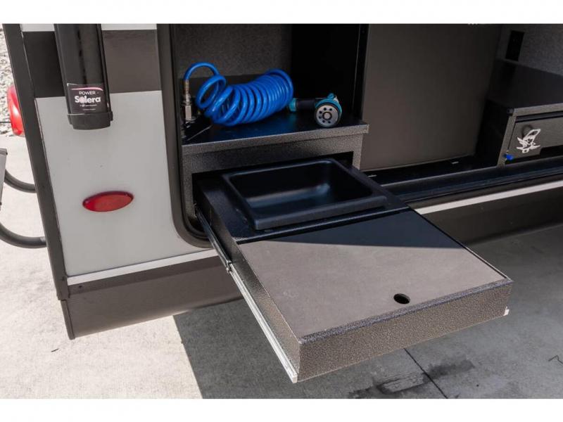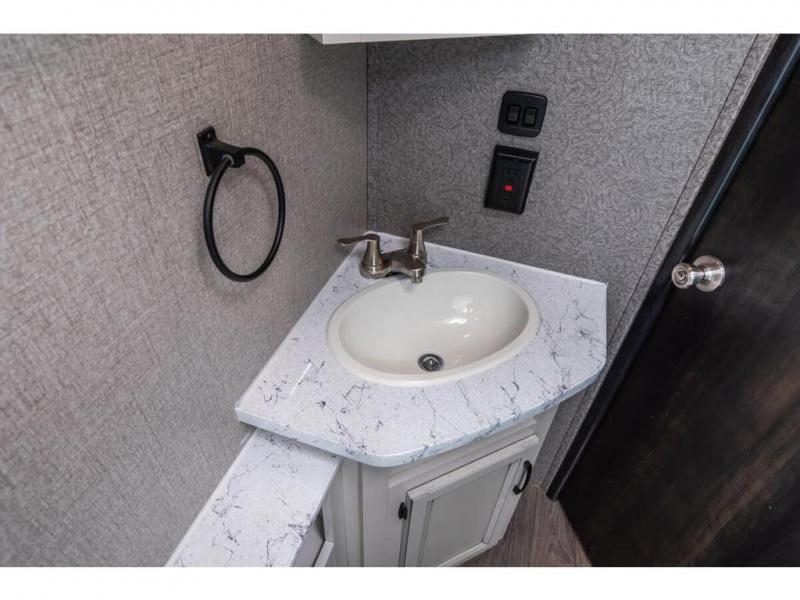 Whether you cook indoors at the L-shaped kitchen with a flip-up table for more counter space and a walk-in pantry for plenty of storage, or outdoors on the outside camp kitchen, you will have all the appliances you need. If you want to dine outdoors, the 21' power awning with LED lights offers protection from the elements, or you can eat inside at the U-shaped dinette. However, you might like to add the L-lounger option or the theater seating option in place of the dinette, the choice is yours. At night the kids will love their own double size bunk beds, ladder and privacy curtain while you have your own walk-around queen bed in the rear bedroom which also includes a large pocket door entry into the bedroom. And the rear corner full bathroom offers a radius shower, linen storage and much more!