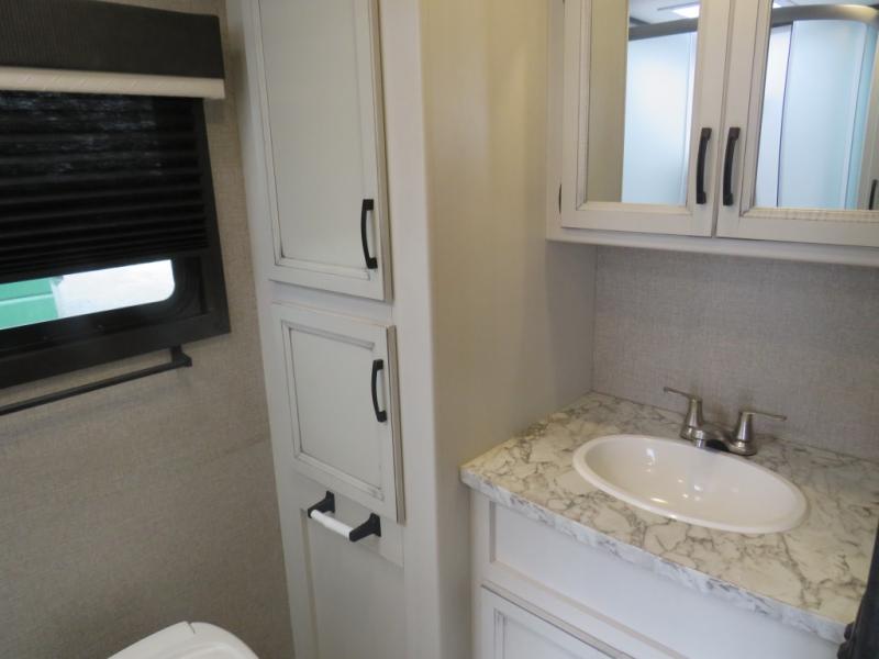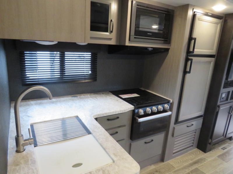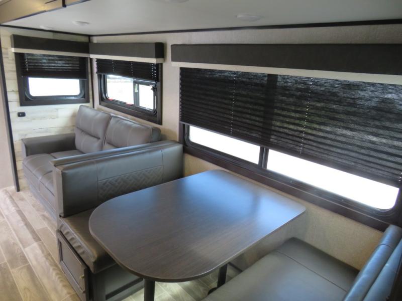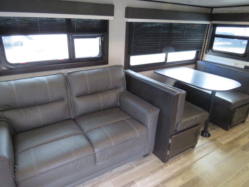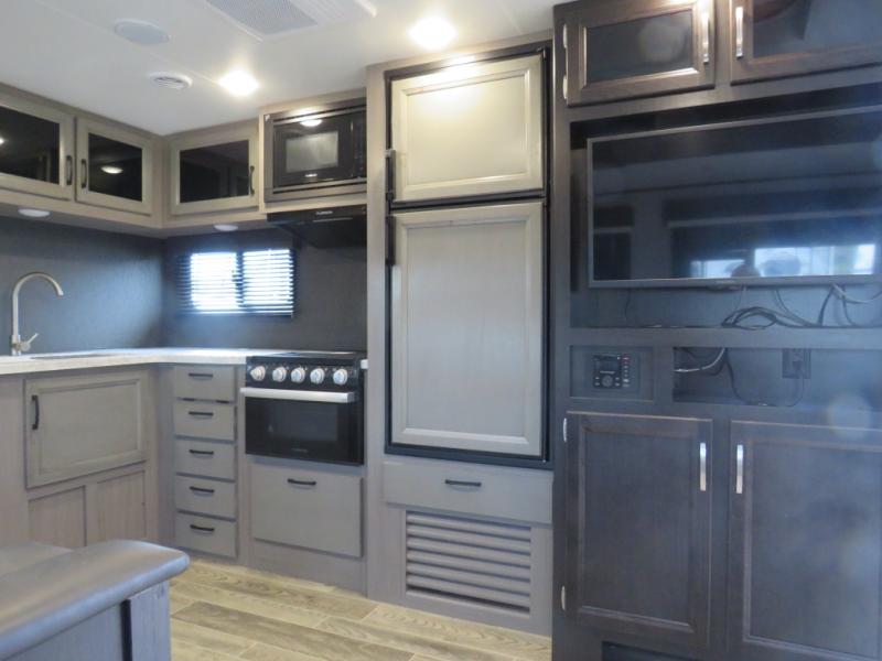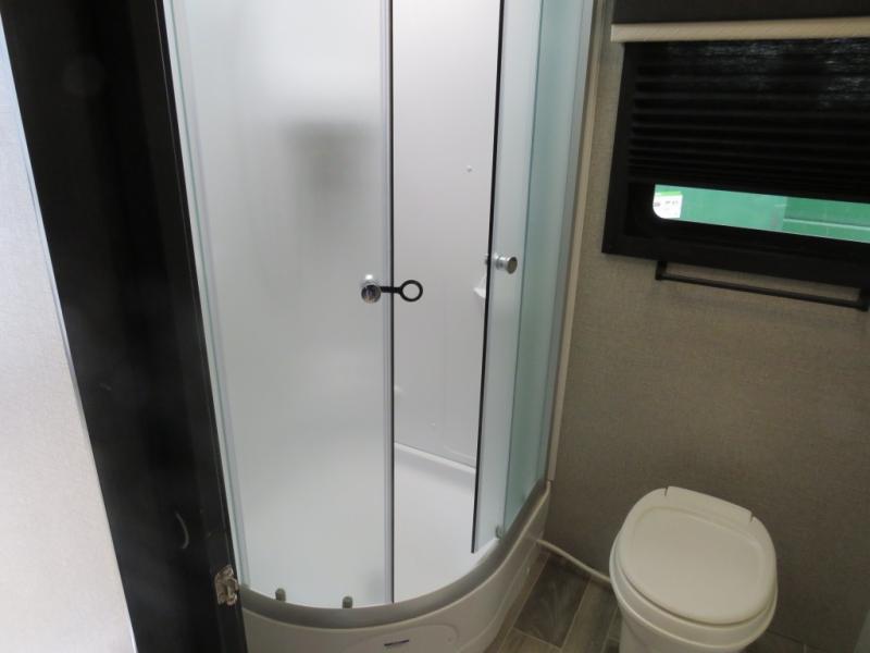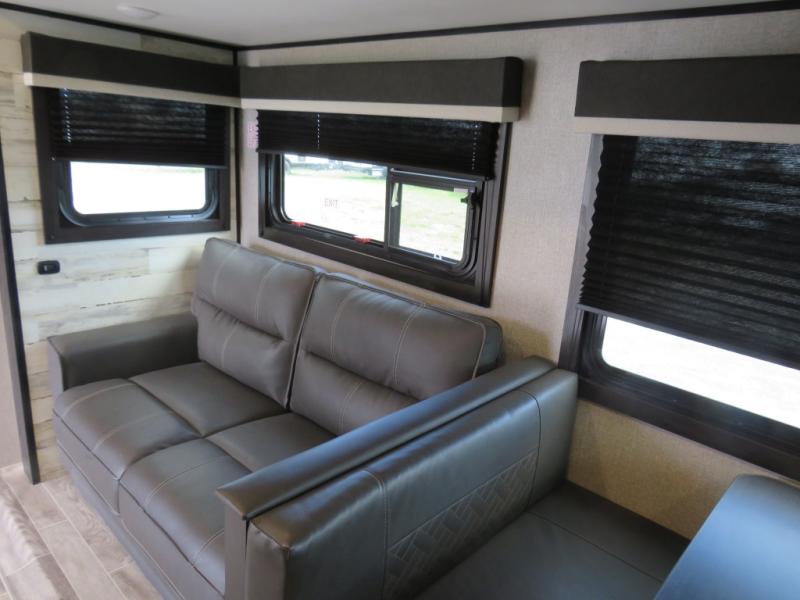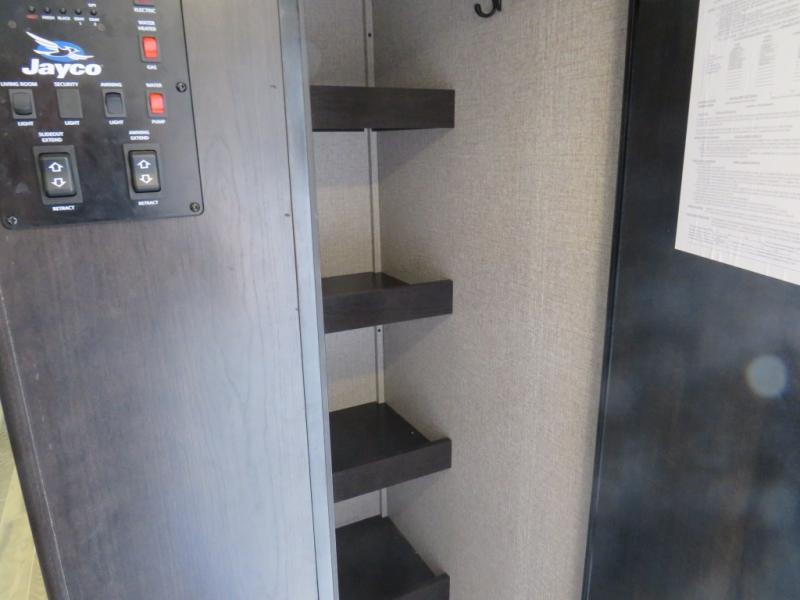 Looking for a family trailer or a couple's retreat? This Jay Feather offers a private bedroom with a walk-around queen bed, dual nightstands and wardrobes as well a space savings sliding door. The spacious rear bathroom gives you plenty of linen storage, a 34" radius shower, and everything you need to skip the public facilities. You can make meals at the L-shaped kitchen with a 6 cu. ft. refrigerator and Furrion range including an oven and three burner recessed glass cooktop, plus dine at the booth dinette or while relaxing on the jackknife sofa. You can choose a tri-fold sofa or theater seating option in place of the dinette if you like. Outside the 19' power awning with LED lights gives you an outdoor living and dining area, just add your camping chairs and table.