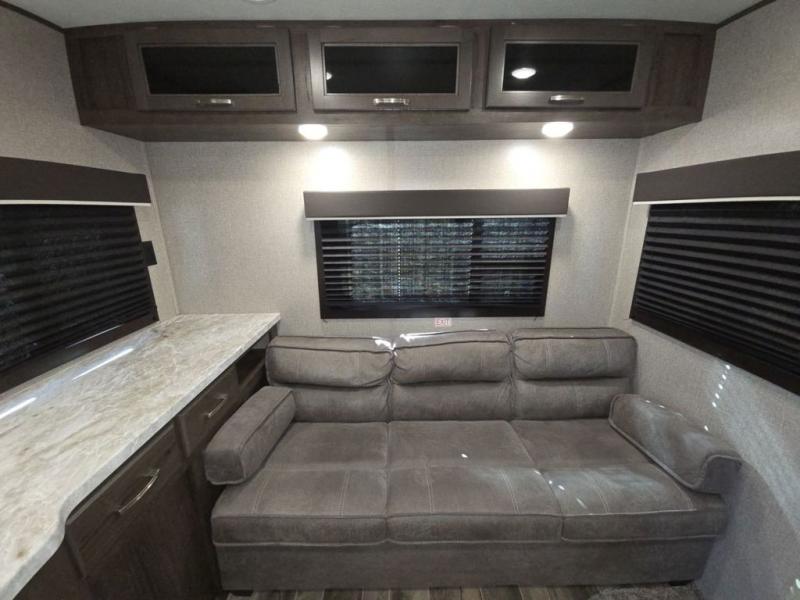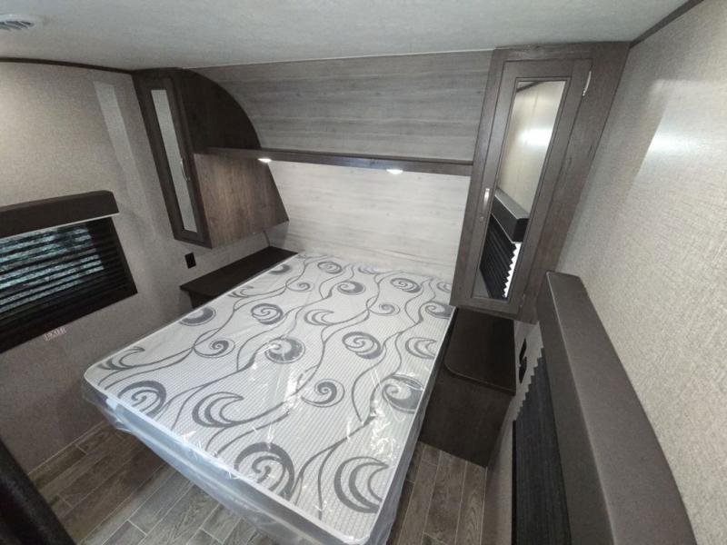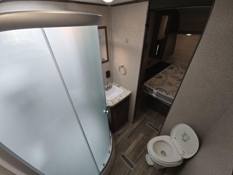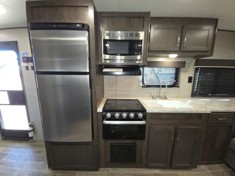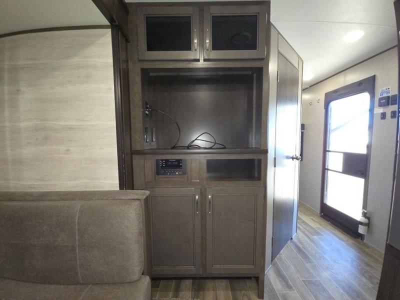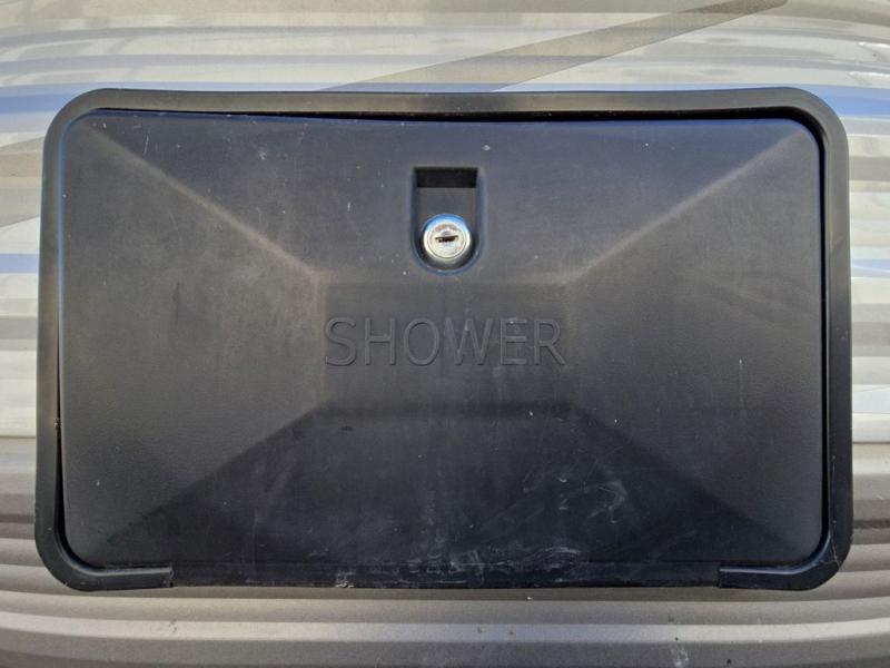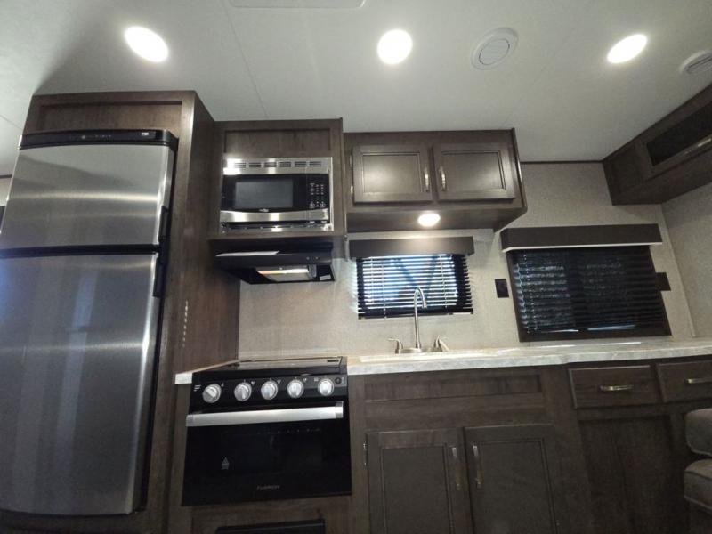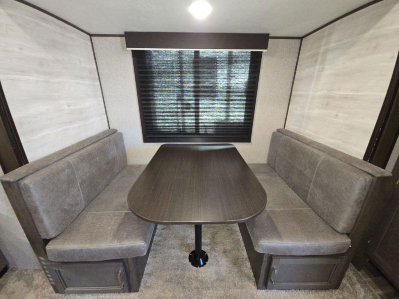 Come see just how fun and easy camping can be in this travel trailer! There is a front private bedroom with a queen bed that has wardrobes on either side of it and an entrance into the dual entry bathroom. The rear living area has a large sofa and is right next to the ample counter space with the double sink and three burner range with glass top to create your best home cooked meals. The booth dinette slide helps to open up the living area for more walking around space. The exterior has many convenient features like the outside shower and the pass-through storage area, plus you can choose to add the optional Chil N' Stor feature to enjoy a cold drink without having to run inside for one!