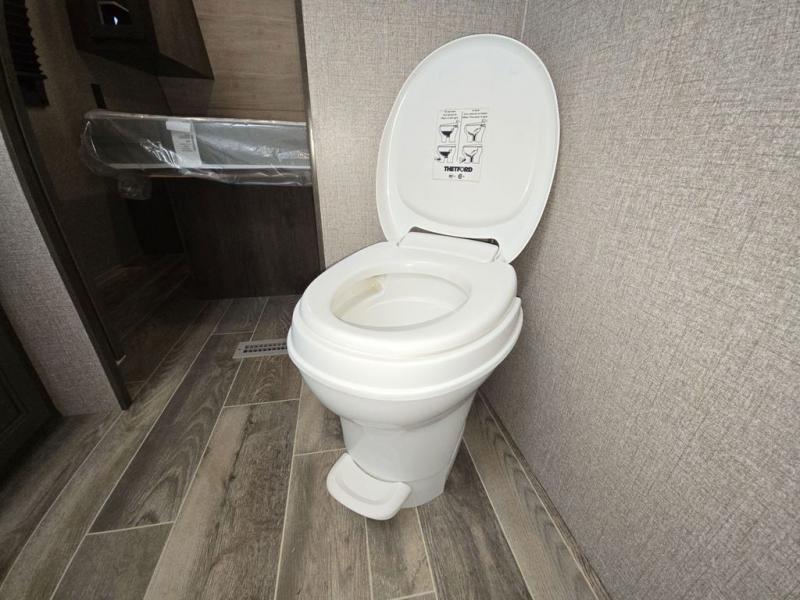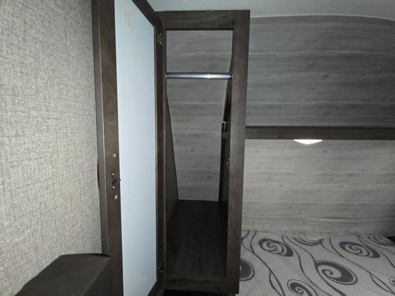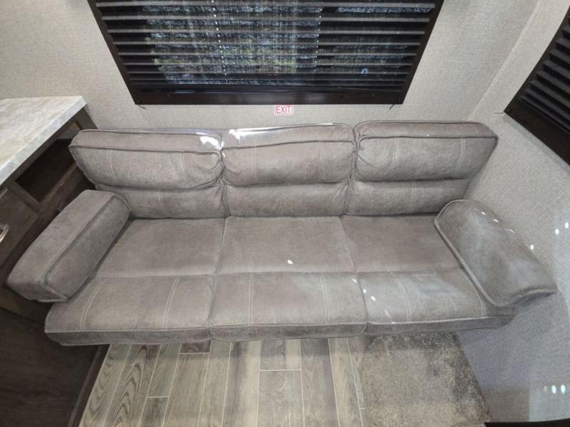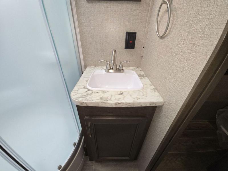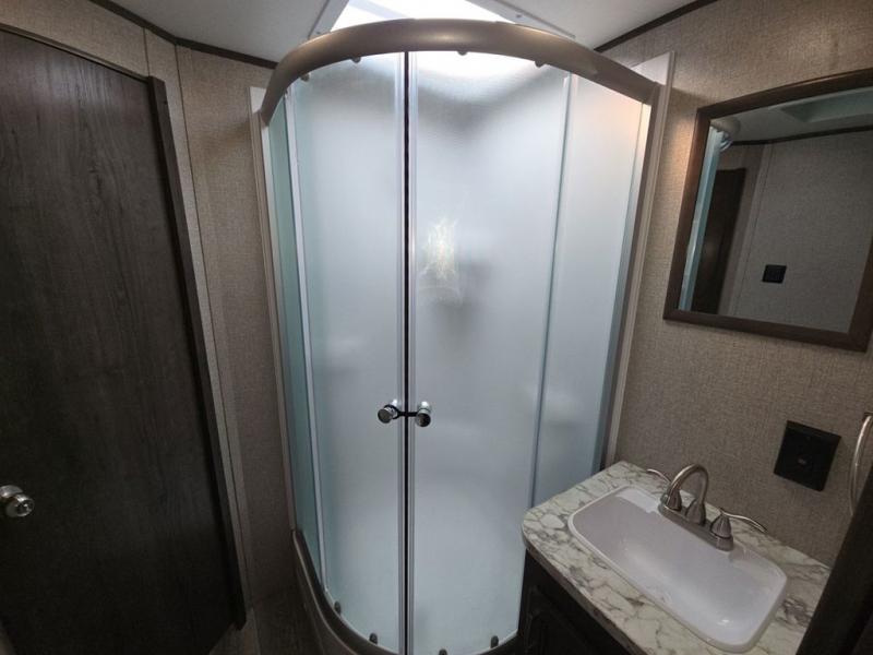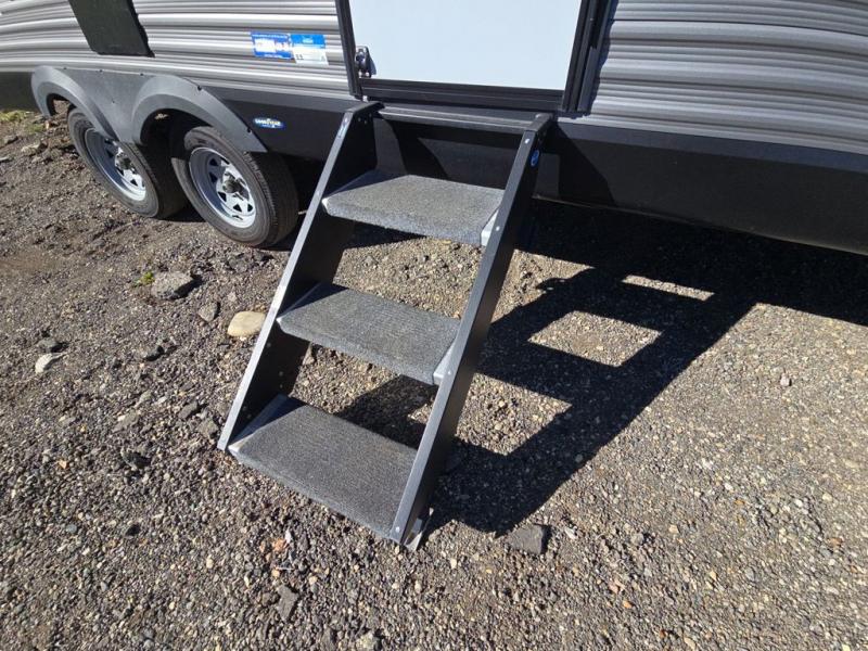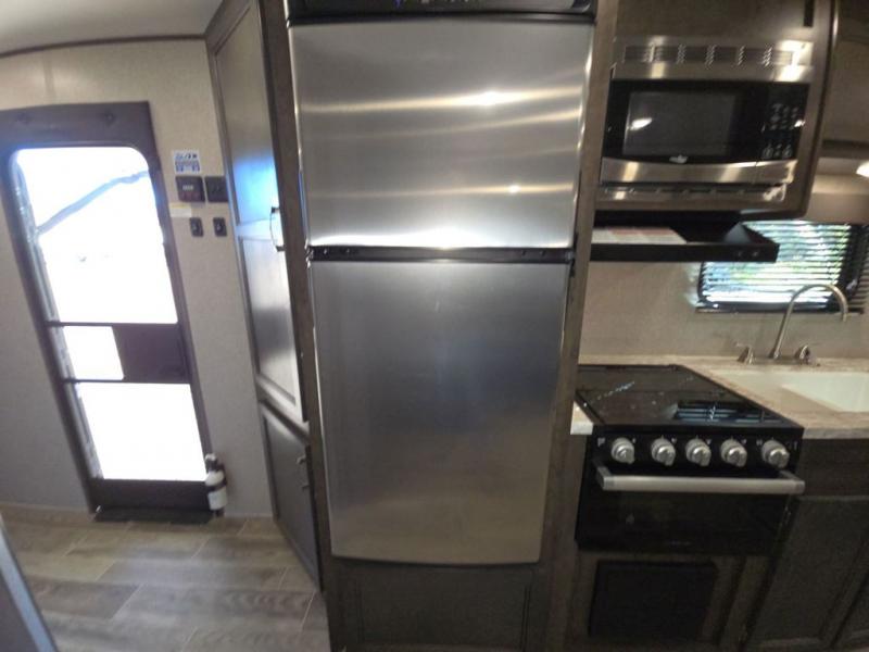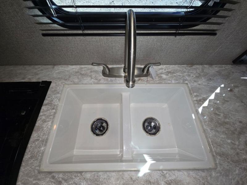 Come see just how fun and easy camping can be in this travel trailer! There is a front private bedroom with a queen bed that has wardrobes on either side of it and an entrance into the dual entry bathroom. The rear living area has a large sofa and is right next to the ample counter space with the double sink and three burner range with glass top to create your best home cooked meals. The booth dinette slide helps to open up the living area for more walking around space. The exterior has many convenient features like the outside shower and the pass-through storage area, plus you can choose to add the optional Chil N' Stor feature to enjoy a cold drink without having to run inside for one!