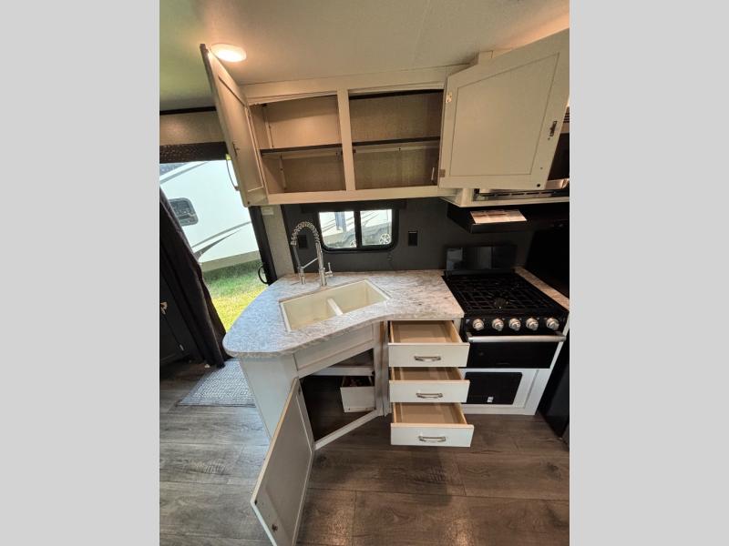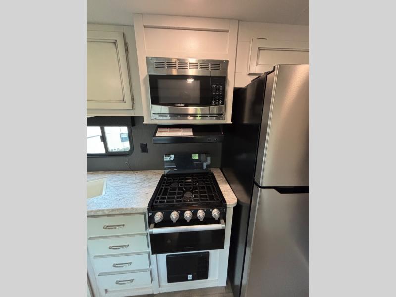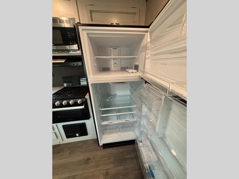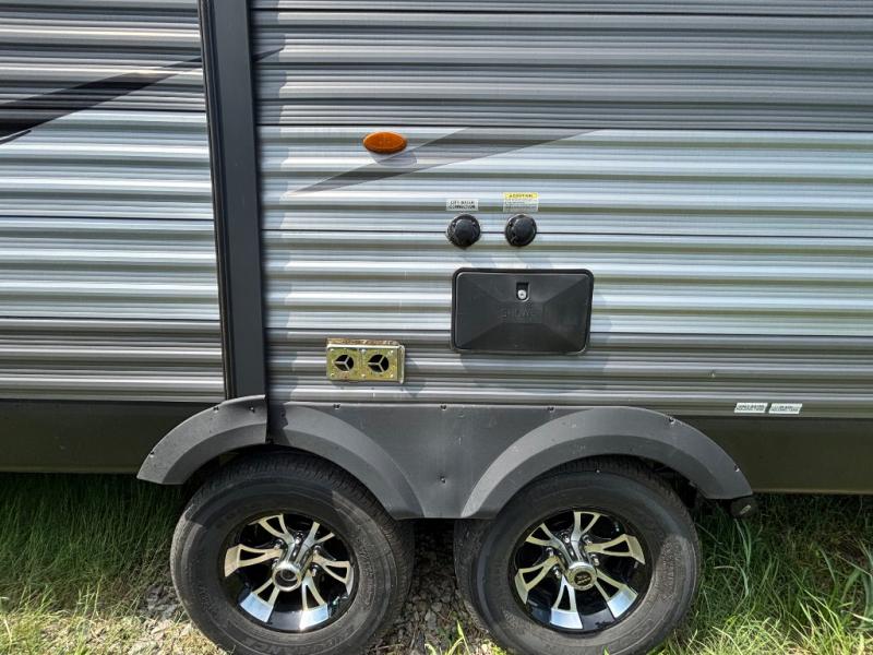 Having this Jay Flight travel trailer is going to be a blast! This residential trailer provides you with two private bedrooms, a patio door as one of the two entries, an 18 cubic foot residential refrigerator in the open kitchen, and a queen-size Serta mattress. The walk-through bathroom can be accessed from either side making it easy to discreetly shower in the morning from the rear bedroom, and this trailer also provides you with several optional sleeping configurations. The large slide in the main living area gives you room to sit back on the U-shaped dinette and jackknife sofa without being in the way of foot traffic, and there is an entertainment center across from the dinette and sofa for easy viewing.