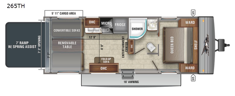 Durable “built for life” construction – Like all Jayco Jay Flight SLX 8 models, the 265TH comes with the proven structural standards: a fully-integrated A-frame chassis, cambered I-Class structural steel I-beams, galvanized impact-resistant wheel wells, 5/8" tongue-and-groove plywood floor decking, and the “Magnum Truss” roof system with seamless DiFlex II roofing material — which results in a roof that’s significantly stronger than many competitors.