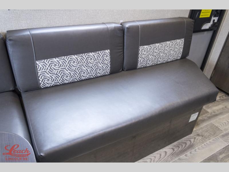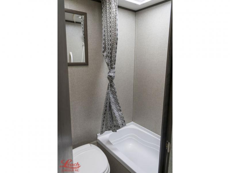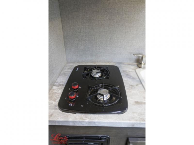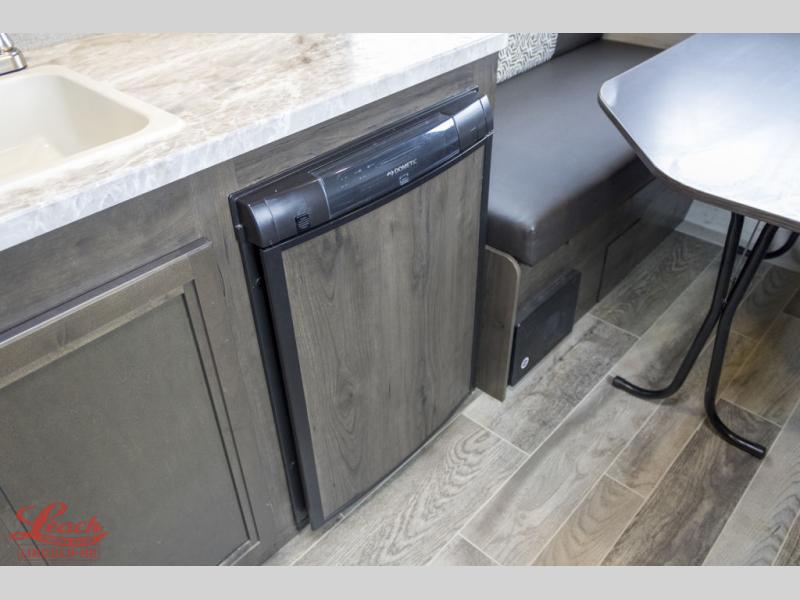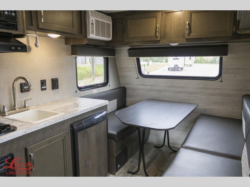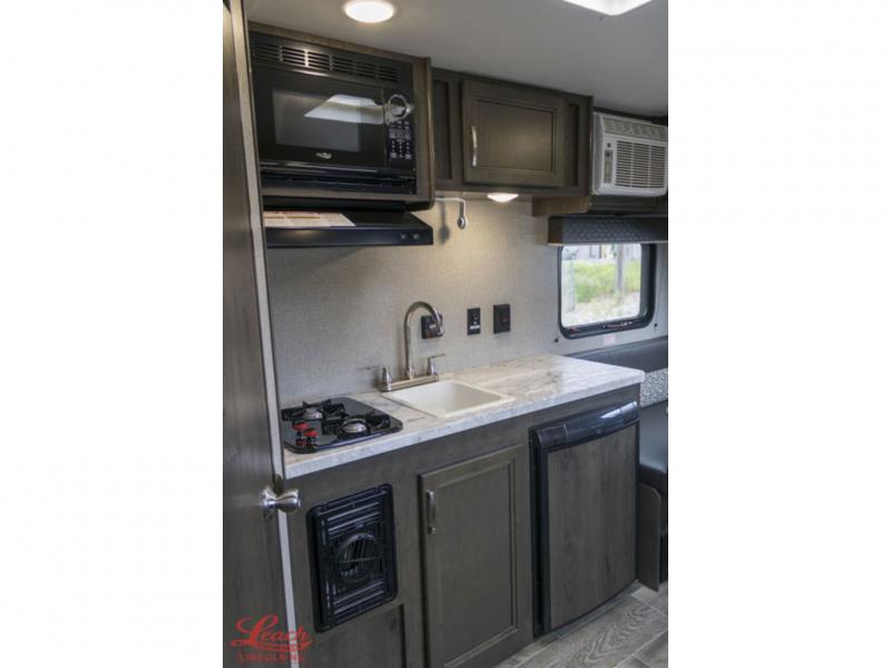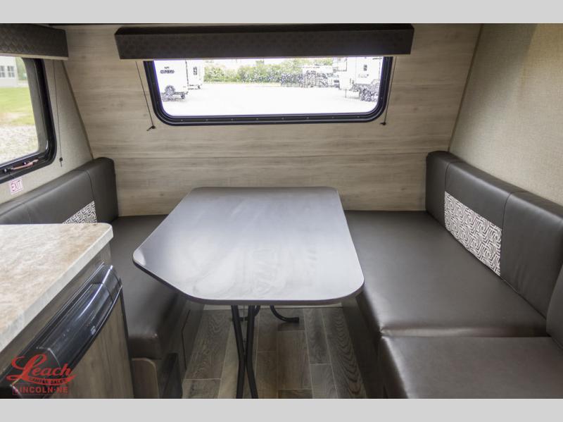 This is the perfect couple's trailer for your trip to the lake. Once you arrive at your destination, prepare a quick meal on the two burner cooktop. After you've hiked a trail or two, get cleaned up in the private tub/shower room that also includes the toilet for convenience. Stretch out on the sofa or play a game of cards at the booth dinette, and when you're ready for bed you can convert this area to comfortable sleeping space. This model also includes a wardrobe to hang your clothes, plus overhead compartments to store your special belongings.