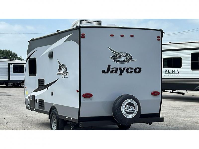 You can't go wrong with a Jay Flight SLX 7 travel trailer by Jayco. These lightweight 7'-wide models feature a fully integrated A-frame, stabilizer jacks with two sand pads, plus a Magnum Truss roof system with seamless DiFlex II material for a strong, sturdy unit made to last. Each model includes brushed nickel faucets, pleated window shades, a bath skylight, plus a premium multimedia sound system with MP3/iPod input jacks and Bluetooth connectivity for your entertainment needs. These travel trailers also include Goodyear Endurance tires that are made in the USA, a front diamond plate, and a power awning with LED lights that will create an outdoor living space you are sure to love!
