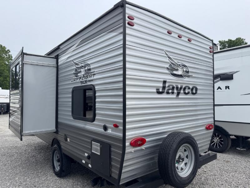 You can't go wrong with a Jay Flight SLX 7 travel trailer by Jayco. These lightweight 7'-wide models feature a fully integrated A-frame, stabilizer jacks with two sand pads, plus a Magnum Truss roof system with seamless DiFlex II material for a strong, sturdy unit made to last. Each model includes brushed nickel faucets, pleated window shades, a bath skylight, plus a premium multimedia sound system with MP3/iPod input jacks and Bluetooth connectivity for your entertainment needs. These travel trailers also include Goodyear Endurance tires that are made in the USA, a front diamond plate, and a power awning with LED lights that will create an outdoor living space you are sure to love!