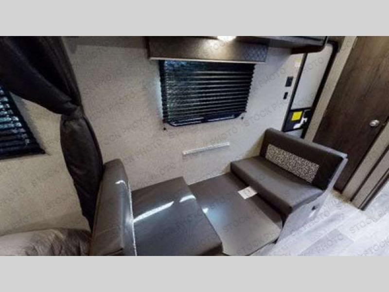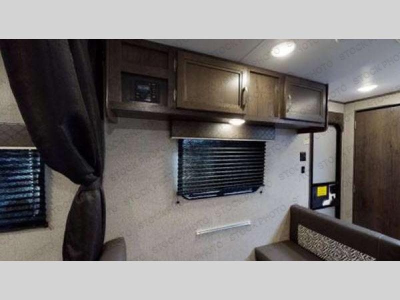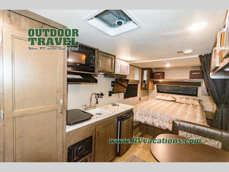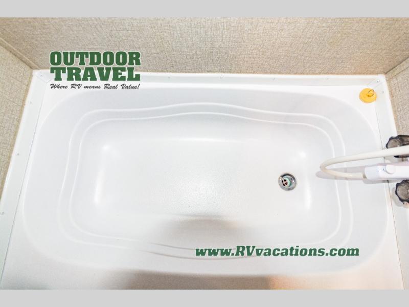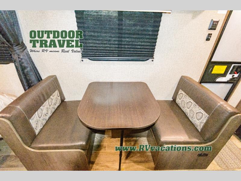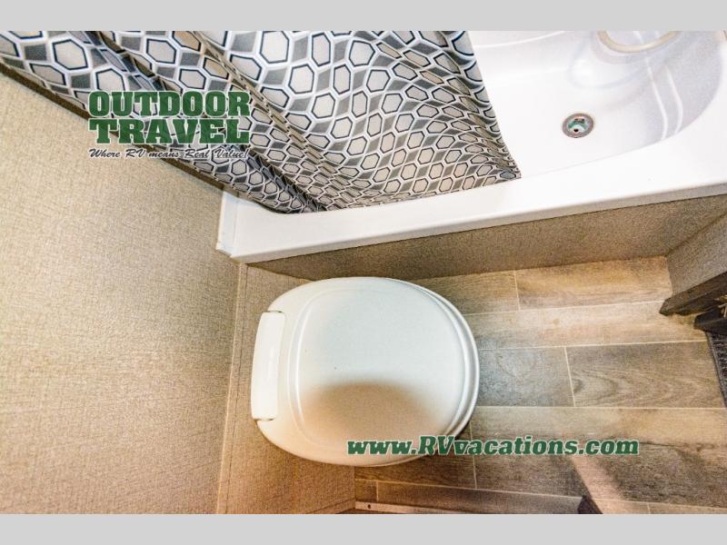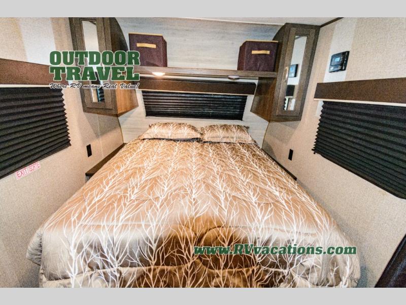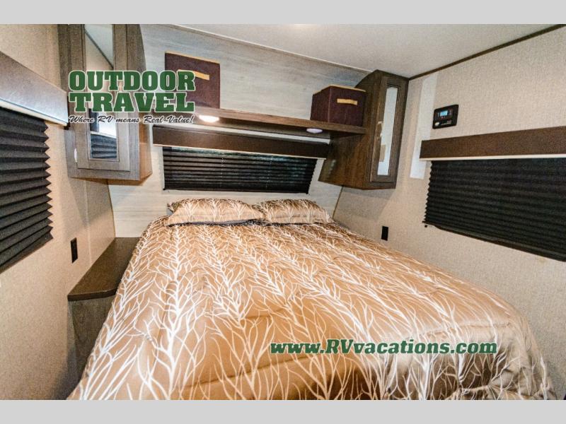 You will love waking up each morning on the walk-around RV queen bed in this Jay Flight SLX 7 travel trailer. The privacy curtain will create a semi-private bedroom so that you can get dressed discretely. Once you've made breakfast on the two-burner cooktop, get freshened up in the private bathroom before heading out to find a trail. When you return, you can hang your jacket in the large entryway wardrobe and grab the cards to play a game at the booth dinette. This model also includes a pantry for snacks, overhead compartments for your belongings, plus outside storage for charcoal and tackle boxes!