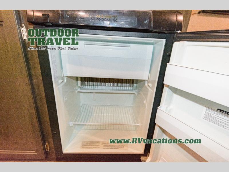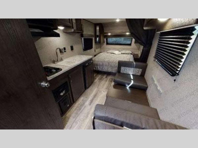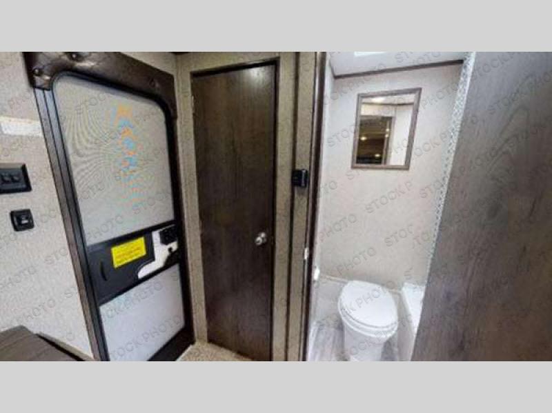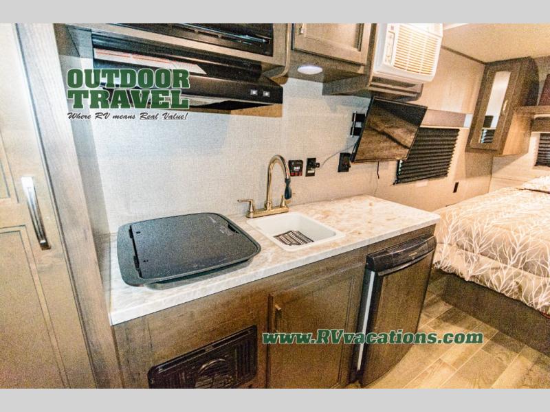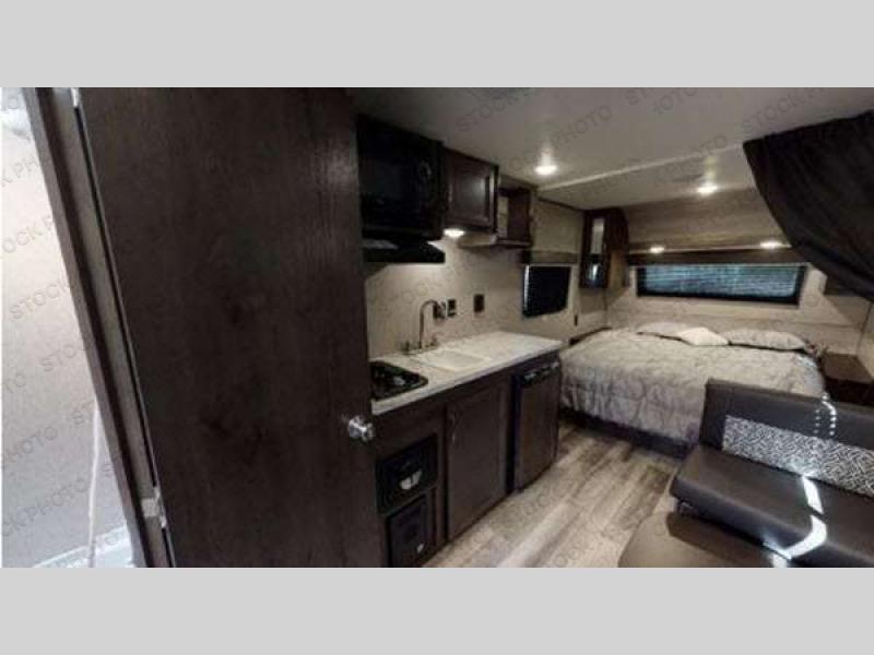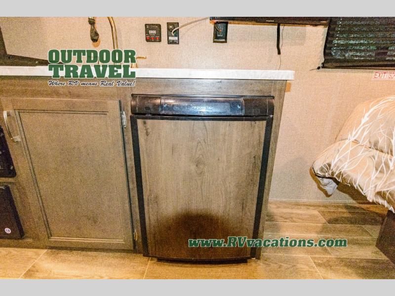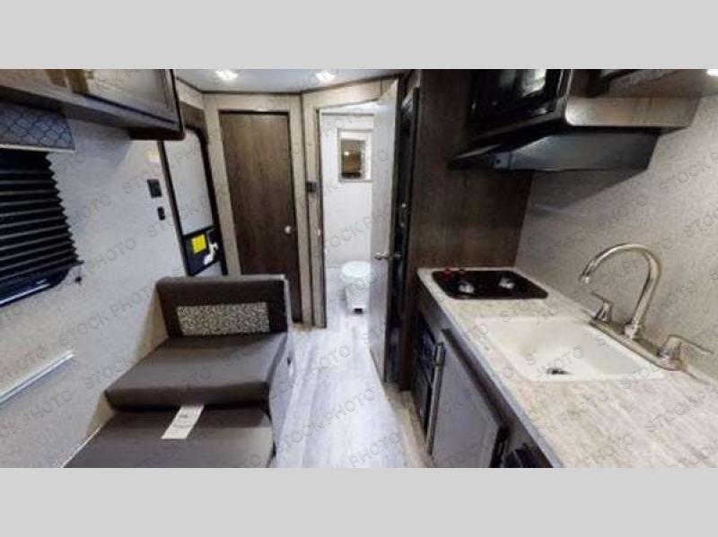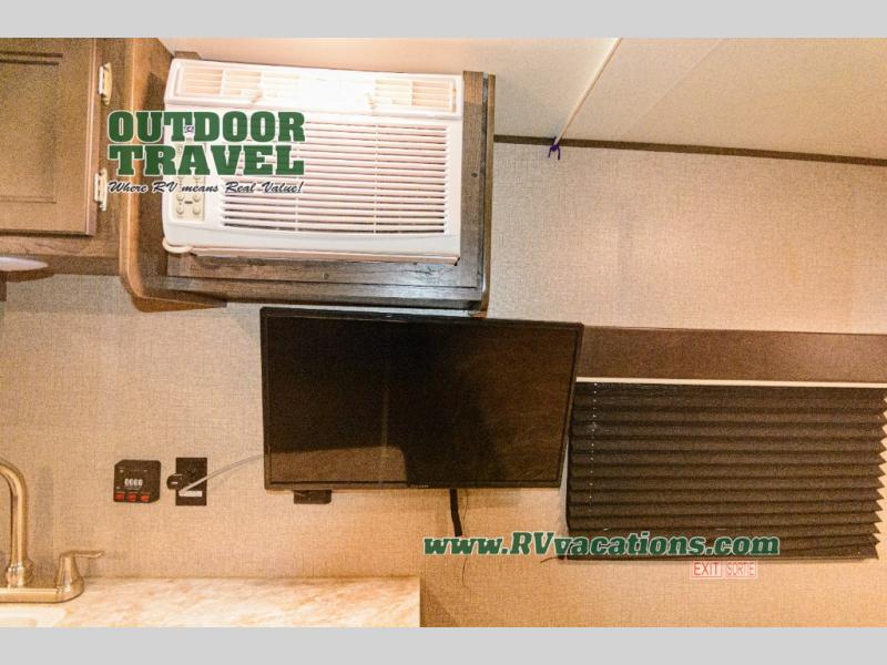 You will love waking up each morning on the walk-around RV queen bed in this Jay Flight SLX 7 travel trailer. The privacy curtain will create a semi-private bedroom so that you can get dressed discretely. Once you've made breakfast on the two-burner cooktop, get freshened up in the private bathroom before heading out to find a trail. When you return, you can hang your jacket in the large entryway wardrobe and grab the cards to play a game at the booth dinette. This model also includes a pantry for snacks, overhead compartments for your belongings, plus outside storage for charcoal and tackle boxes!