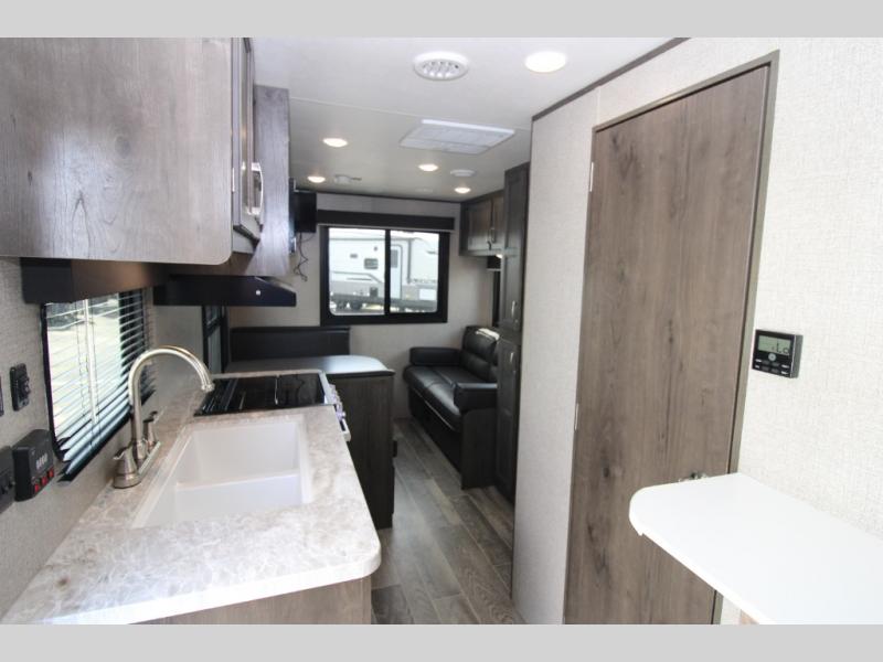 If you and your spouse wish to escape the hustle and bustle of everyday life then you need this travel trailer! You can create delicious home cooked meals with the three burner range with glass cover, and enjoy eating them comfortably at the booth dinette. The dinette and sofa can also double as extra sleeping spaces for a few to tag along and join in on the fun. Start each morning feeling refreshed and clean after sleeping on the front island queen bed and taking a nice, hot shower in the tub/shower which also has skylight above it for you to have natural lighting as you get ready!