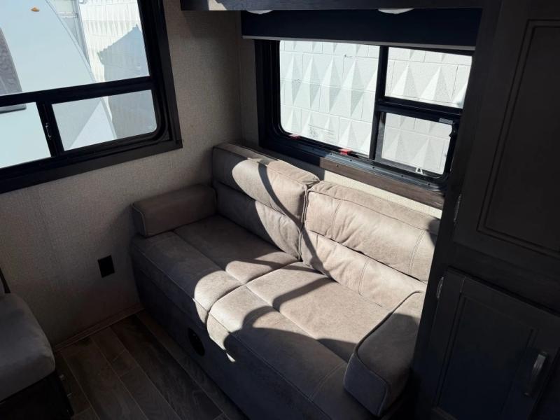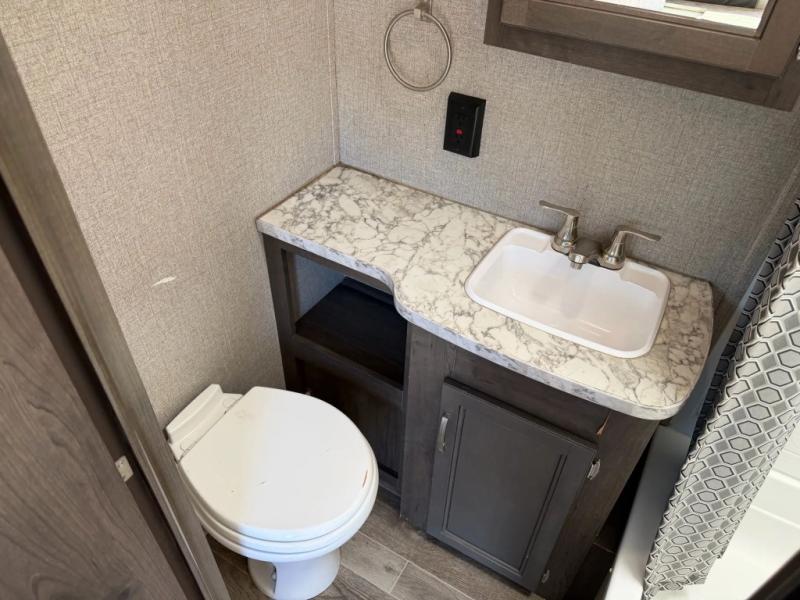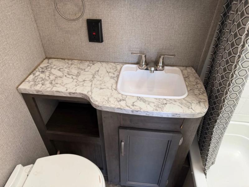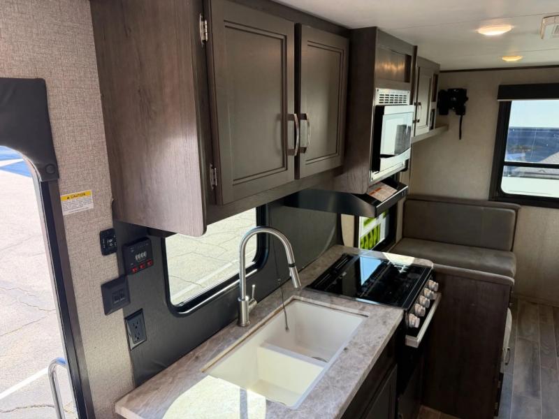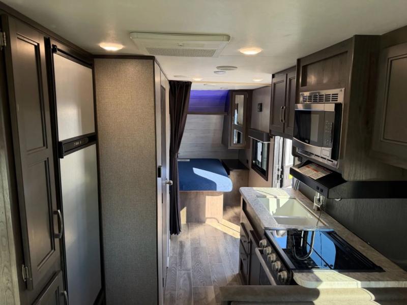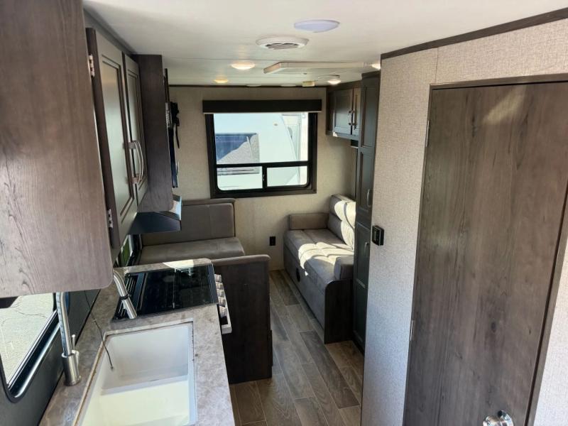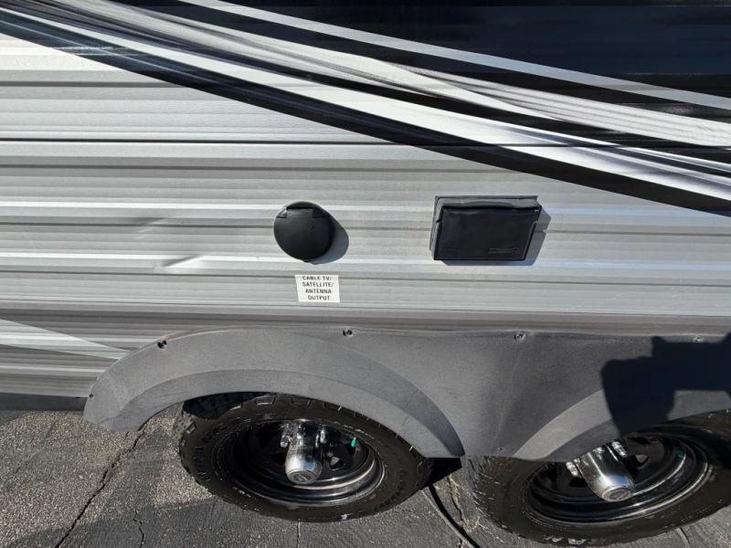If you and your spouse wish to escape the hustle and bustle of everyday life then you need this travel trailer! You can create delicious home cooked meals with the three burner range with glass cover, and enjoy eating them comfortably at the booth dinette. The dinette and sofa can also double as extra sleeping spaces for a few to tag along and join in on the fun. Start each morning feeling refreshed and clean after sleeping on the front island queen bed and taking a nice, hot shower in the tub/shower which also has skylight above it for you to have natural lighting as you get ready!