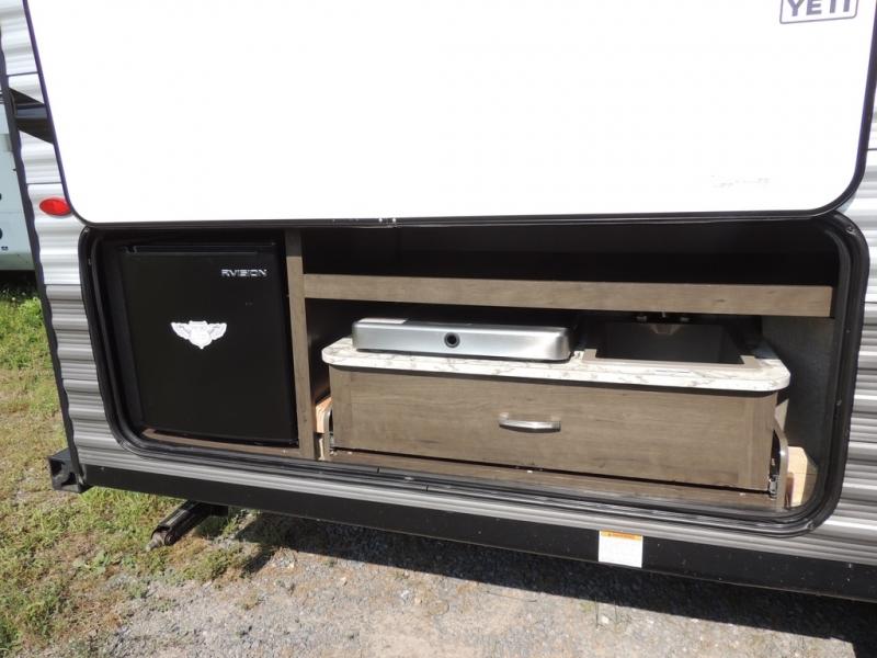 Don't go on another camping trip without taking this travel trailer! There is an island queen bed up front with wardrobes on either side to keep your clothes looking nice and a privacy curtain to draw at night. The kids will enjoy sleeping on the rear double bunk beds and they can even bring a friend along too, just convert the booth dinette into a sleeping space for them. The spacious rear corner bathroom comes with a large shower for you to enjoy a nice, hot shower every morning. If you don't feel like cooking dinner indoors then head to the outside kitchen to breathe in some fresh air and watch the kids playing!