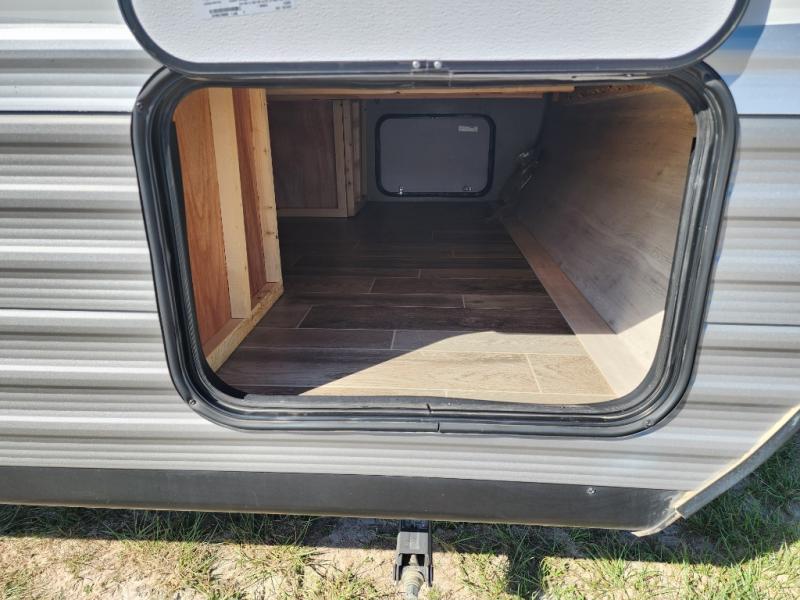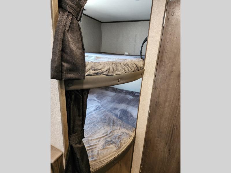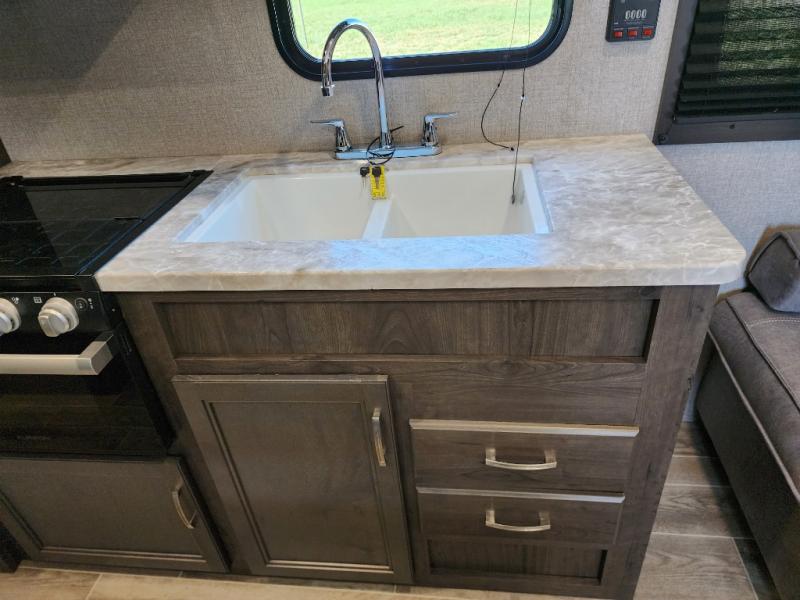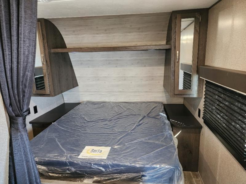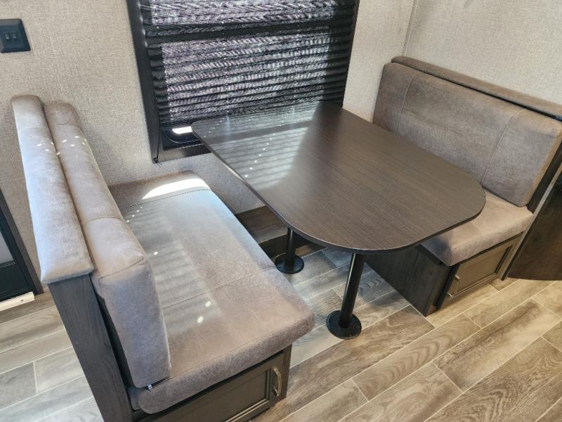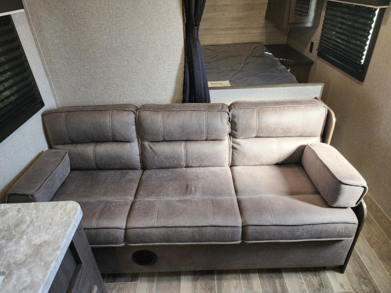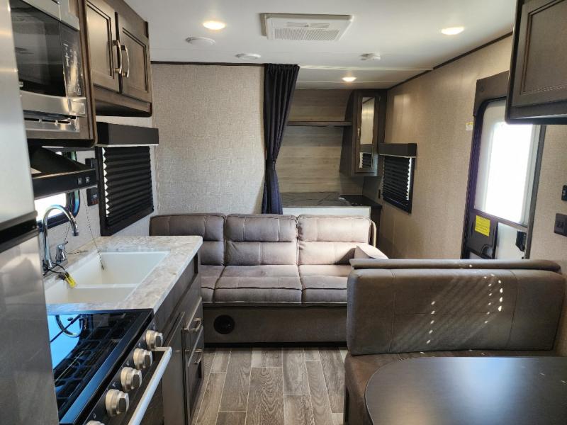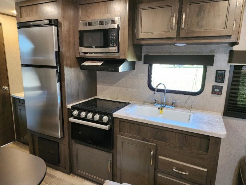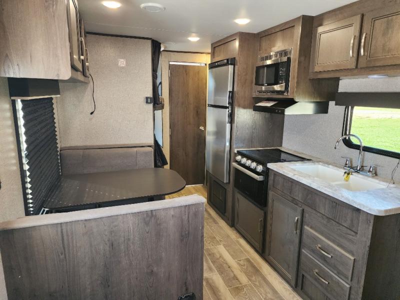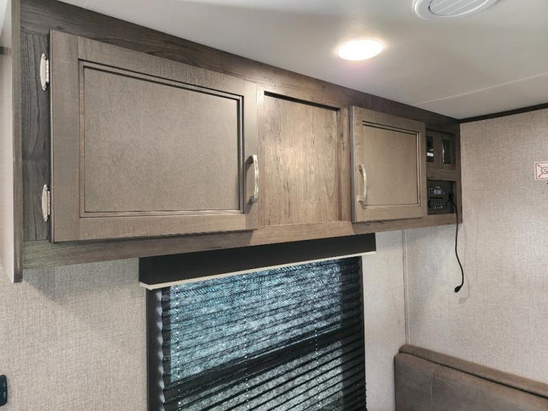 The whole family can head to the campground with this travel trailer! Everyone will start each day feeling re-charged and ready to go after sleeping on the rear corner double bunk beds and the front queen bed, plus the sofa and the booth dinette can also transform into extra sleeping spaces for any friends that want to tag along. The rear corner bathroom comes with a tub/shower that has a skylight above for natural lighting and a wood trimmed mirror to make you feel more at home. There is plenty of storage inside and out between the overhead cabinets, the wardrobes, and the exterior pass-through storage area. You can also add the optional Chil N' Stor feature to the exterior so that you can enjoy a nice, cold beverage without having to go inside to get one!