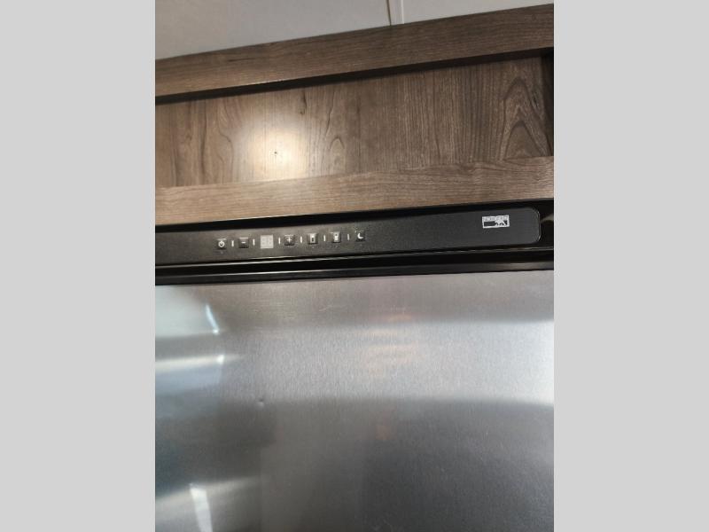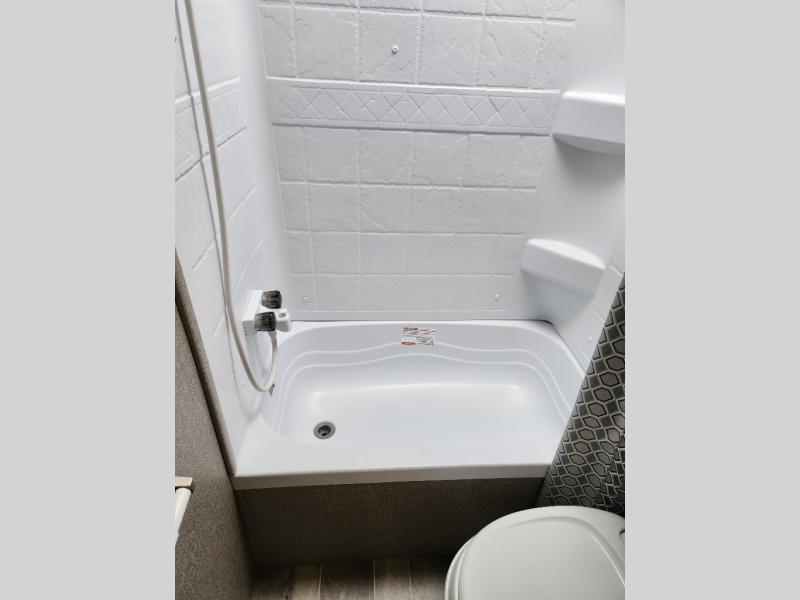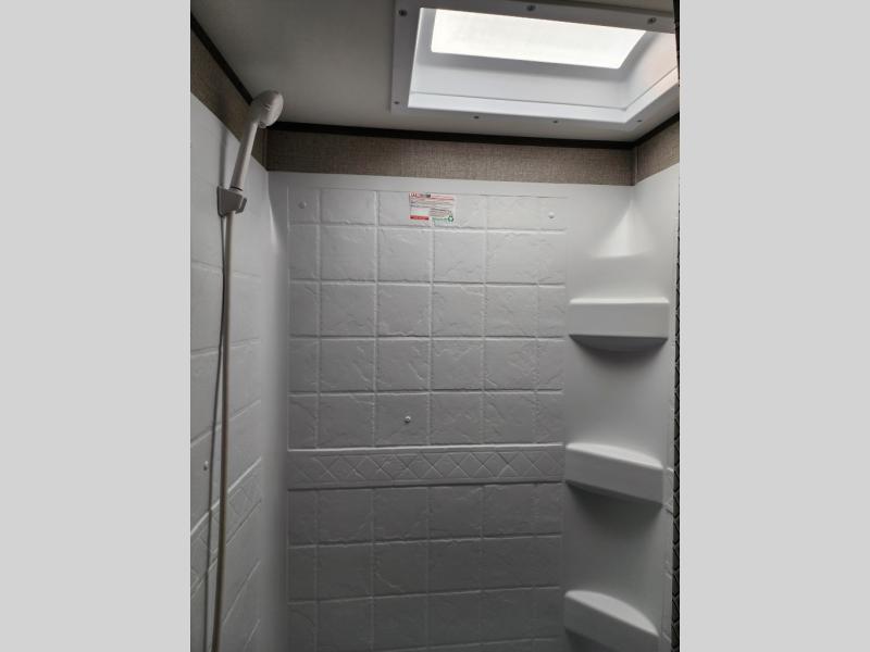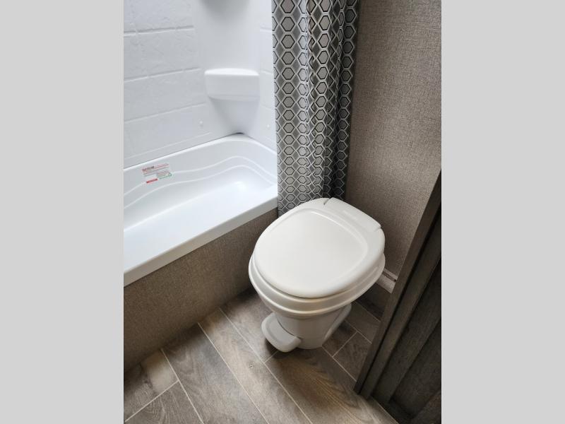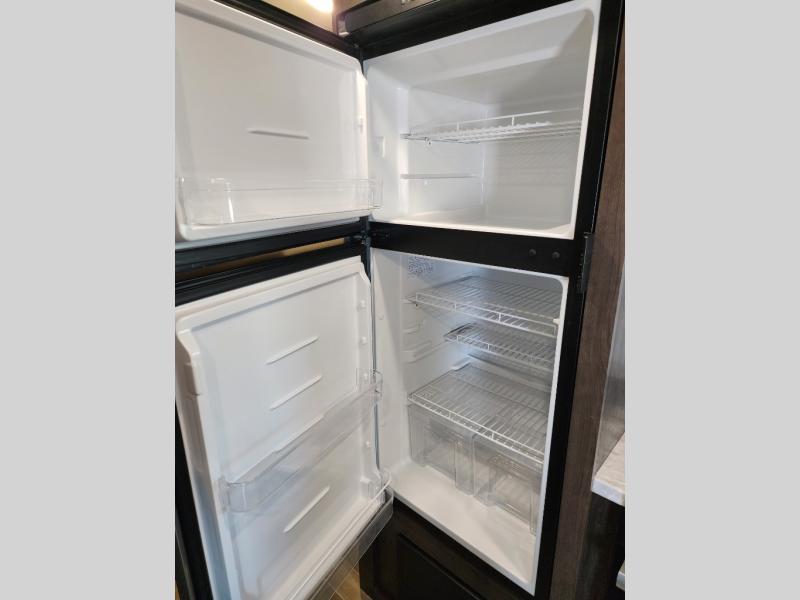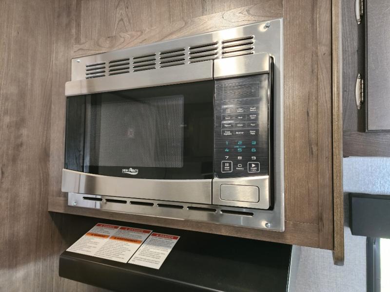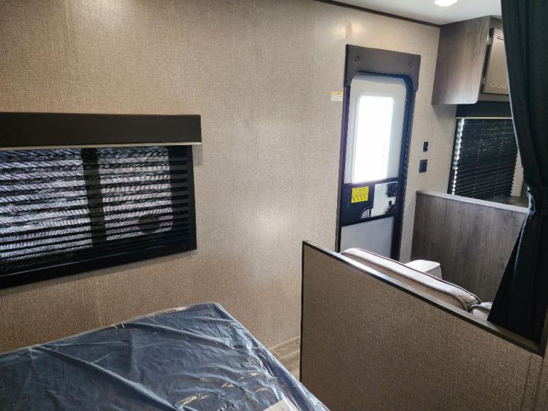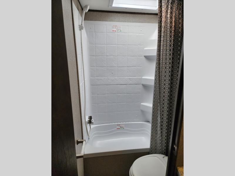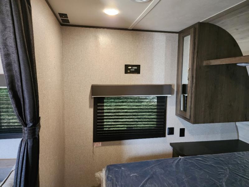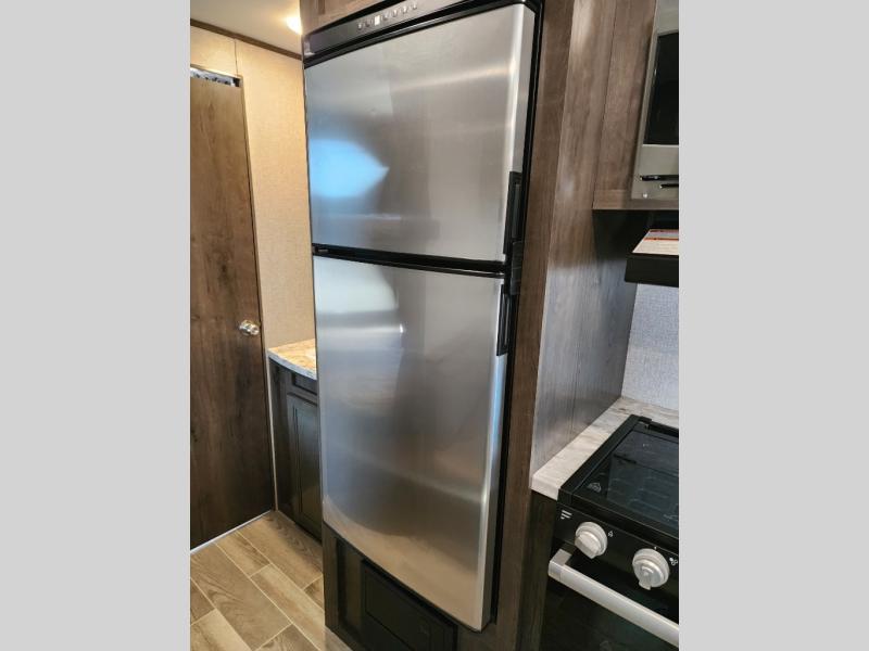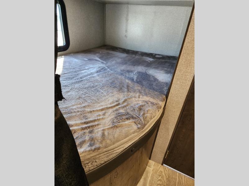 The whole family can head to the campground with this travel trailer! Everyone will start each day feeling re-charged and ready to go after sleeping on the rear corner double bunk beds and the front queen bed, plus the sofa and the booth dinette can also transform into extra sleeping spaces for any friends that want to tag along. The rear corner bathroom comes with a tub/shower that has a skylight above for natural lighting and a wood trimmed mirror to make you feel more at home. There is plenty of storage inside and out between the overhead cabinets, the wardrobes, and the exterior pass-through storage area. You can also add the optional Chil N' Stor feature to the exterior so that you can enjoy a nice, cold beverage without having to go inside to get one!
