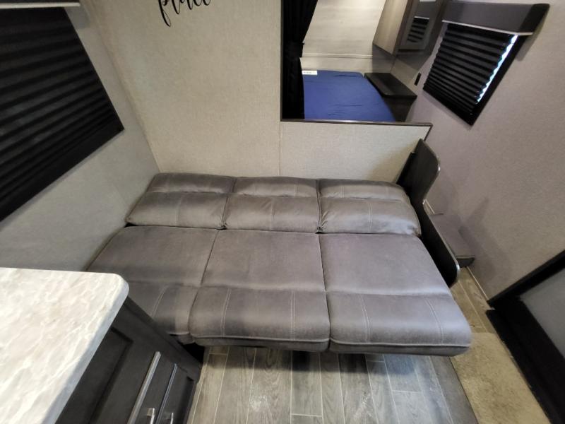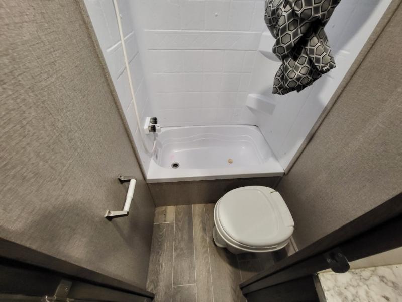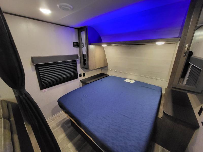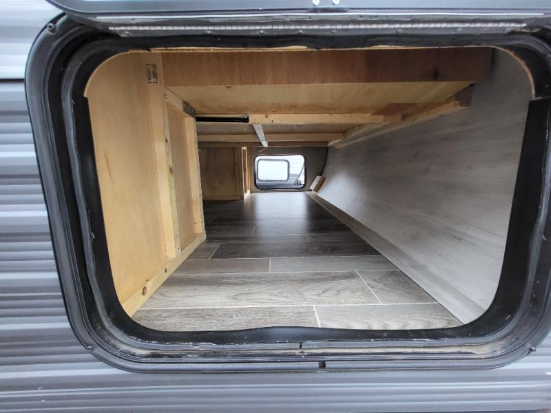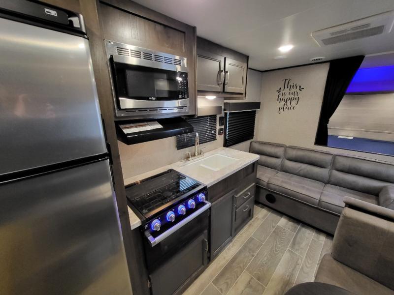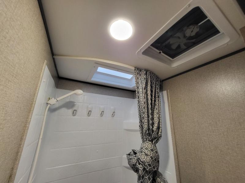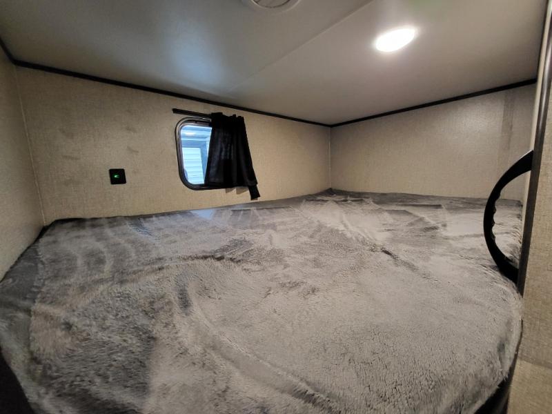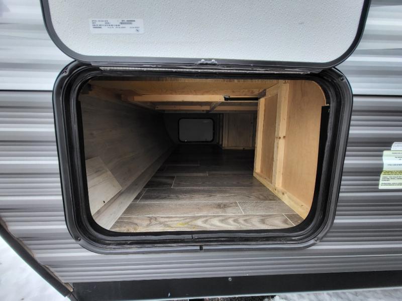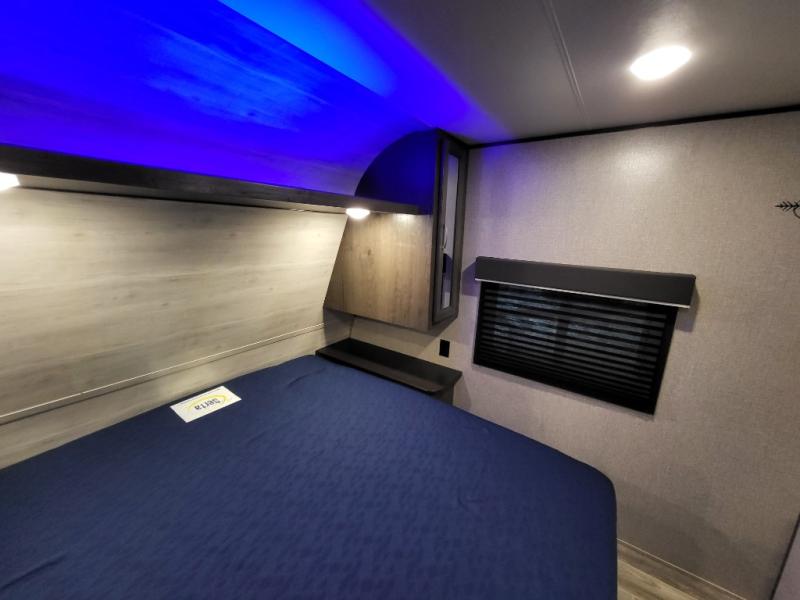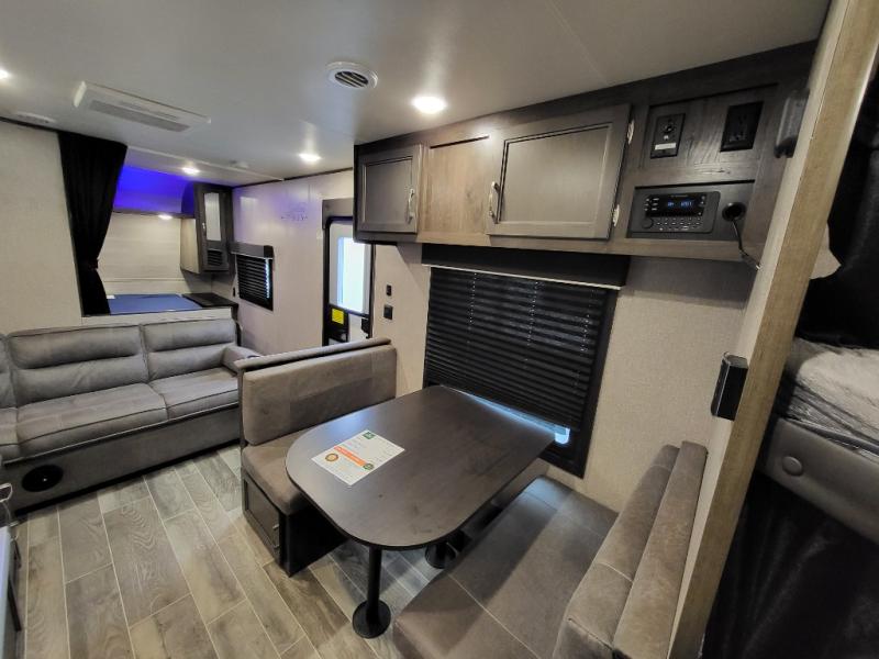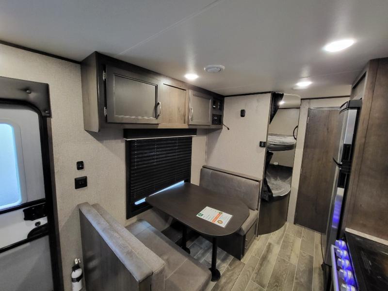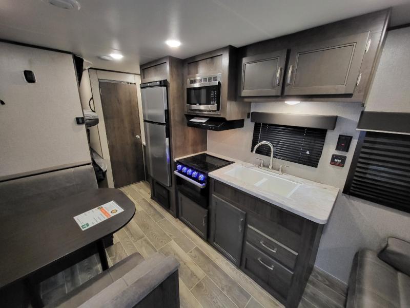 The whole family can head to the campground with this travel trailer! Everyone will start each day feeling re-charged and ready to go after sleeping on the rear corner double bunk beds and the front queen bed, plus the sofa and the booth dinette can also transform into extra sleeping spaces for any friends that want to tag along. The rear corner bathroom comes with a tub/shower that has a skylight above for natural lighting and a wood trimmed mirror to make you feel more at home. There is plenty of storage inside and out between the overhead cabinets, the wardrobes, and the exterior pass-through storage area. You can also add the optional Chil N' Stor feature to the exterior so that you can enjoy a nice, cold beverage without having to go inside to get one!