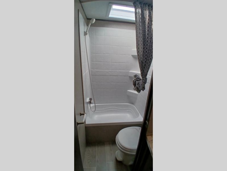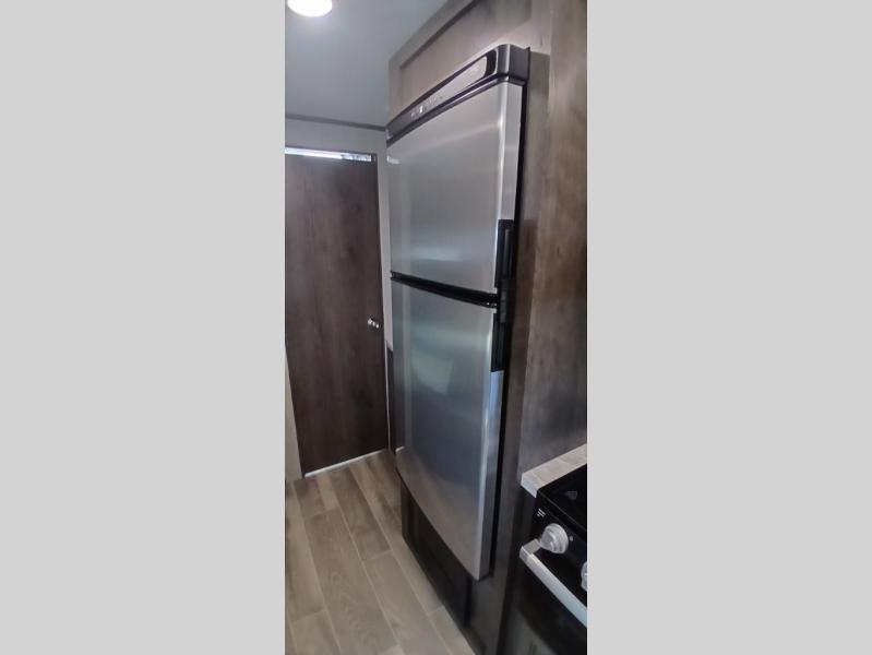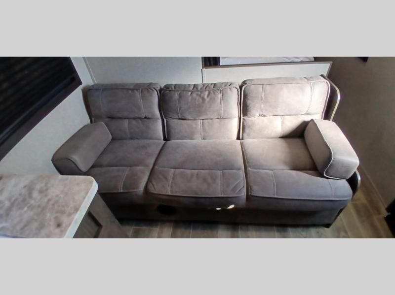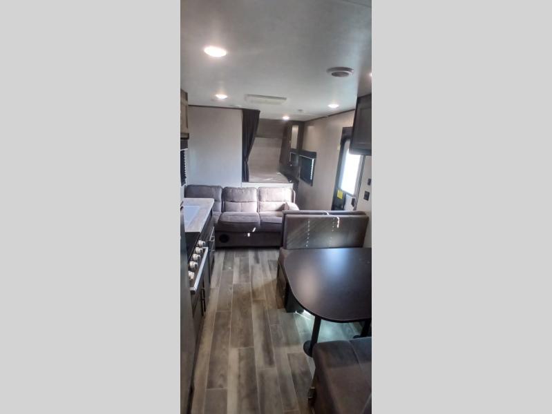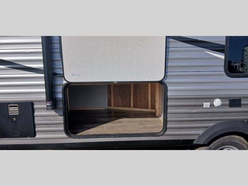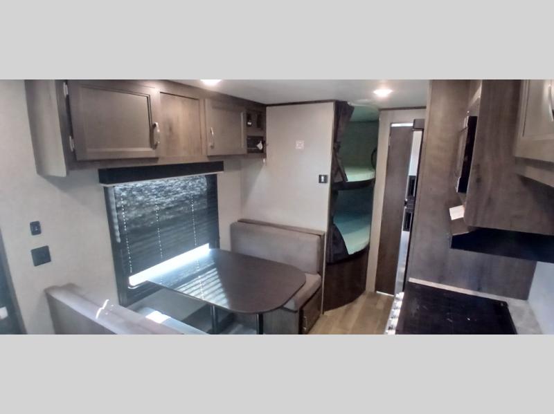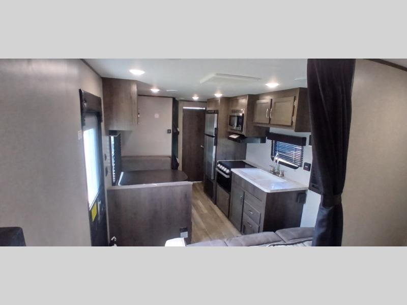 The whole family can head to the campground with this travel trailer! Everyone will start each day feeling re-charged and ready to go after sleeping on the rear corner double bunk beds and the front queen bed, plus the sofa and the booth dinette can also transform into extra sleeping spaces for any friends that want to tag along. The rear corner bathroom comes with a tub/shower that has a skylight above for natural lighting and a wood trimmed mirror to make you feel more at home. There is plenty of storage inside and out between the overhead cabinets, the wardrobes, and the exterior pass-through storage area. You can also add the optional Chil N' Stor feature to the exterior so that you can enjoy a nice, cold beverage without having to go inside to get one!