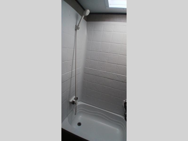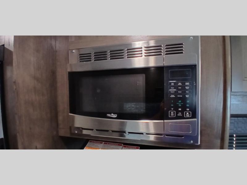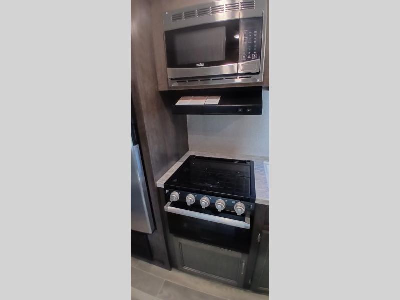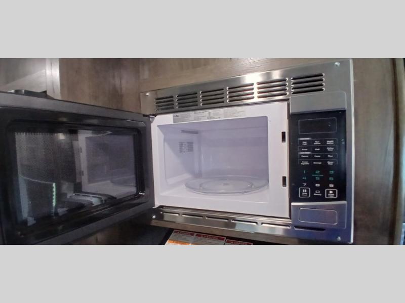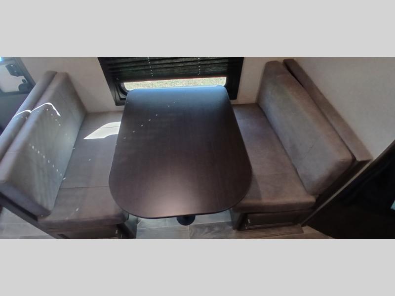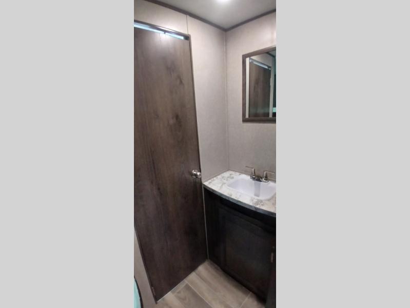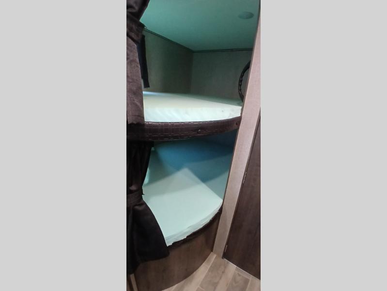 The whole family can head to the campground with this travel trailer! Everyone will start each day feeling re-charged and ready to go after sleeping on the rear corner double bunk beds and the front queen bed, plus the sofa and the booth dinette can also transform into extra sleeping spaces for any friends that want to tag along. The rear corner bathroom comes with a tub/shower that has a skylight above for natural lighting and a wood trimmed mirror to make you feel more at home. There is plenty of storage inside and out between the overhead cabinets, the wardrobes, and the exterior pass-through storage area. You can also add the optional Chil N' Stor feature to the exterior so that you can enjoy a nice, cold beverage without having to go inside to get one!
