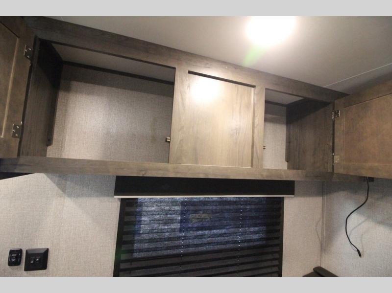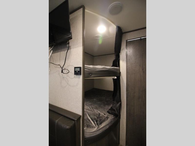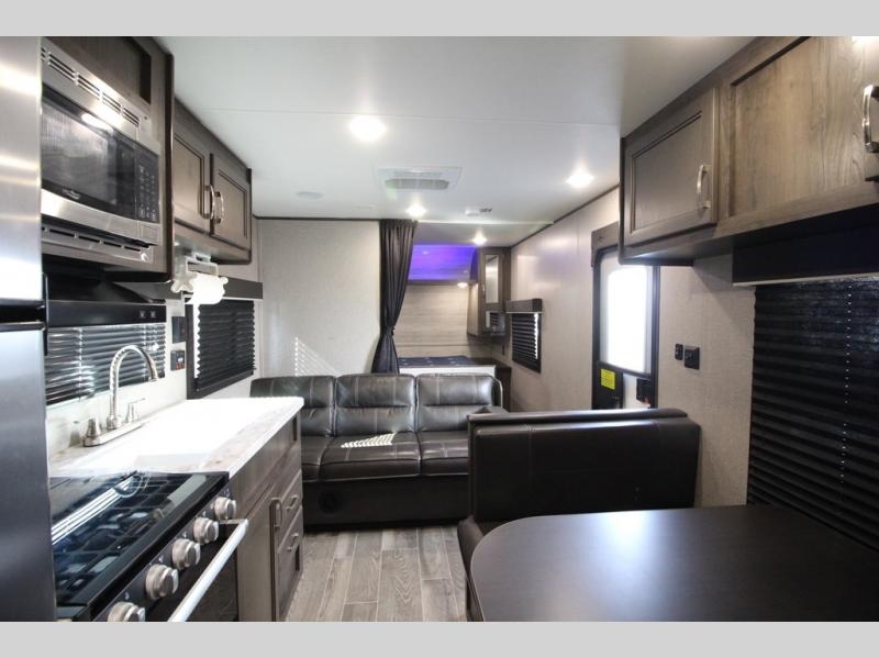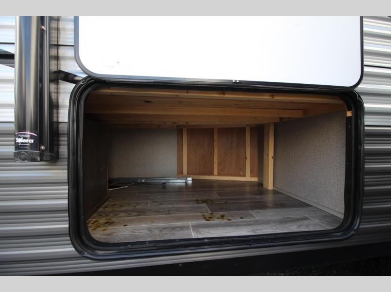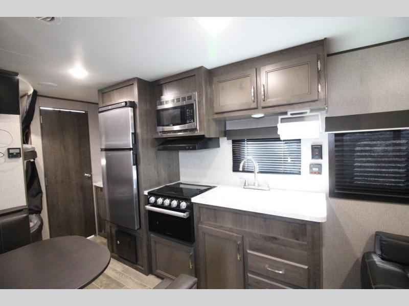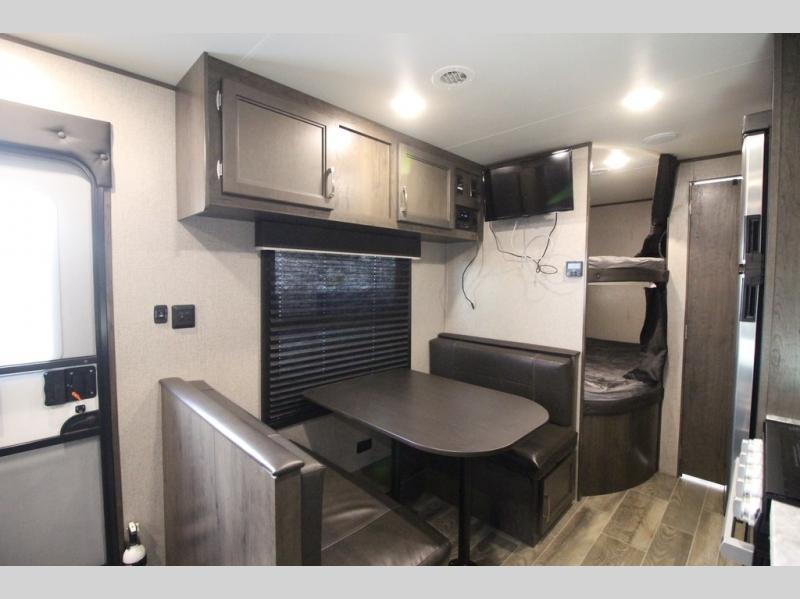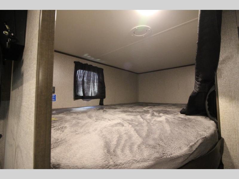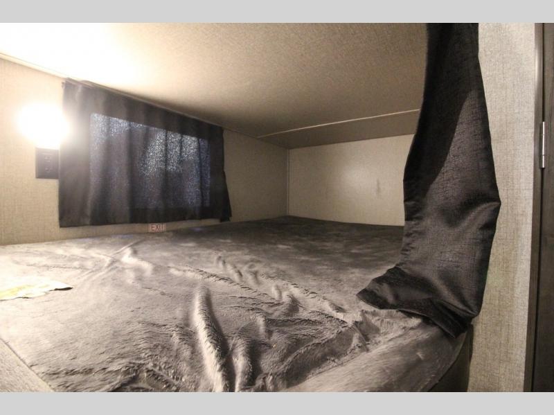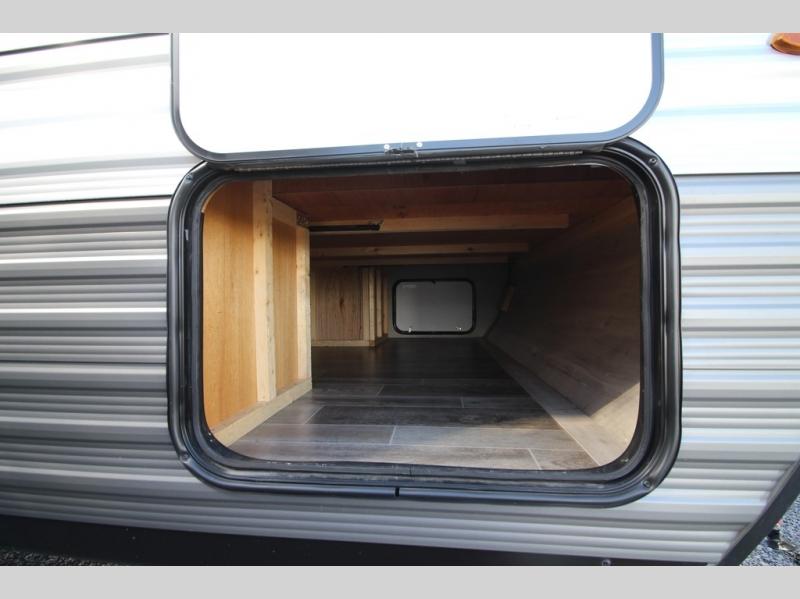 The whole family can head to the campground with this travel trailer! Everyone will start each day feeling re-charged and ready to go after sleeping on the rear corner double bunk beds and the front queen bed, plus the sofa and the booth dinette can also transform into extra sleeping spaces for any friends that want to tag along. The rear corner bathroom comes with a tub/shower that has a skylight above for natural lighting and a wood trimmed mirror to make you feel more at home. There is plenty of storage inside and out between the overhead cabinets, the wardrobes, and the exterior pass-through storage area. You can also add the optional Chil N' Stor feature to the exterior so that you can enjoy a nice, cold beverage without having to go inside to get one!