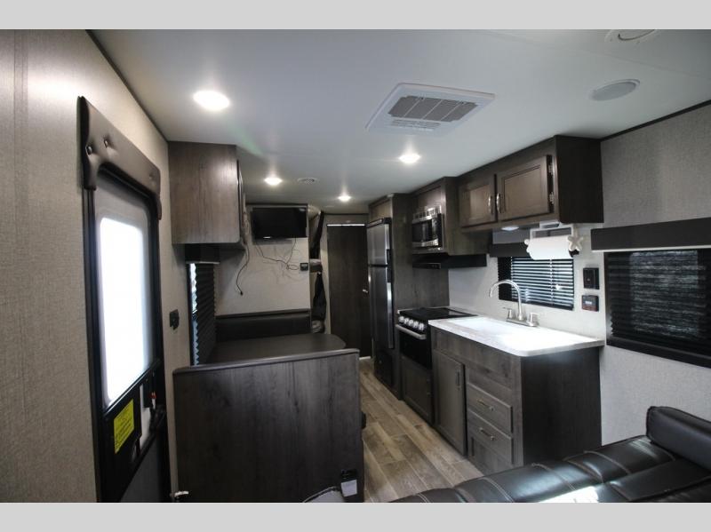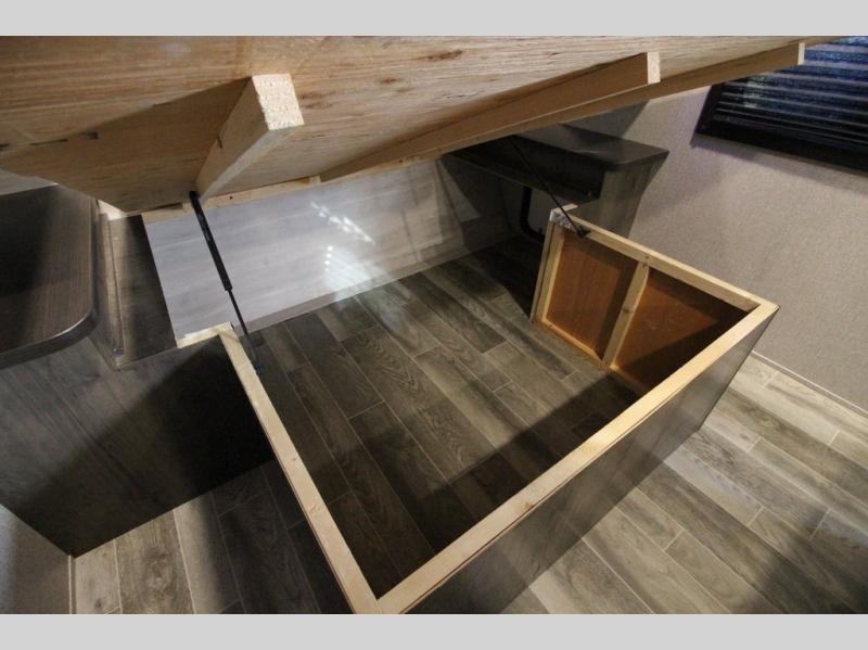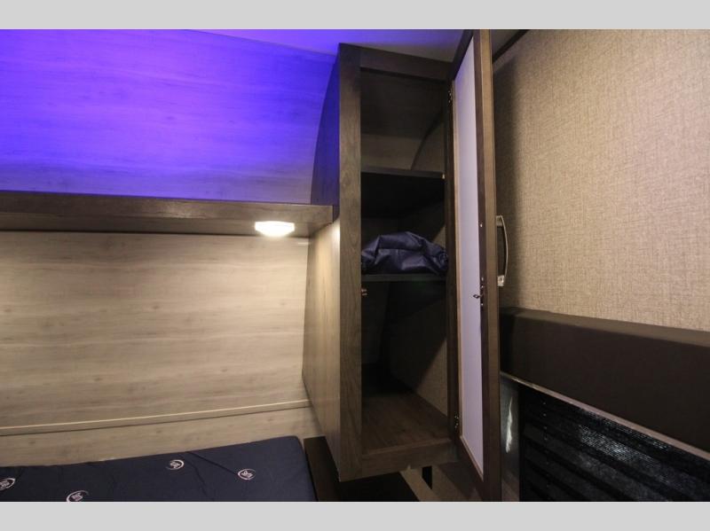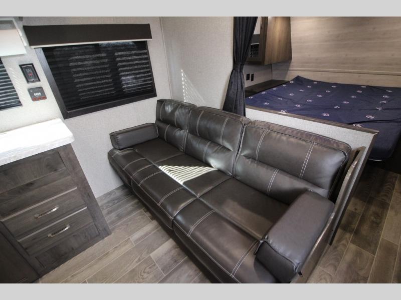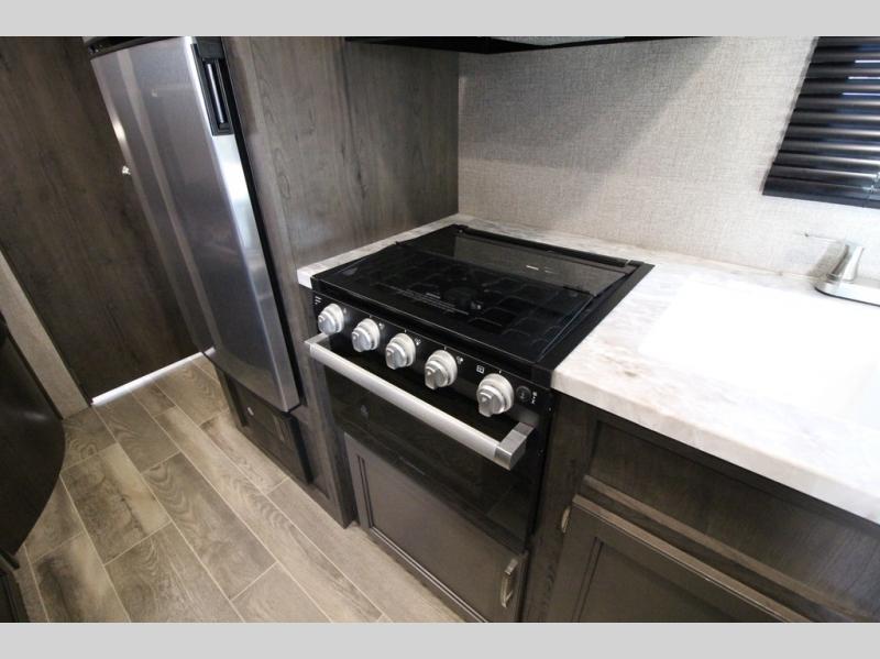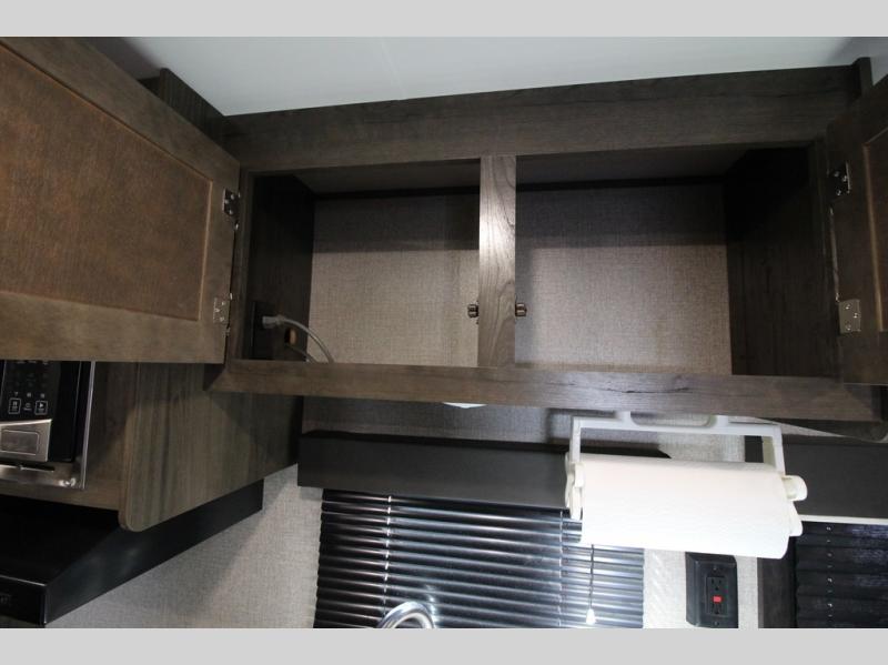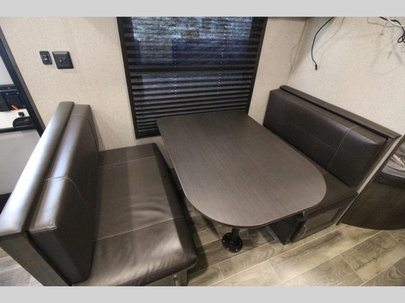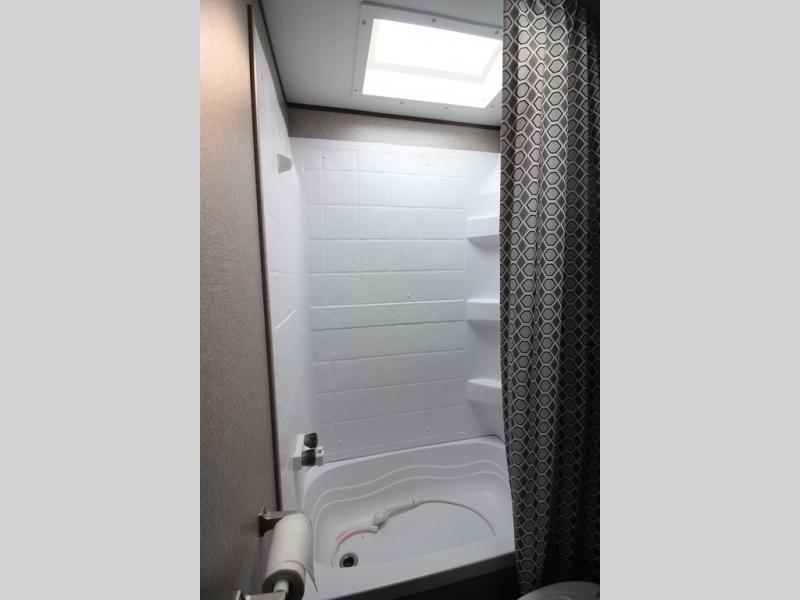 The whole family can head to the campground with this travel trailer! Everyone will start each day feeling re-charged and ready to go after sleeping on the rear corner double bunk beds and the front queen bed, plus the sofa and the booth dinette can also transform into extra sleeping spaces for any friends that want to tag along. The rear corner bathroom comes with a tub/shower that has a skylight above for natural lighting and a wood trimmed mirror to make you feel more at home. There is plenty of storage inside and out between the overhead cabinets, the wardrobes, and the exterior pass-through storage area. You can also add the optional Chil N' Stor feature to the exterior so that you can enjoy a nice, cold beverage without having to go inside to get one!