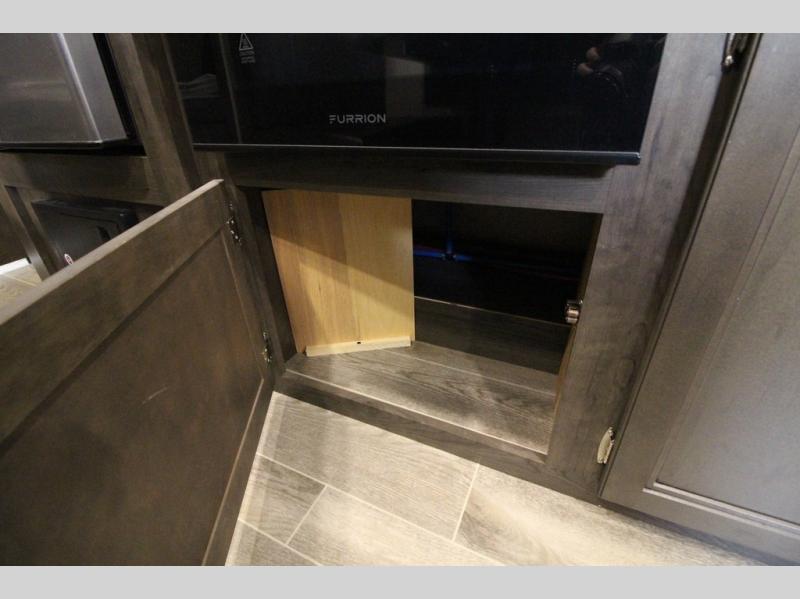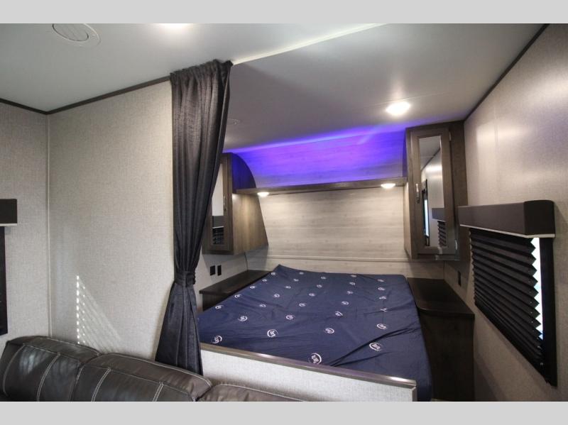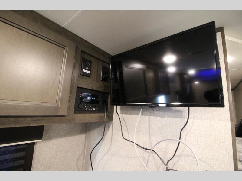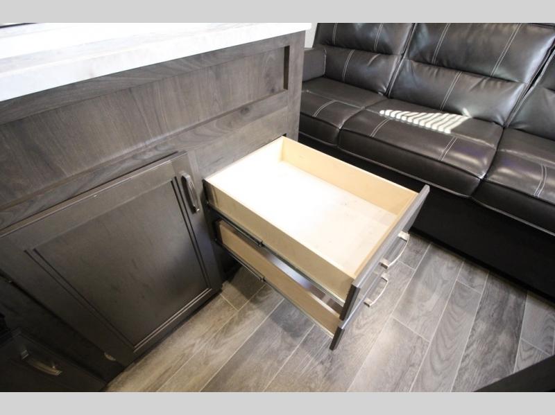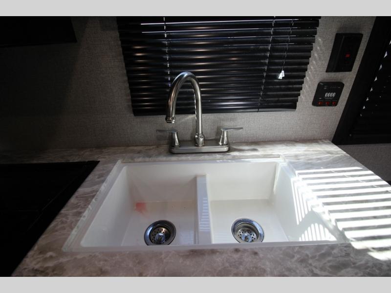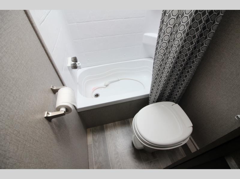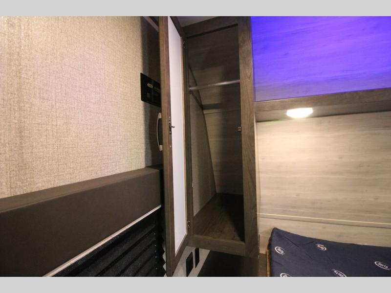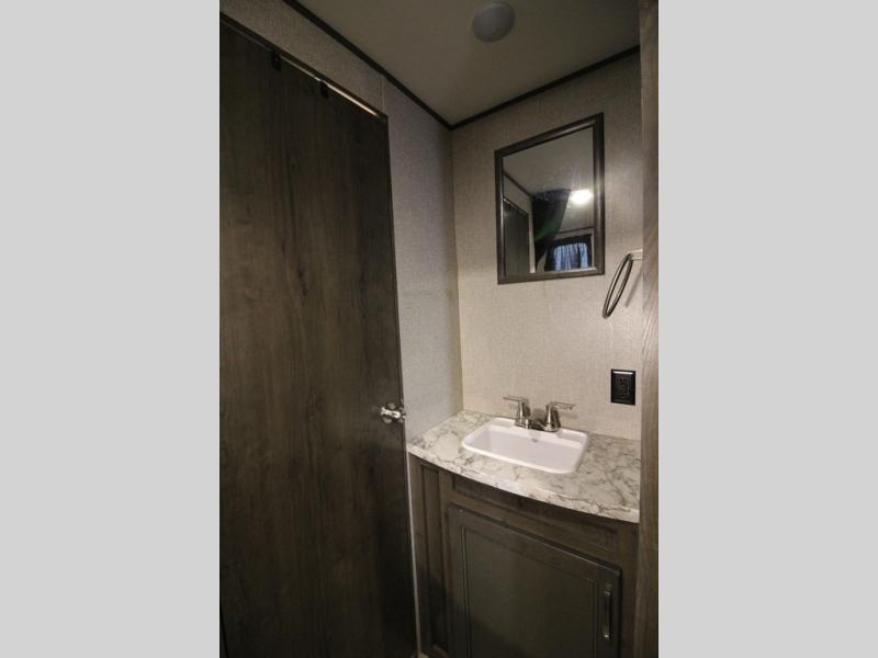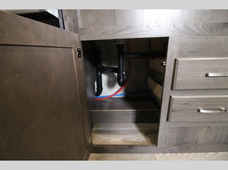 The whole family can head to the campground with this travel trailer! Everyone will start each day feeling re-charged and ready to go after sleeping on the rear corner double bunk beds and the front queen bed, plus the sofa and the booth dinette can also transform into extra sleeping spaces for any friends that want to tag along. The rear corner bathroom comes with a tub/shower that has a skylight above for natural lighting and a wood trimmed mirror to make you feel more at home. There is plenty of storage inside and out between the overhead cabinets, the wardrobes, and the exterior pass-through storage area. You can also add the optional Chil N' Stor feature to the exterior so that you can enjoy a nice, cold beverage without having to go inside to get one!