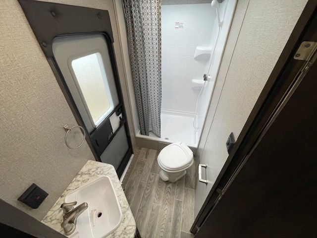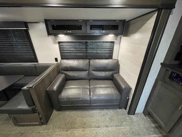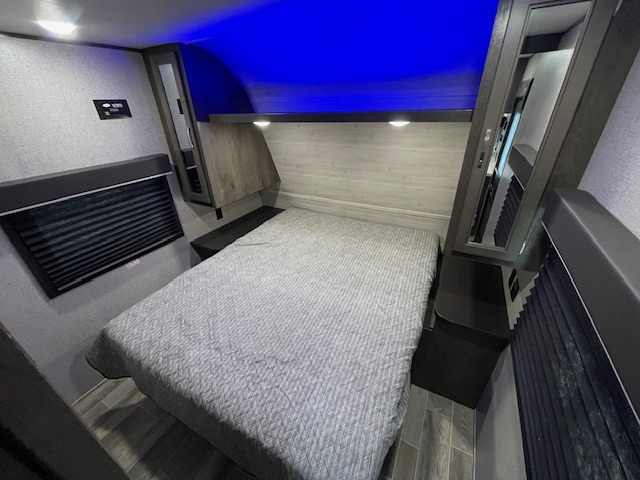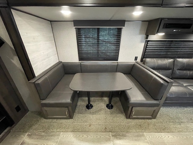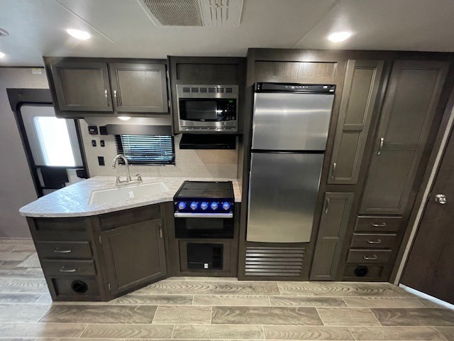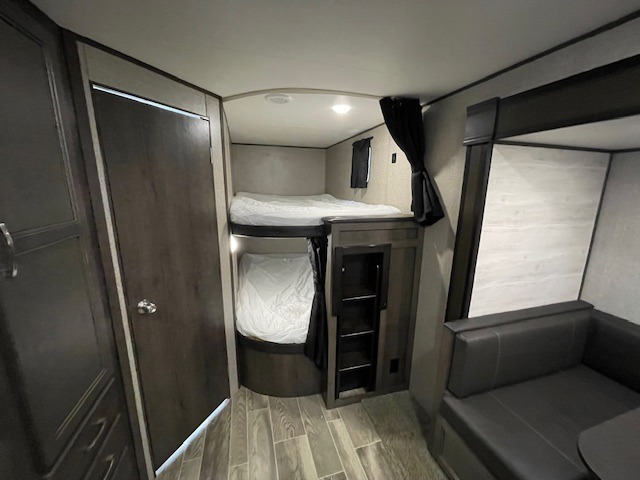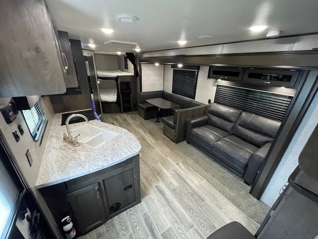 With dual entry doors, you will experience a smooth flow of traffic in and out of this travel trailer! One of the entrances leads directly into the spacious corner bathroom so you can quickly use the restroom and get back to playing outdoors. Next to the bathroom are the double bunk beds with a ladder and a privacy curtain to draw at night. The kids can even bring a friend or two to tag along and use the U-shaped dinette and J-Steel™ jackknife sofa slide to convert into extra sleeping spaces when not being used for enjoying your meals at or sitting on while enjoying the entertainment center. The kitchen is full of at-home features you will love like the large 50/50 acrylic sink, the microwave, and the 6 cu. ft. stainless steel refrigerator with temperature controls. The exterior is packed with awesome features too like the outside shower, the power awning with LED lights and speakers, and the pass-through storage area!