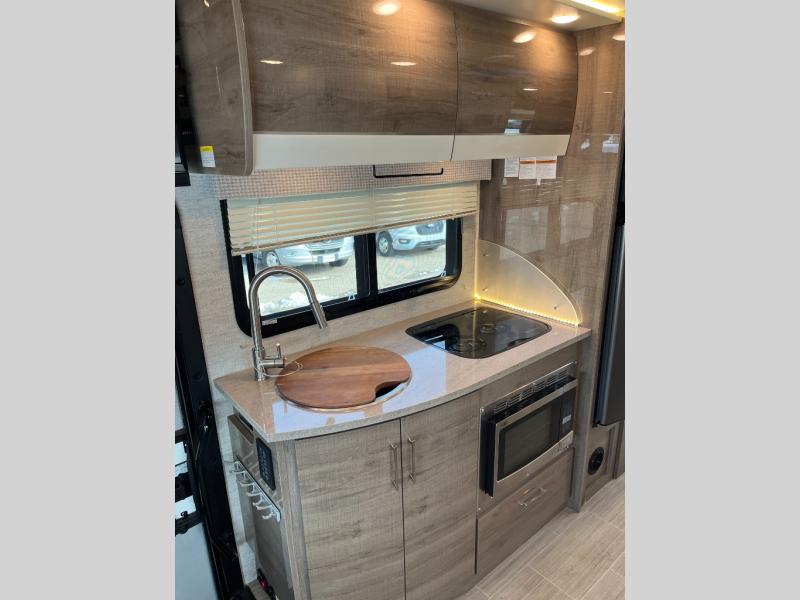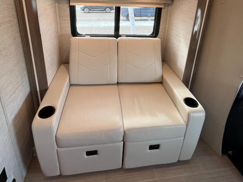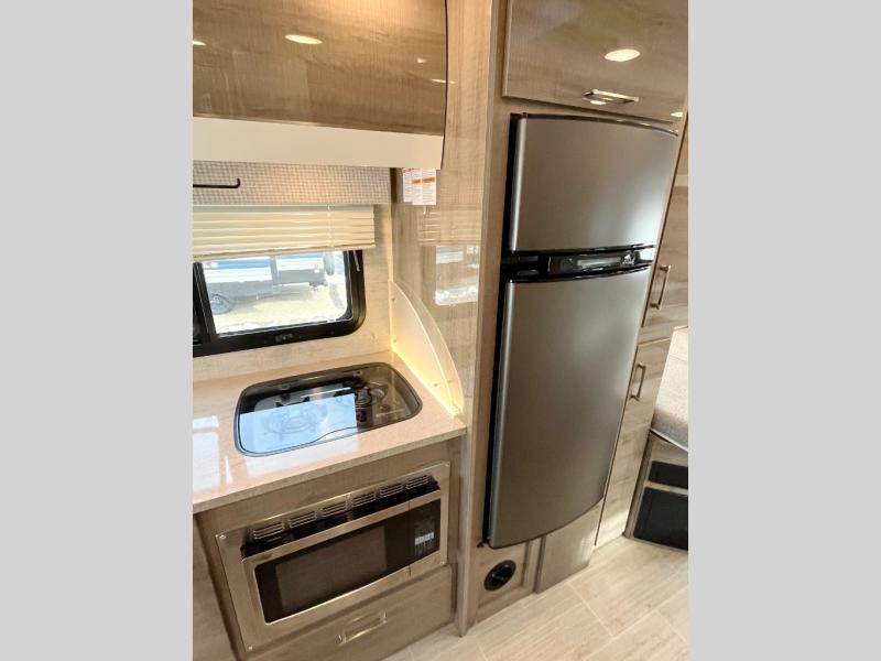 The hardest decision you will have to make with this motorhome is where to take it! There is plenty of sitting and sleeping space for everyone between the rear 32" x 72" twin beds, the overhead bunk with a 750 lb. capacity, the sofa, and the Ultraleather® swivel driver and passenger seats. The full bathroom has a decorative surround 19" x 28" x 34" shower with a skylight and a stainless steel sink to freshen up after a long day on the road. There is an abundance of storage between the overhead cabinets and the wardrobe next to one of the twin beds, plus a 6 cu. ft. refrigerator to keep your perishables cold and fresh. If you don't need the extra sleeping space then you can add the B-Plus option where the cabover bunk is switched out for an entertainment center!