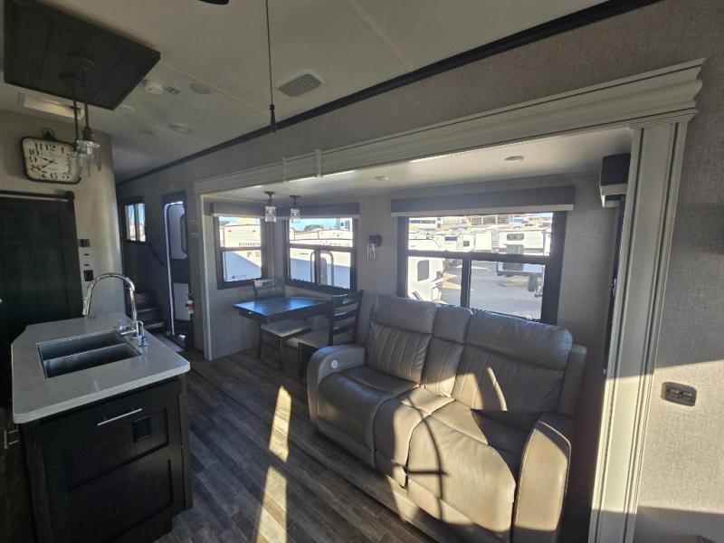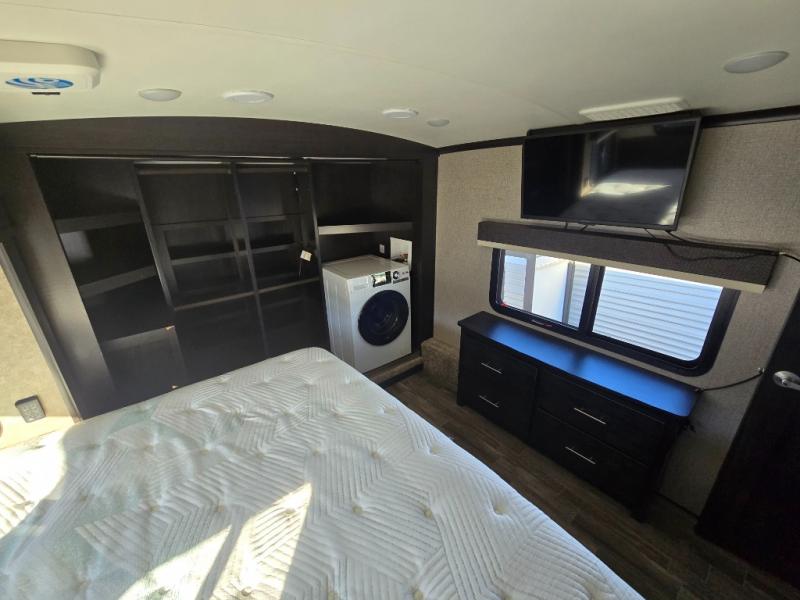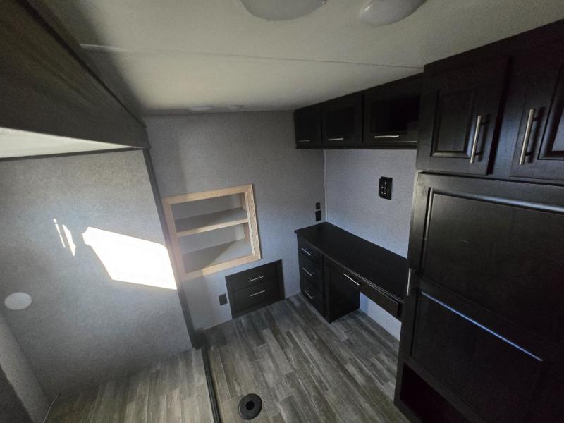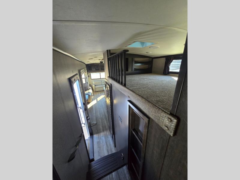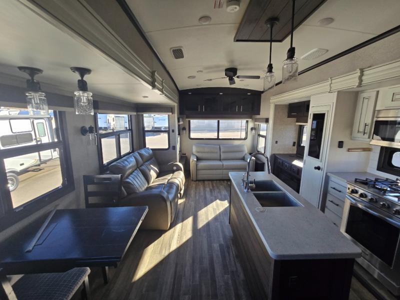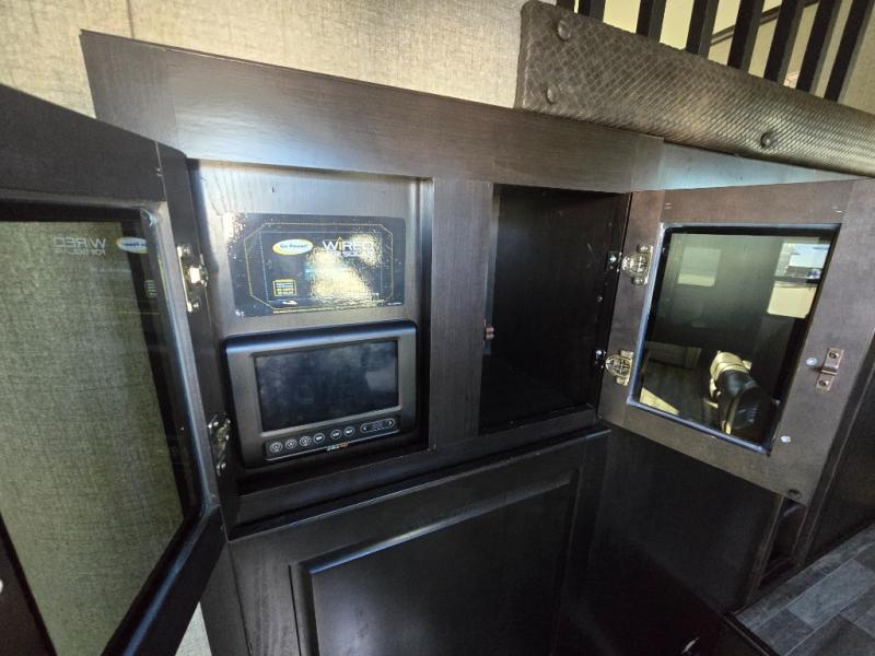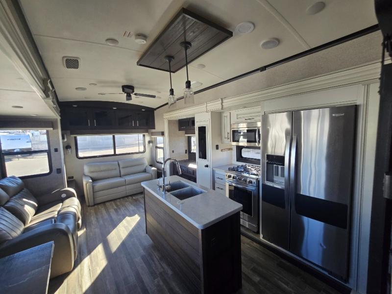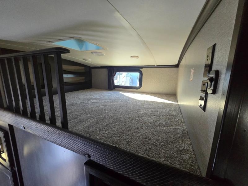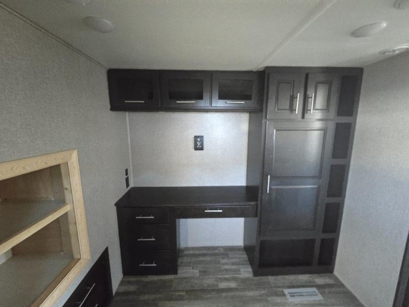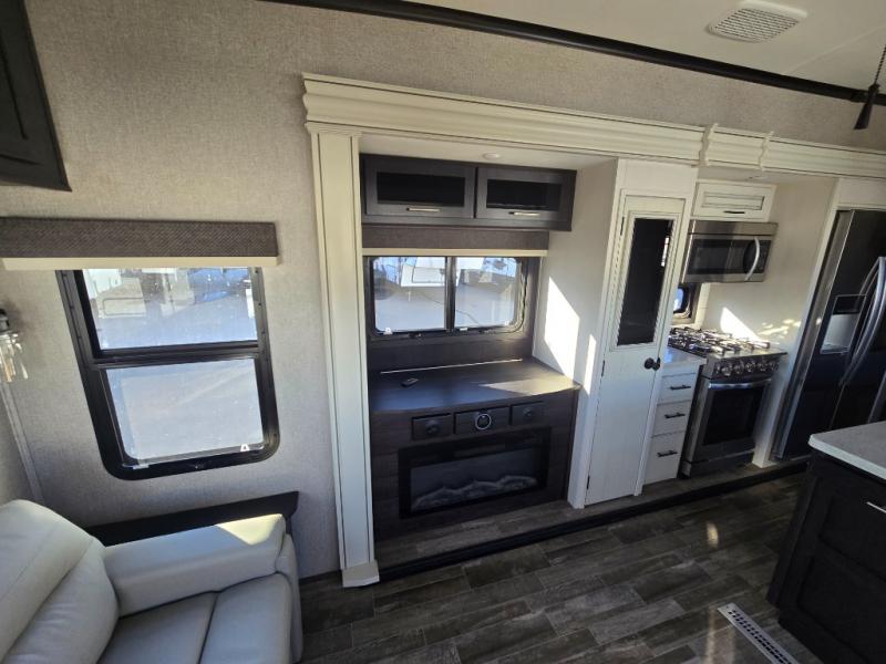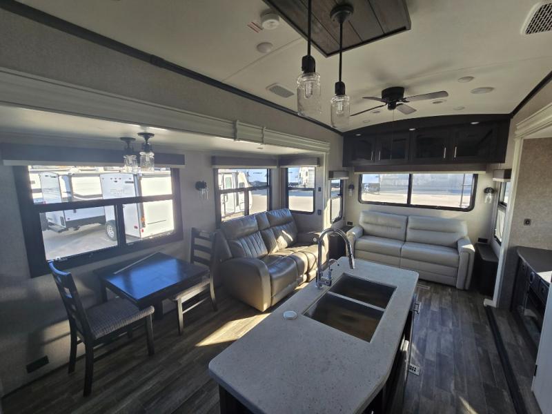 You can bring the whole family with two bedrooms in this fifth wheel! The front private bedroom features a queen bed, a front wall walk-in closet with a hamper and a space prepped to add the optional washer and dryer, and a flip-up dresser with a 32" TV. The second room can be used as a den, an office or a guest room with an overhead loft above a flip-up bunk that has a tri-fold sofa below it, and a desk with a TV. The kitchen is decked out in at-home features like the kitchen island with a double sink and prepped for the optional dishwasher, the large pantry, and a 21 cu. ft. refrigerator to keep your perishables fresh. You can wind down each night by relaxing in the rear living area on either the tri-fold hide-a-bed sofa with flip top side tables to set your drink on or the theater seat which are directly across from the fireplace with a TV on a lift. You can even choose to add the optional tailgate TV next to the outside kitchen with a 17' electric awning with LED lights to keep you protected!