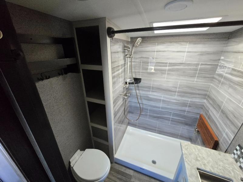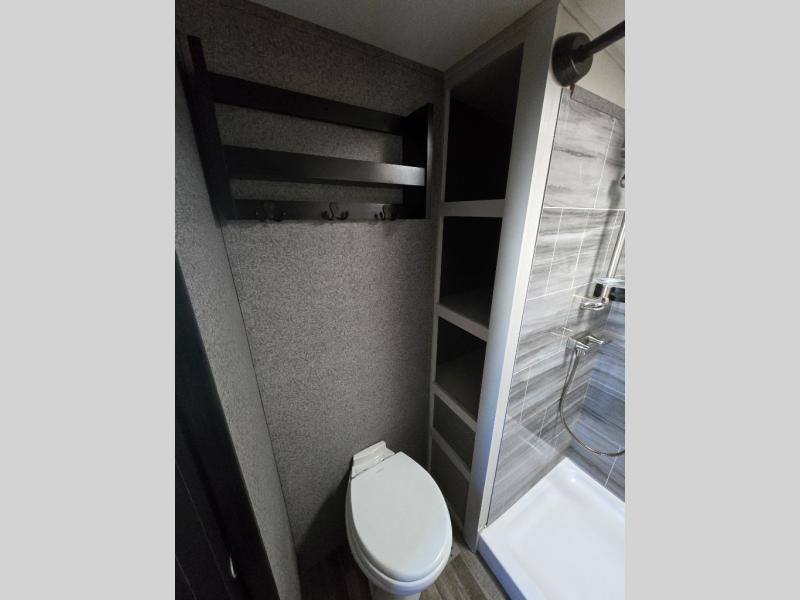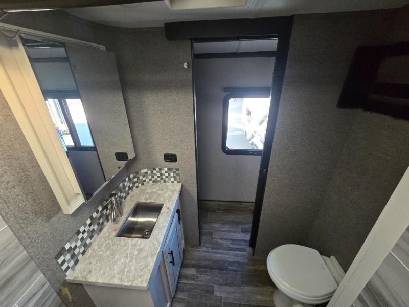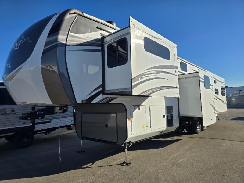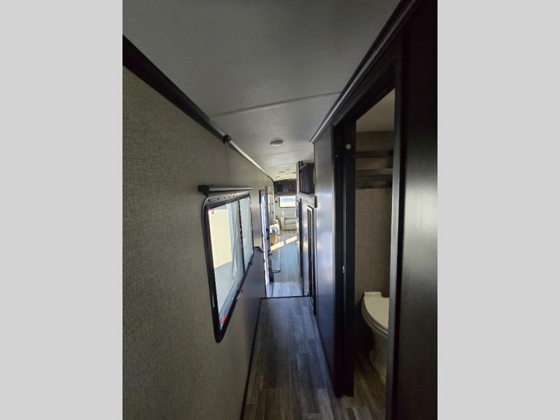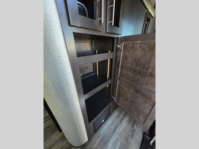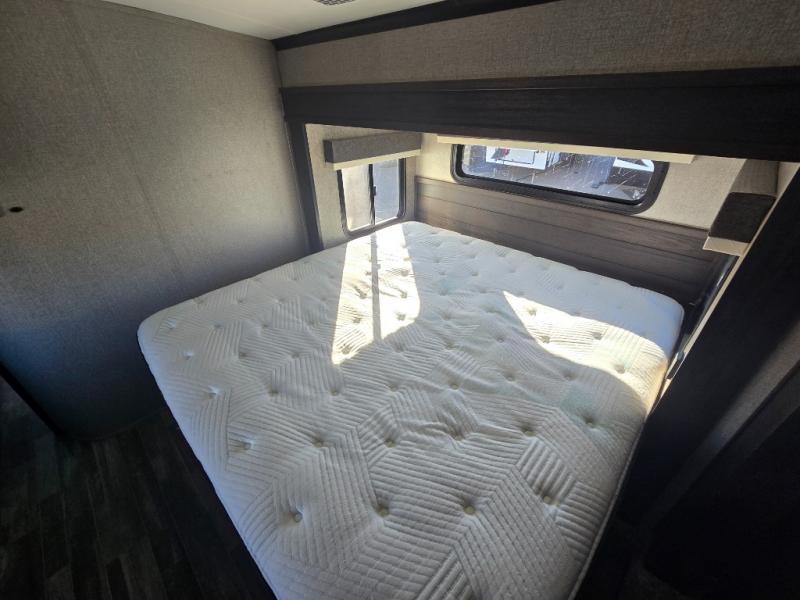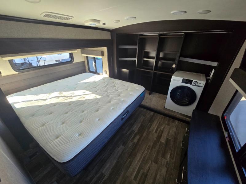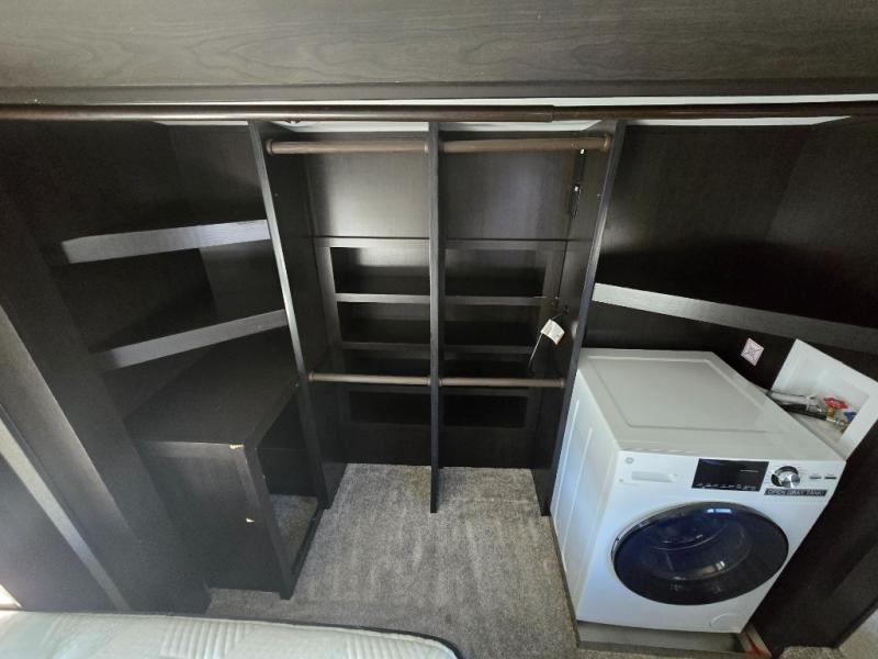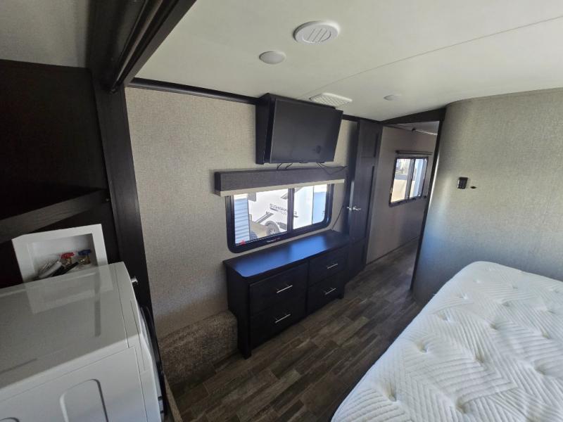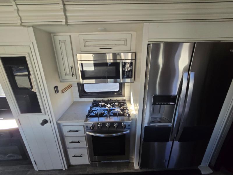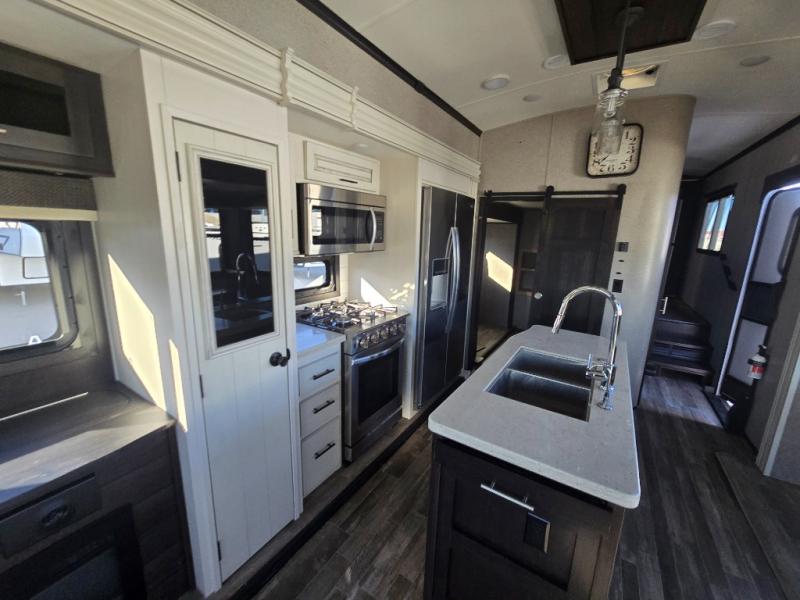 You can bring the whole family with two bedrooms in this fifth wheel! The front private bedroom features a queen bed, a front wall walk-in closet with a hamper and a space prepped to add the optional washer and dryer, and a flip-up dresser with a 32" TV. The second room can be used as a den, an office or a guest room with an overhead loft above a flip-up bunk that has a tri-fold sofa below it, and a desk with a TV. The kitchen is decked out in at-home features like the kitchen island with a double sink and prepped for the optional dishwasher, the large pantry, and a 21 cu. ft. refrigerator to keep your perishables fresh. You can wind down each night by relaxing in the rear living area on either the tri-fold hide-a-bed sofa with flip top side tables to set your drink on or the theater seat which are directly across from the fireplace with a TV on a lift. You can even choose to add the optional tailgate TV next to the outside kitchen with a 17' electric awning with LED lights to keep you protected!