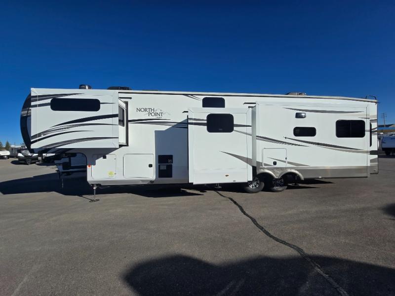 These Jayco North Point fifth wheels offer sleeping spaces and luxurious features to accommodate all types and sizes of groups! You will have generations of family fun with construction features like the Stronghold VBL™ aluminum framed, vacuum bond laminated walls and a Magnum Truss™ XL6™ roof system with a one-piece, seamless DiFlex II material which is the strongest tested roof in the industry. There are three mandatory packages to make your traveling experience even better. One of the packages is a five star handling package which includes Dexter axles with Nev-R-Adjust brakes, Dexter heavy-duty shackles with wet bolt fasteners and bronze bushings to resist the wear and tear of towing, Goodyear beast tires, a MORryde rubberized suspension system, and a MORryde pin box so you can travel forward, backward, and side-to-side for a smoother tow. Come choose your favorite model today!