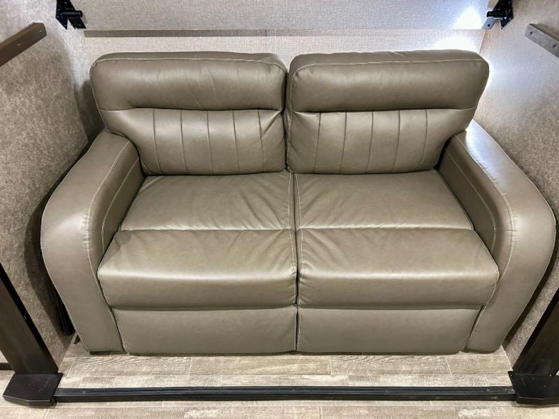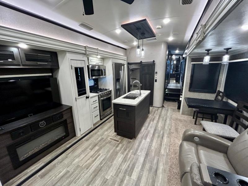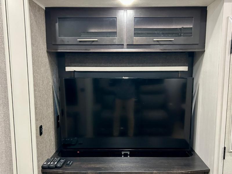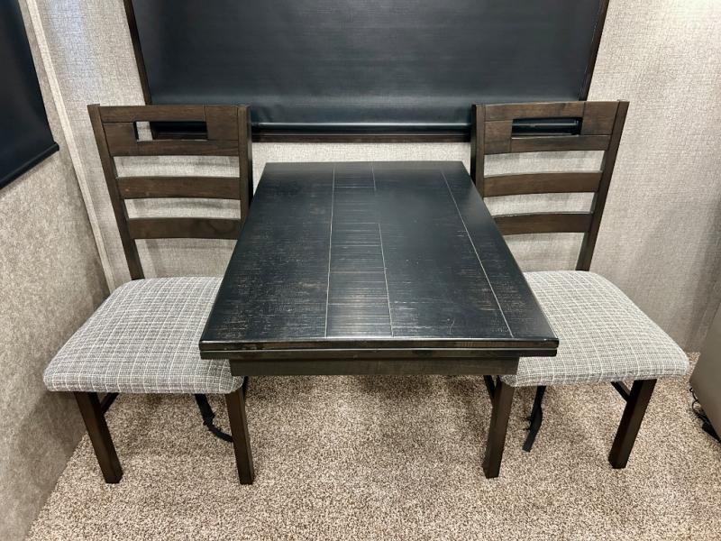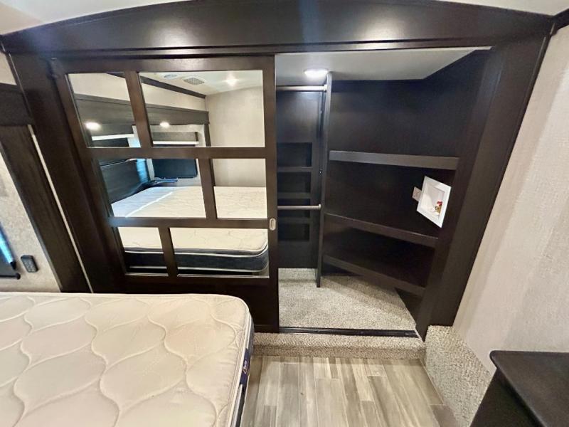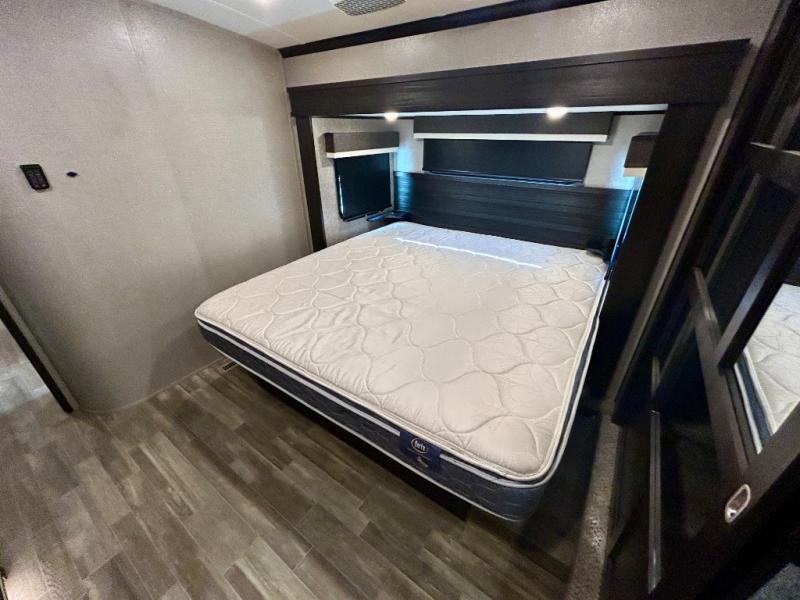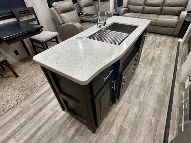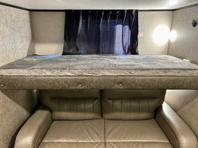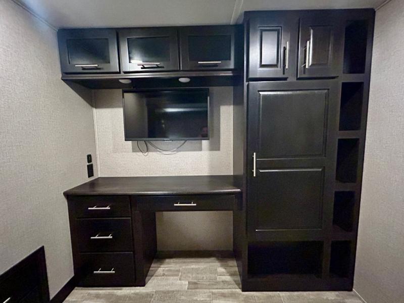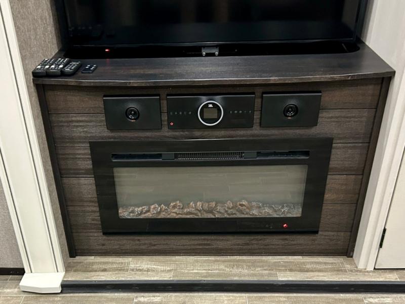 You can bring the whole family with two bedrooms in this fifth wheel! The front private bedroom features a queen bed, a front wall walk-in closet with a hamper and a space prepped to add the optional washer and dryer, and a flip-up dresser with a 32" TV. The second room can be used as a den, an office or a guest room with an overhead loft above a flip-up bunk that has a tri-fold sofa below it, and a desk with a TV. The kitchen is decked out in at-home features like the kitchen island with a double sink and prepped for the optional dishwasher, the large pantry, and a 21 cu. ft. refrigerator to keep your perishables fresh. You can wind down each night by relaxing in the rear living area on either the tri-fold hide-a-bed sofa with flip top side tables to set your drink on or the theater seat which are directly across from the fireplace with a TV on a lift. You can even choose to add the optional tailgate TV next to the outside kitchen with a 17' electric awning with LED lights to keep you protected!