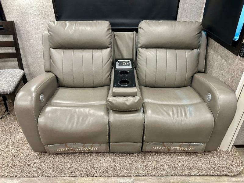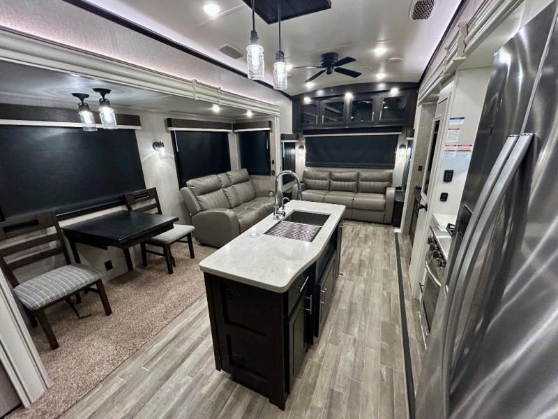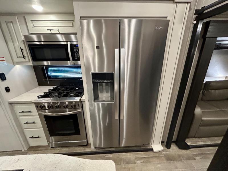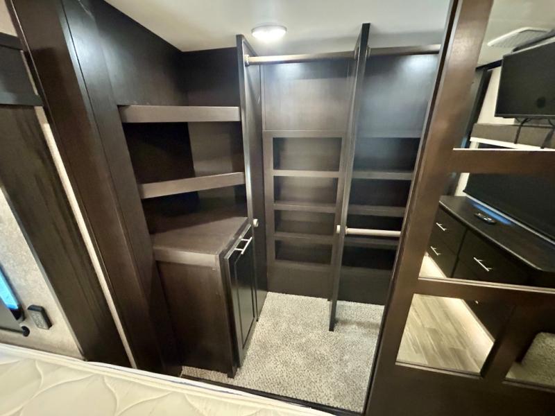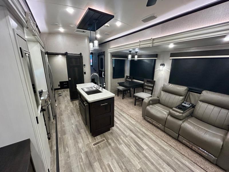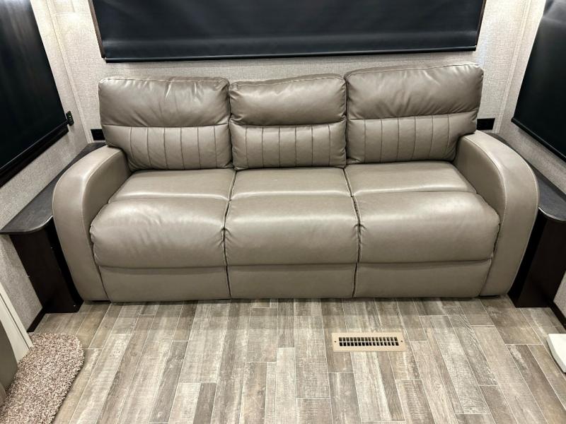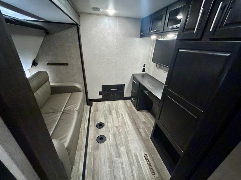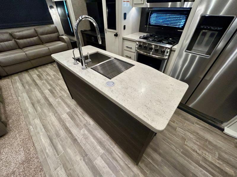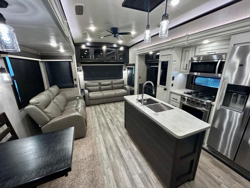You can bring the whole family with two bedrooms in this fifth wheel! The front private bedroom features a queen bed, a front wall walk-in closet with a hamper and a space prepped to add the optional washer and dryer, and a flip-up dresser with a 32" TV. The second room can be used as a den, an office or a guest room with an overhead loft above a flip-up bunk that has a tri-fold sofa below it, and a desk with a TV. The kitchen is decked out in at-home features like the kitchen island with a double sink and prepped for the optional dishwasher, the large pantry, and a 21 cu. ft. refrigerator to keep your perishables fresh. You can wind down each night by relaxing in the rear living area on either the tri-fold hide-a-bed sofa with flip top side tables to set your drink on or the theater seat which are directly across from the fireplace with a TV on a lift. You can even choose to add the optional tailgate TV next to the outside kitchen with a 17' electric awning with LED lights to keep you protected!