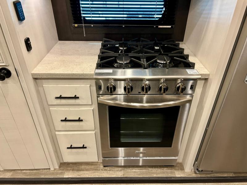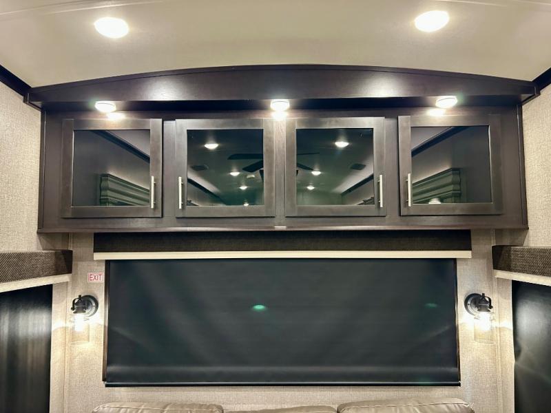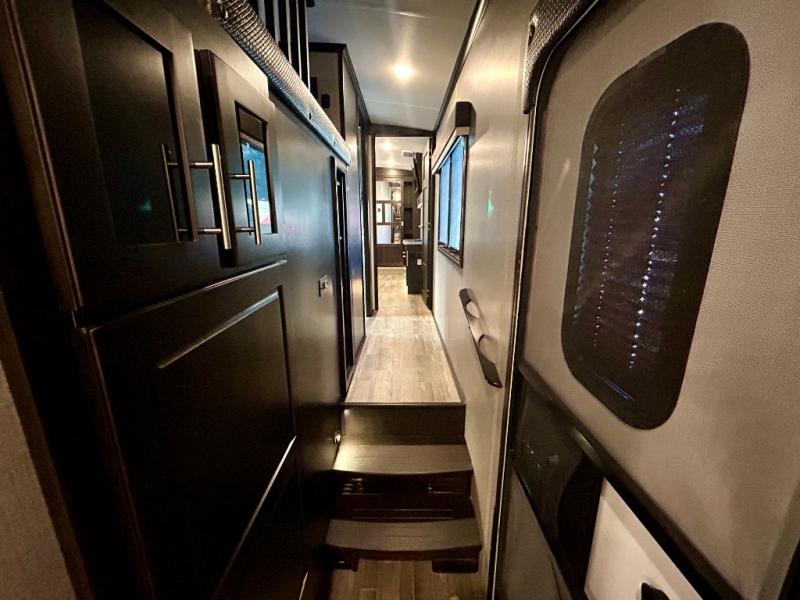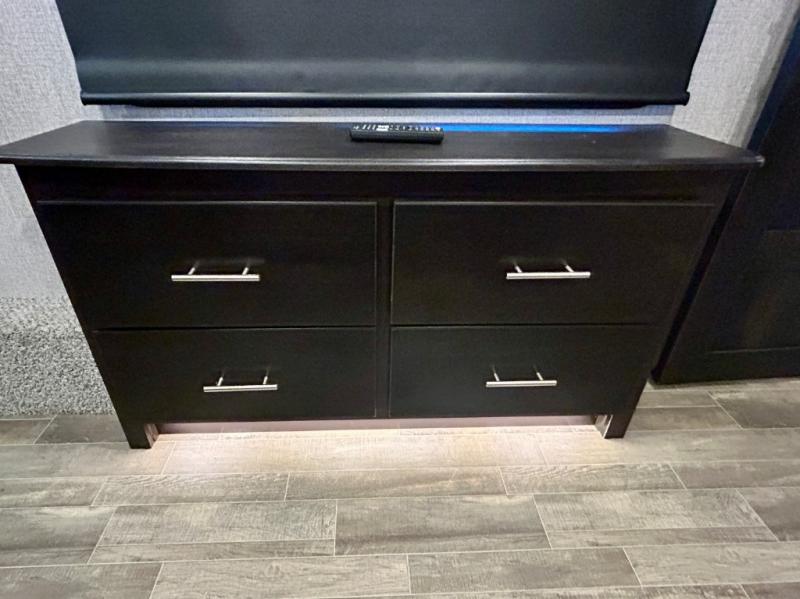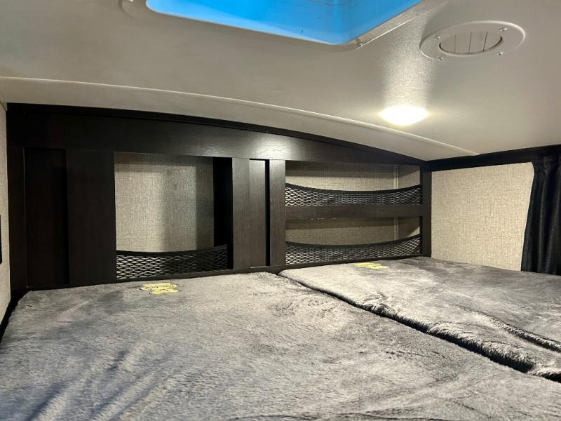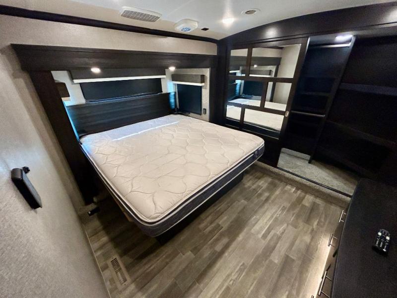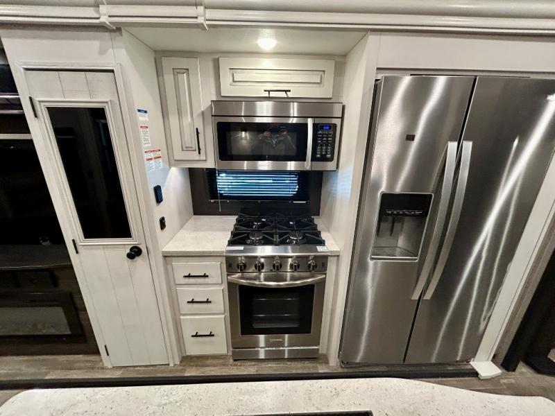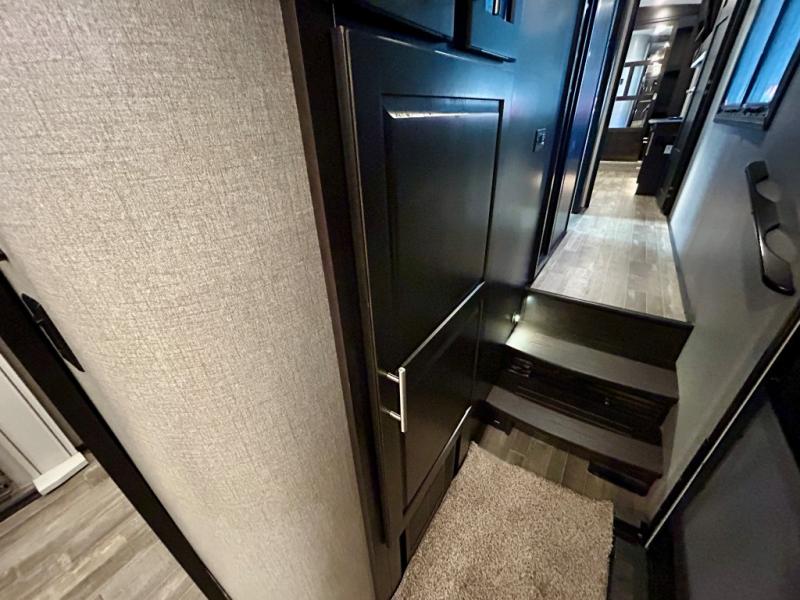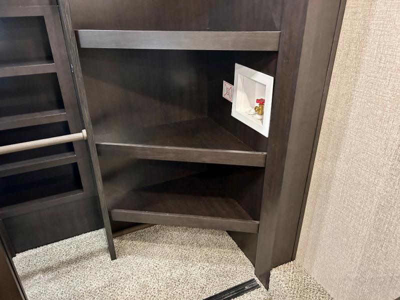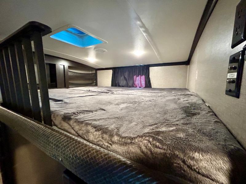 You can bring the whole family with two bedrooms in this fifth wheel! The front private bedroom features a queen bed, a front wall walk-in closet with a hamper and a space prepped to add the optional washer and dryer, and a flip-up dresser with a 32" TV. The second room can be used as a den, an office or a guest room with an overhead loft above a flip-up bunk that has a tri-fold sofa below it, and a desk with a TV. The kitchen is decked out in at-home features like the kitchen island with a double sink and prepped for the optional dishwasher, the large pantry, and a 21 cu. ft. refrigerator to keep your perishables fresh. You can wind down each night by relaxing in the rear living area on either the tri-fold hide-a-bed sofa with flip top side tables to set your drink on or the theater seat which are directly across from the fireplace with a TV on a lift. You can even choose to add the optional tailgate TV next to the outside kitchen with a 17' electric awning with LED lights to keep you protected!