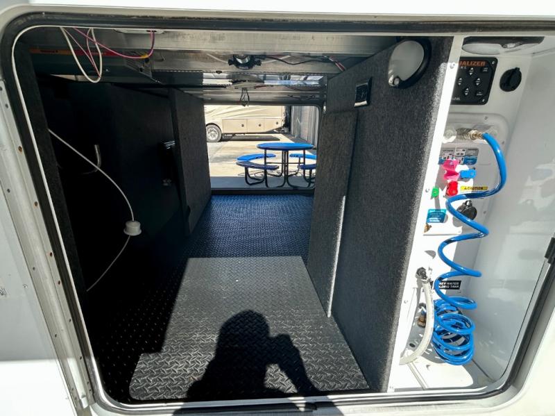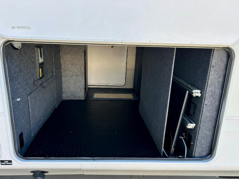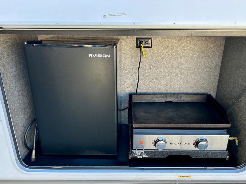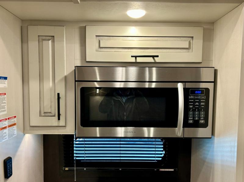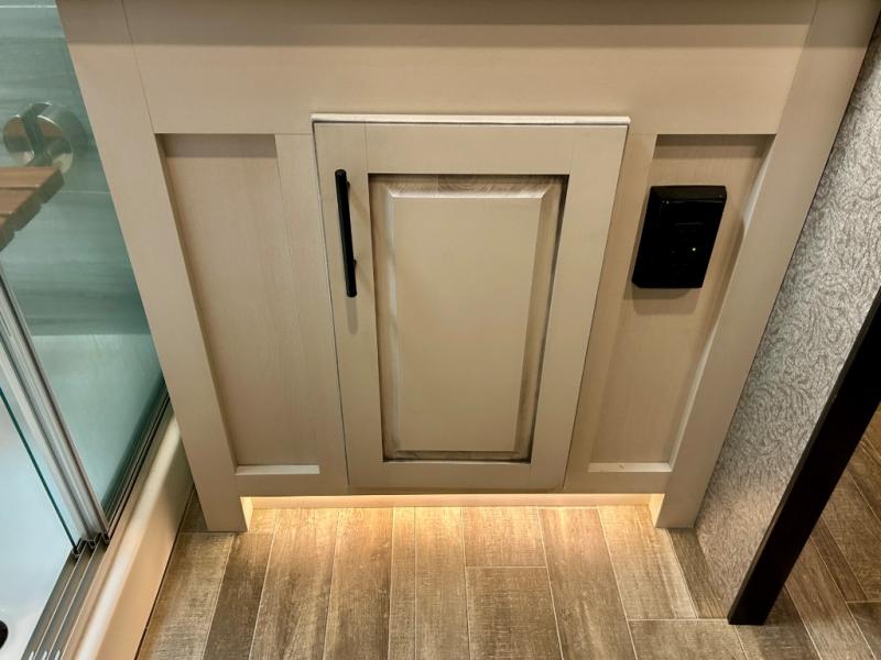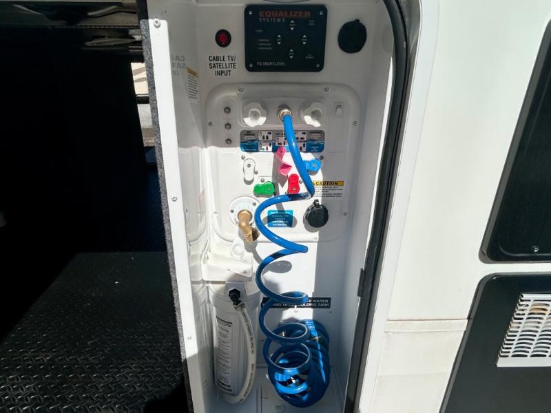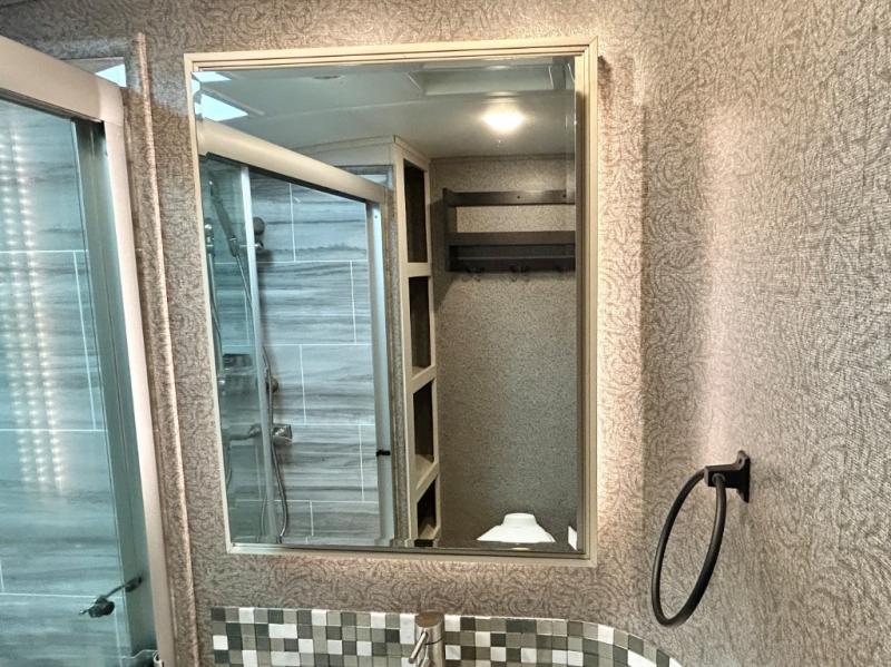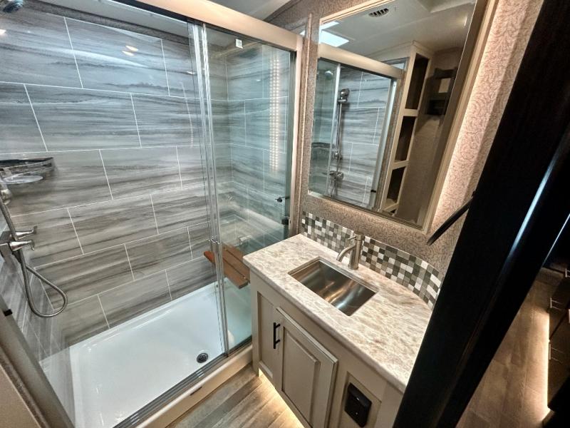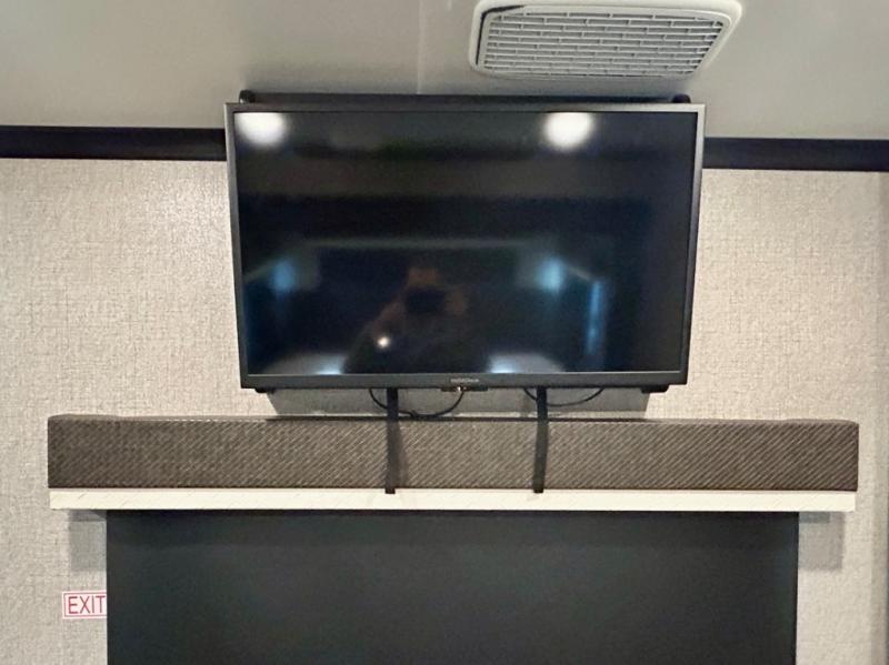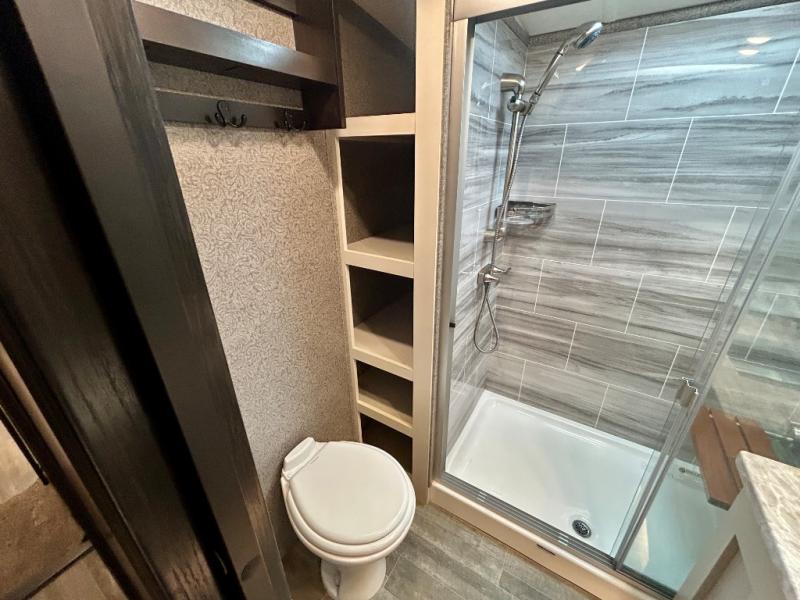 You can bring the whole family with two bedrooms in this fifth wheel! The front private bedroom features a queen bed, a front wall walk-in closet with a hamper and a space prepped to add the optional washer and dryer, and a flip-up dresser with a 32" TV. The second room can be used as a den, an office or a guest room with an overhead loft above a flip-up bunk that has a tri-fold sofa below it, and a desk with a TV. The kitchen is decked out in at-home features like the kitchen island with a double sink and prepped for the optional dishwasher, the large pantry, and a 21 cu. ft. refrigerator to keep your perishables fresh. You can wind down each night by relaxing in the rear living area on either the tri-fold hide-a-bed sofa with flip top side tables to set your drink on or the theater seat which are directly across from the fireplace with a TV on a lift. You can even choose to add the optional tailgate TV next to the outside kitchen with a 17' electric awning with LED lights to keep you protected!