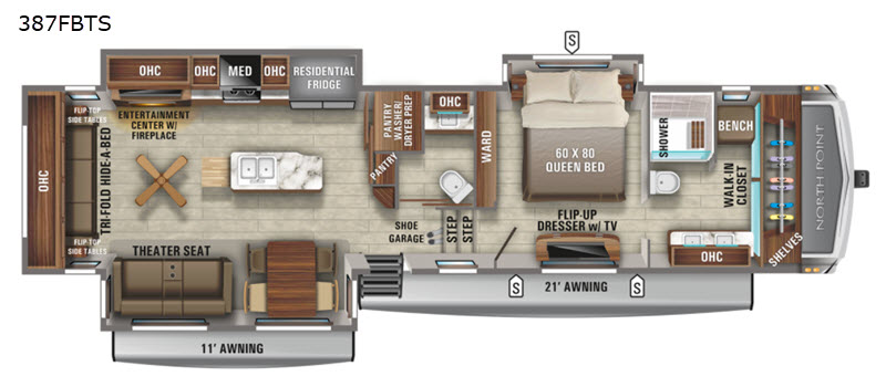 This front bathroom fifth wheel features a dual sink vanity so that two can get ready at once, a walk-in closet, a shower with a seat, and a bench for your convenience! The private bedroom has ample space for your clothing between the wardrobe with a built-in laundry hamper and flip-up dresser with a 32" TV for your entertainment. The stairs leading down into the kitchen/living area have a shoe garage to keep someone from tripping over them. The large pantry can not only hold everyone's favorite snacks, but it is also prepped to add the optional washer and dryer. You will feel right at home cooking in this kitchen with the island that has a pull-out countertop extension with a 24" x 24" butcher block bar top, the pull-out utility drawer under the stainless steel sink, and it is even prepped for an optional dishwasher to be added. The rear living area has a tri-fold hide-a-bed sofa with flip top side tables on either side and theater seats across from the entertainment center with a fireplace to end your nights in ultimate relaxation!