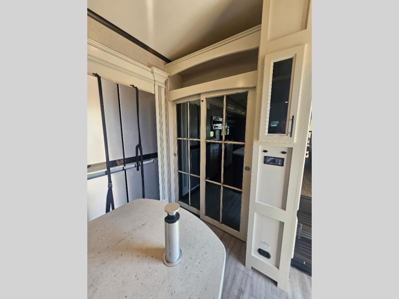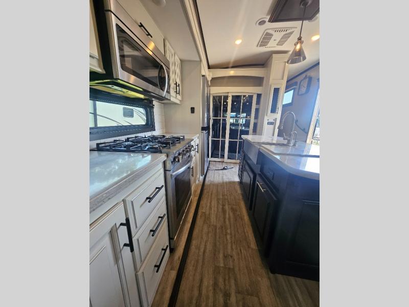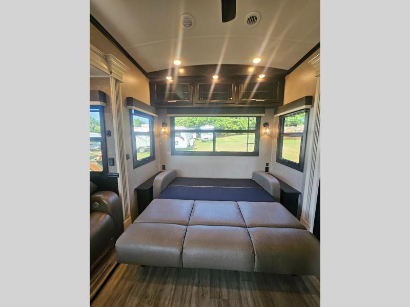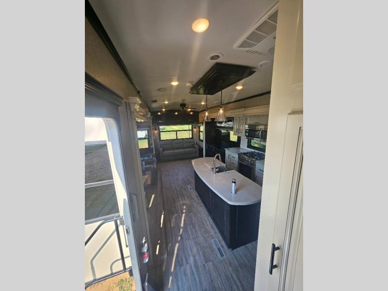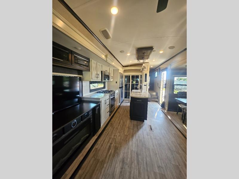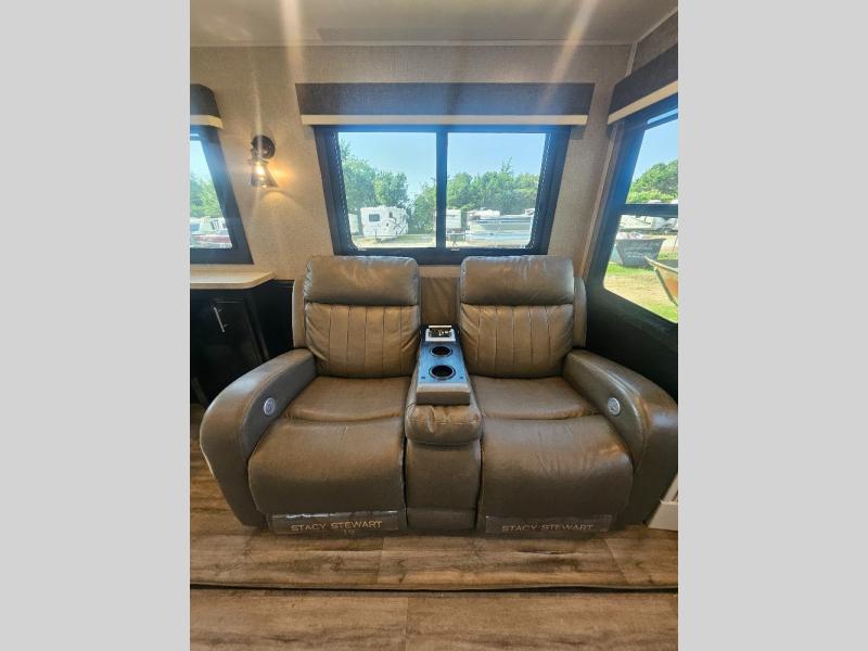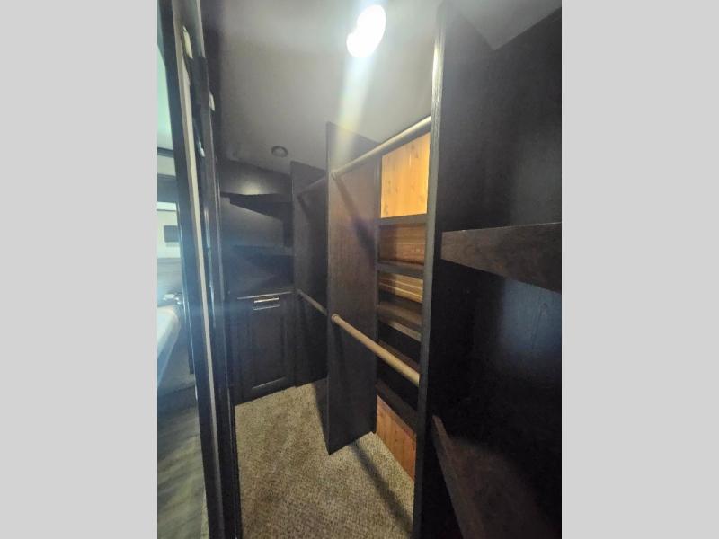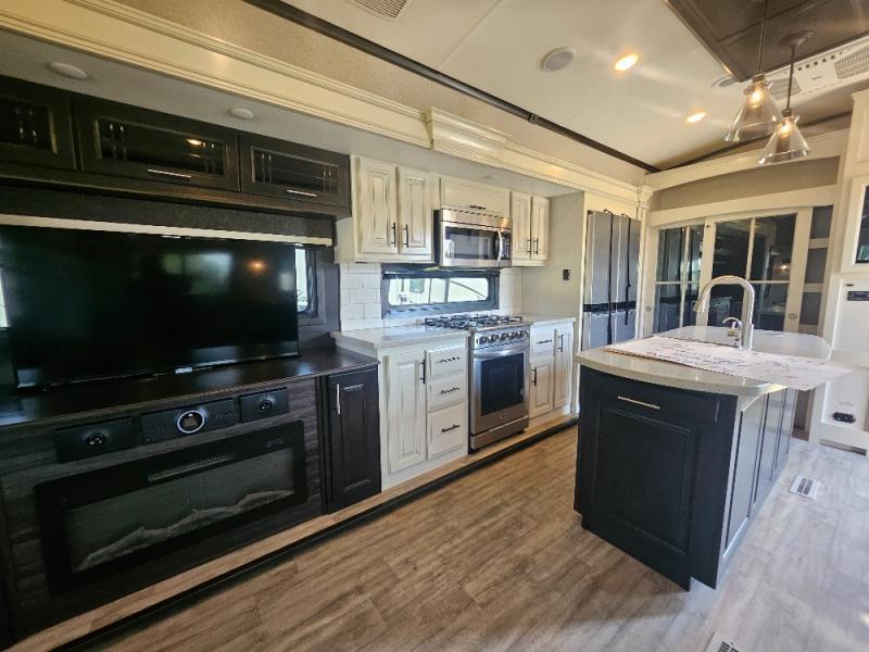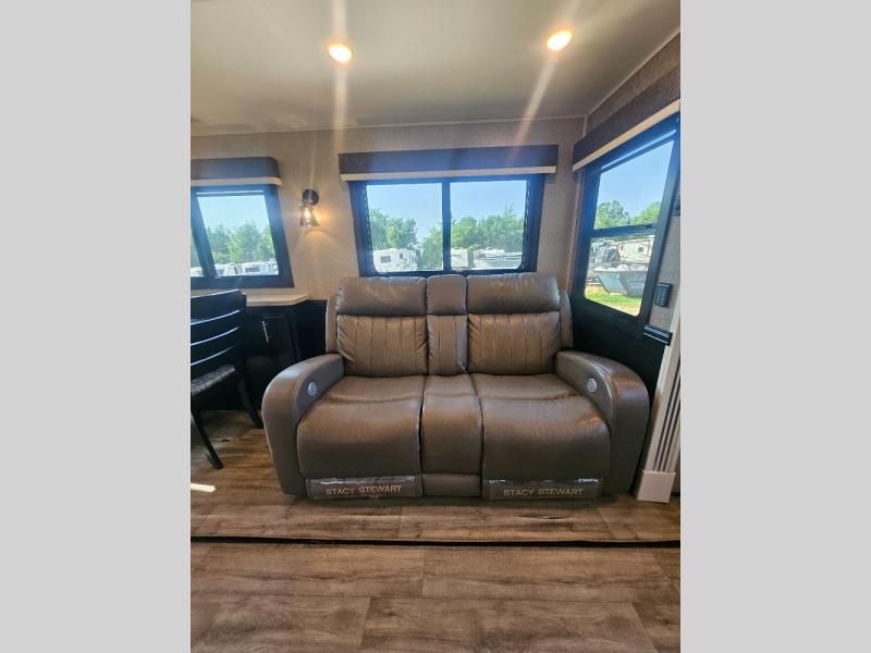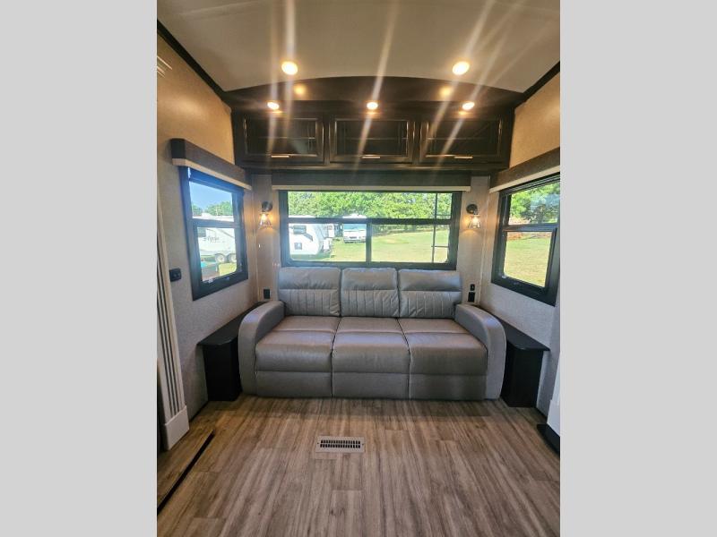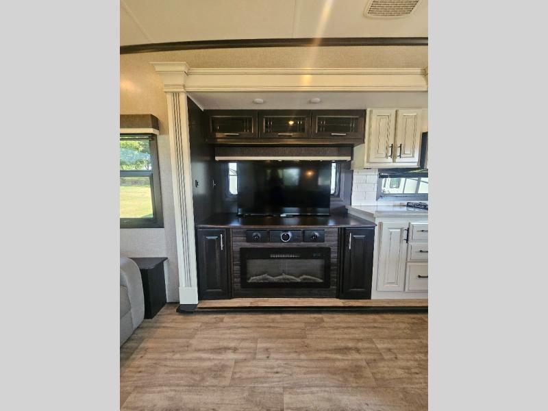 Your family of four will love this spacious fifth wheel. Relax on the theater seat or tri-fold hide-a-bed sofa by the glow of the fireplace, or sit outside under the two power awnings. The exterior 32" LED TV will provide entertainment, and you can grab your camp chairs from the outside storage. The oversized pantry with sliding doors and a pull out trash can will come in handy when packing food for the week, plus there is a 21 cu. ft. residential refrigerator for your perishables. The large galley counter allows you to set out fresh fruits and veggies, and you can choose to add an optional dishwasher to make camping that much easier. When it's time to call it a night, head to the front private bedroom for a great night's rest on the slide out king bed. There is also a walk-in closet with a hamper for all your clothes!