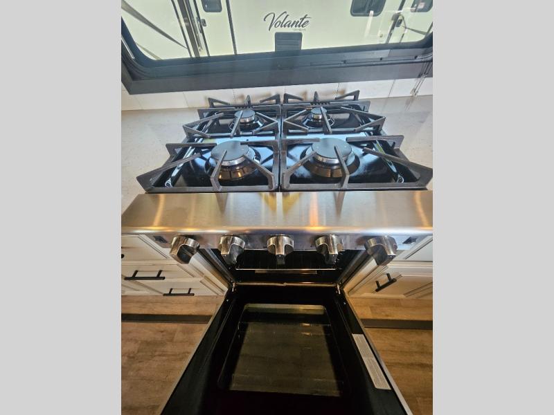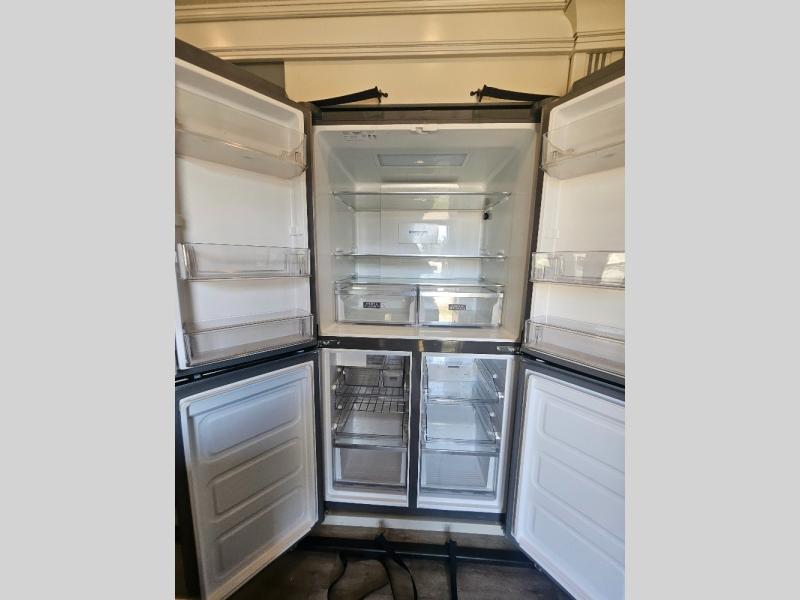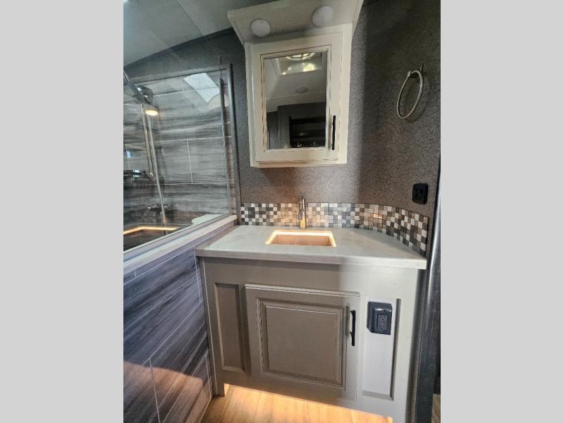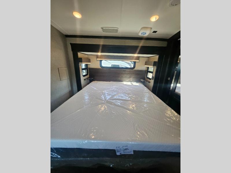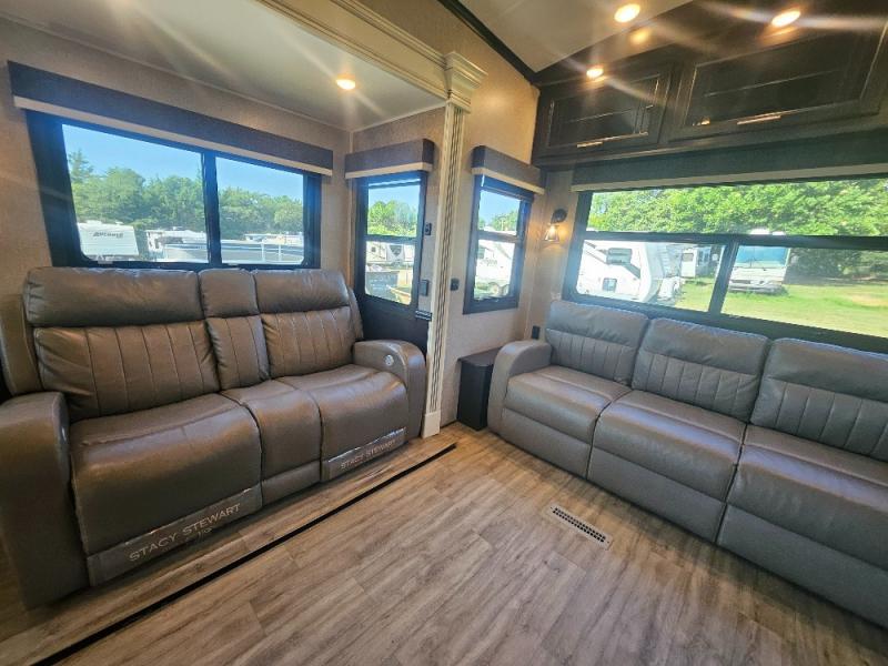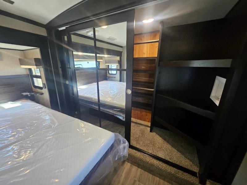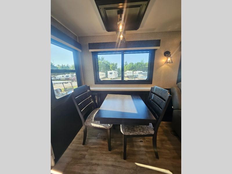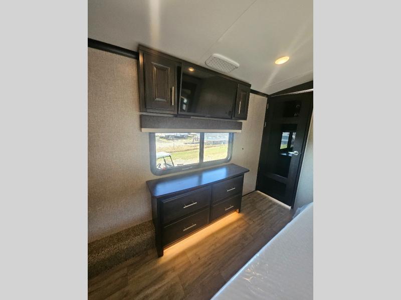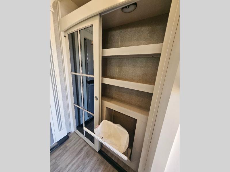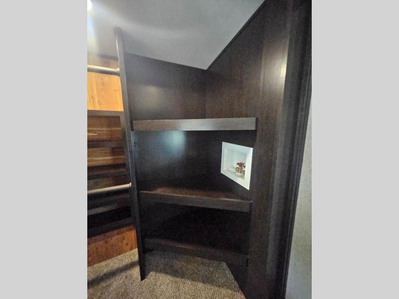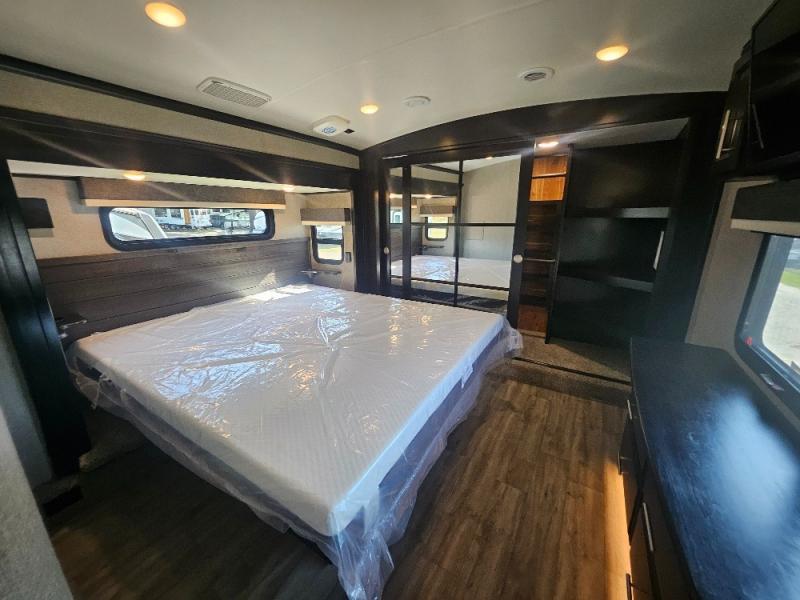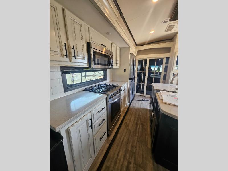 Your family of four will love this spacious fifth wheel. Relax on the theater seat or tri-fold hide-a-bed sofa by the glow of the fireplace, or sit outside under the two power awnings. The exterior 32" LED TV will provide entertainment, and you can grab your camp chairs from the outside storage. The oversized pantry with sliding doors and a pull out trash can will come in handy when packing food for the week, plus there is a 21 cu. ft. residential refrigerator for your perishables. The large galley counter allows you to set out fresh fruits and veggies, and you can choose to add an optional dishwasher to make camping that much easier. When it's time to call it a night, head to the front private bedroom for a great night's rest on the slide out king bed. There is also a walk-in closet with a hamper for all your clothes!
