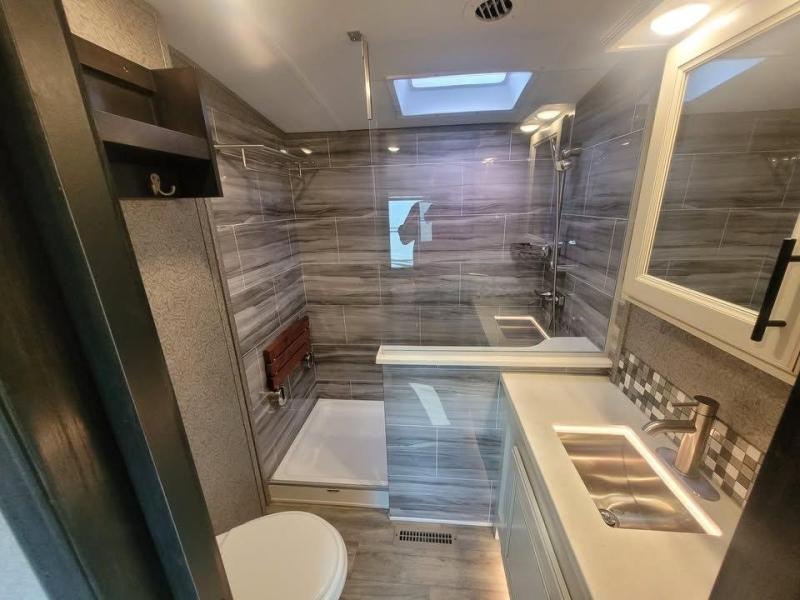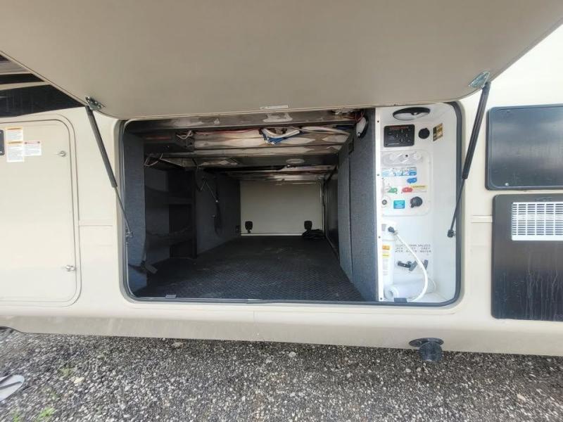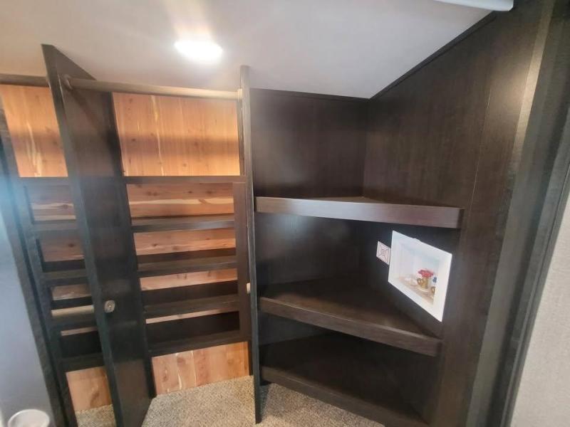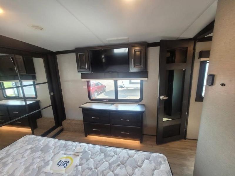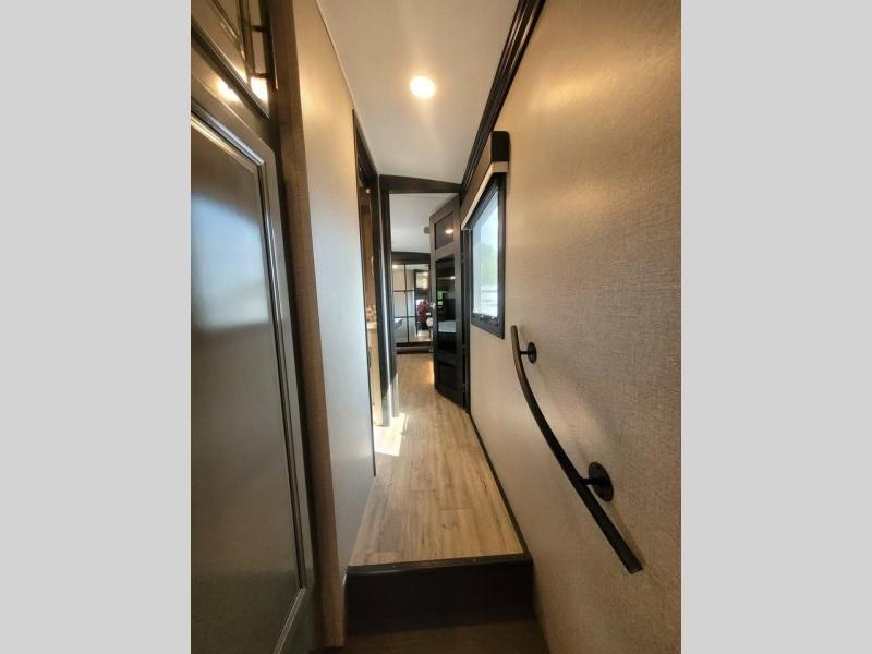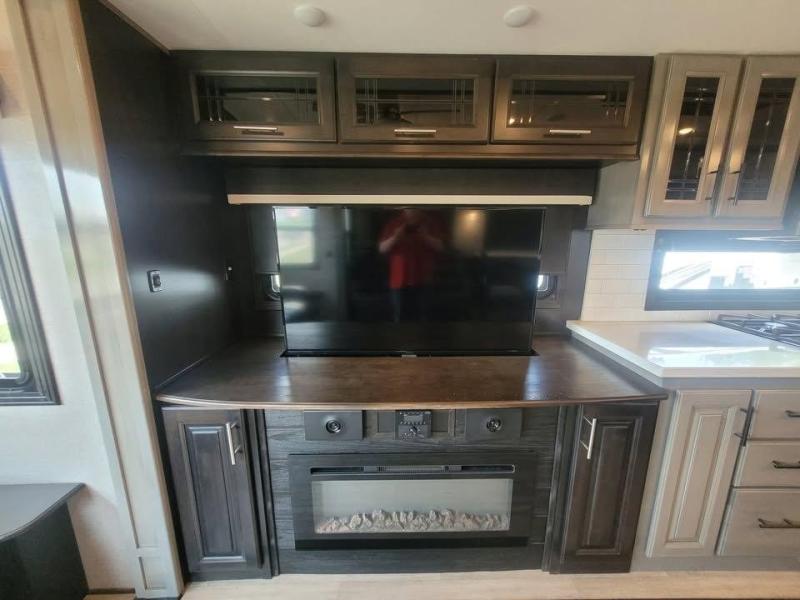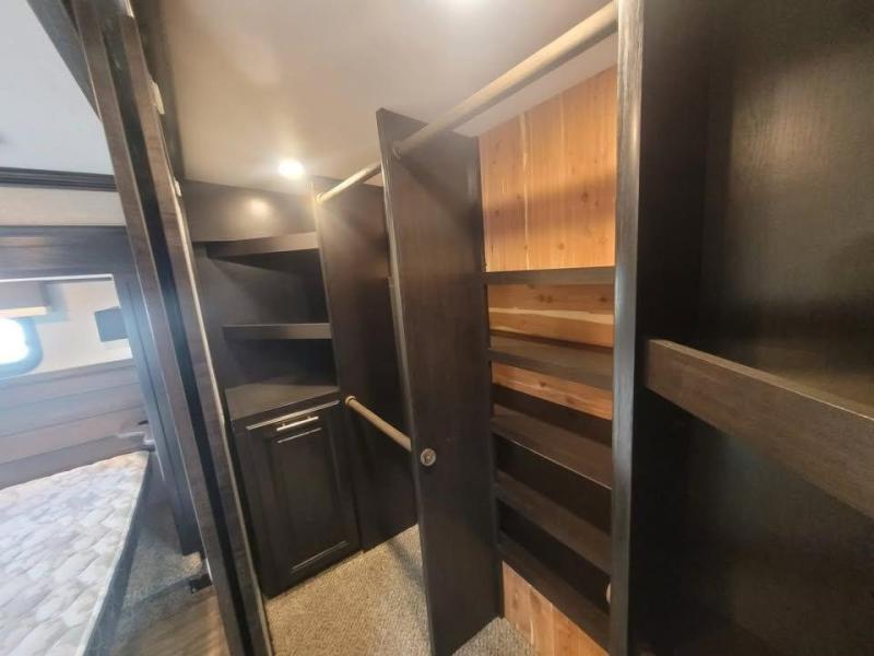 Your family of four will love this spacious fifth wheel. Relax on the theater seat or tri-fold hide-a-bed sofa by the glow of the fireplace, or sit outside under the two power awnings. The exterior 32" LED TV will provide entertainment, and you can grab your camp chairs from the outside storage. The oversized pantry with sliding doors and a pull out trash can will come in handy when packing food for the week, plus there is a 16 cu. ft. residential refrigerator for your perishables. The large galley counter allows you to set out fresh fruits and veggies, and you can choose to add an optional dishwasher to make camping that much easier. When it's time to call it a night, head to the front private bedroom for a great night's rest on the slide out king bed. There is also a walk-in closet with a hamper for all your clothes!