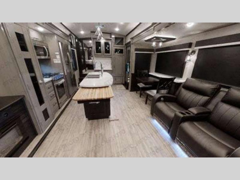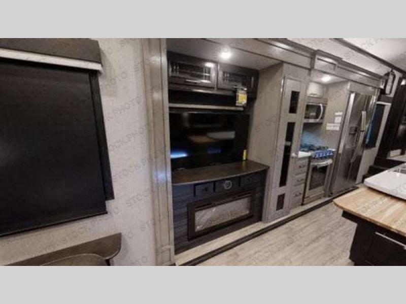 Pack your bags and head to your local state park for a fun family vacation in this fifth wheel. The chef of the family will love cooking in the spacious kitchen with a full pantry and a hutch for your nice dishes. You can also choose to add an optional dishwasher to make clean-up easier than ever. This model includes a full bath with dual bath sinks and a walk-in shower with a seat for your comfort. The front private bedroom will feel just like home with its slide out king bed, a front lounge seat, plus your own fireplace for a cozy evening indoors.