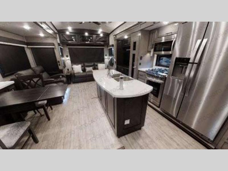 Enjoy all-around luxury features in the Pinnacle fifth wheel by Jayco! Each model includes a fully enclosed, LED-lit Nautilus universal docking center, a pass-through storage with Slam-Latch baggage doors, and a 6-point auto-leveling system to make set-up easier than ever. The Magnum Truss XL6 roof system provides the strongest tested roof in the industry so you can enjoy your fifth wheel for years to come, and the custom automotive-grade vinyl exterior graphics package will give it a sleek look. Inside, you'll enjoy the LED HDTV and JBL home entertainment system, along with dual USB charging ports throughout for all your gadgets. The kitchen is packed with convenient and luxury features, such as a stainless steel sink, a 21 cu. ft. residential refrigerator, solid surface countertops, plus a convection microwave. Whether you're enjoying the exterior 32" LED TV, cleaning up with the central vacuum system, or staying cozy by the LED fireplace, you will love the Pinnacle fifth wheel by Jayco!