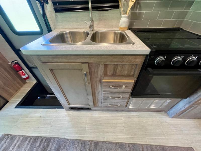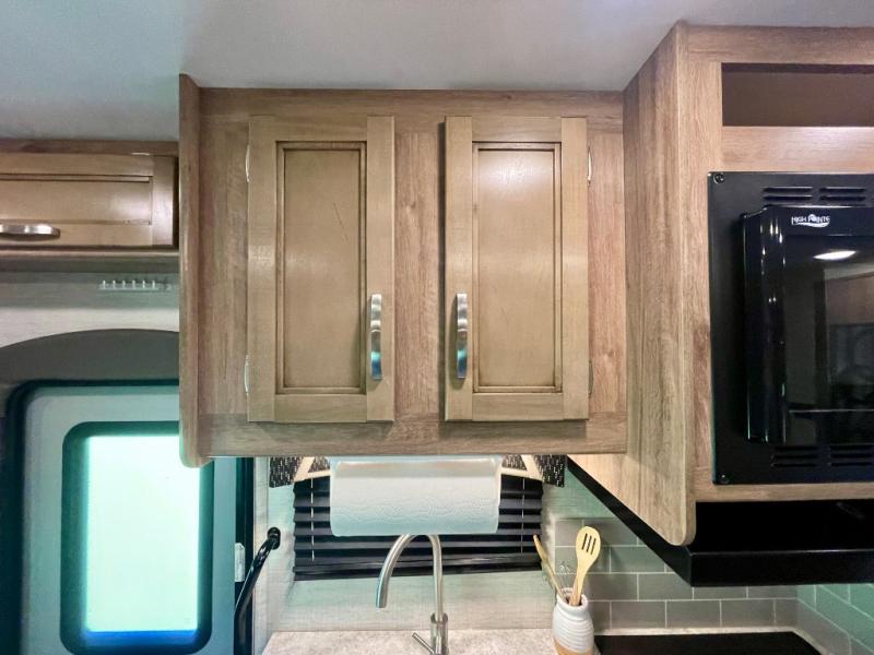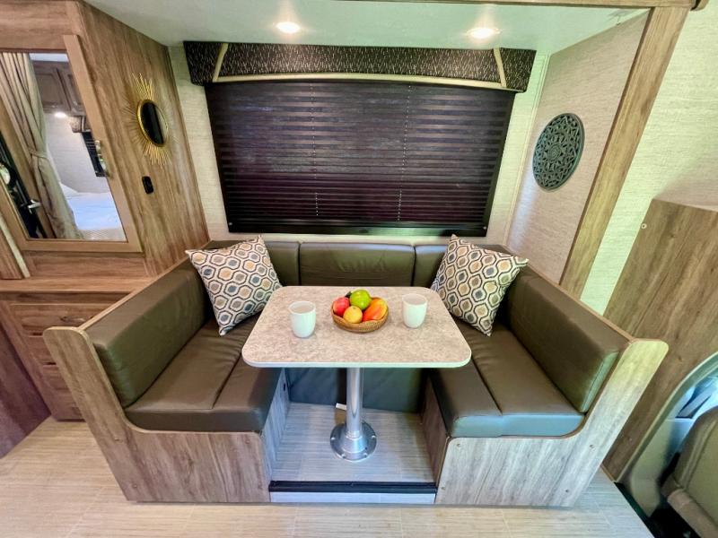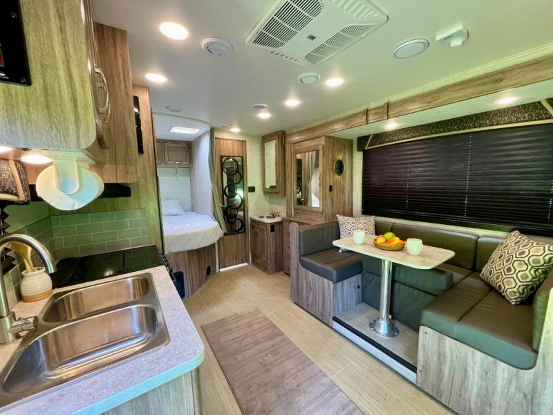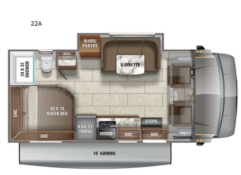 Your trip to see the Grand Canyon just got a whole lot sweeter in this motorhome! Once you arrive at the campground, set up the slide out U-shaped dinette to enjoy added interior space. The chef of the family can prepare lunch on the two burner cooktop, or use the convection microwave for convenience. The wardrobe/pantry will be great to store snacks or paper goods, and the cold items can go in the 6 cu. ft. flush-mount refrigerator. This model includes a queen bed, plus an overhead bunk with 750 lb. capacity so the kids or your overnight guests will have a comfy bed, and the U-shaped dinette can also be used for sleeping space.