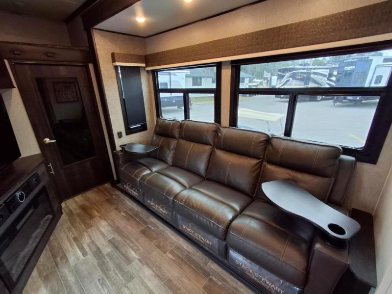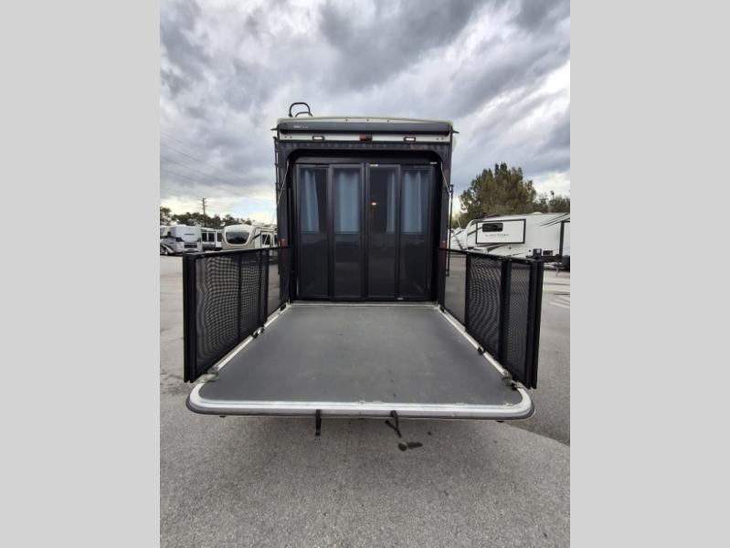 This is the toy hauler you've been waiting for! The standard side patio will allow you to party with friends, and the optional rear party deck provides even more options for fun. Your guests will love the 12' 6" garage that includes a HappiJack electric queen bed and dual convertible sofas underneath. There is also a loft for the kids and a convenient half bath here. In the main living area you can get cozy on the reclining sofa in front of the 50" TV and fireplace if the weather isn't cooperating outside. This model features the industry's first elevated kitchen (patent pending) with ample counter space, an 18 cu. ft. Norcold Polar Max 2-way refrigerator, and plentiful storage for all your dishes and food. When it's time to call it a night, the front private bedroom with a queen will feel just like home!