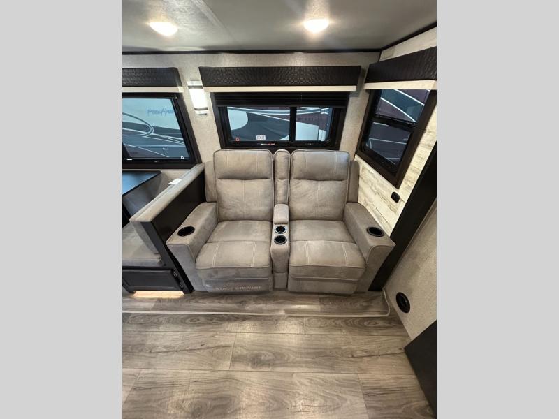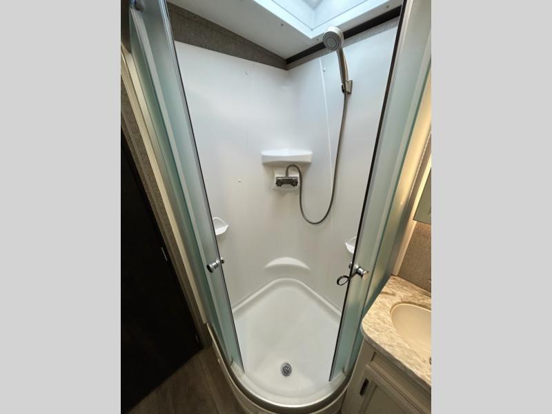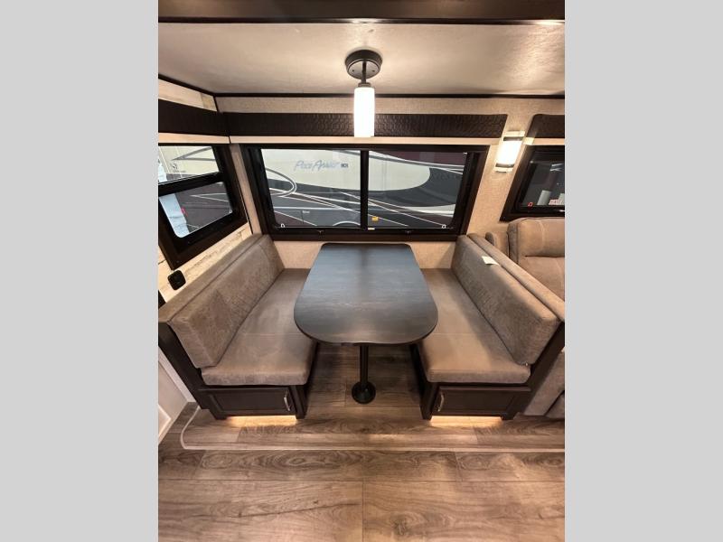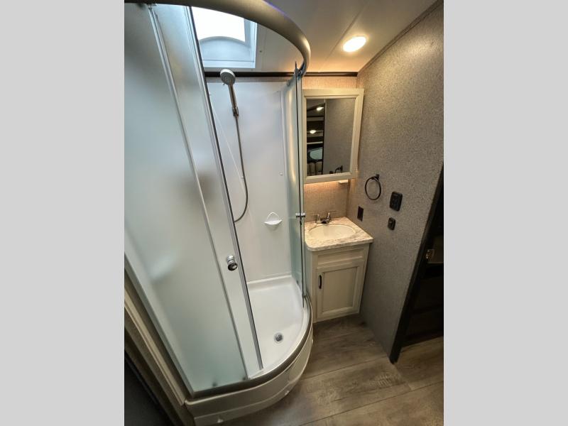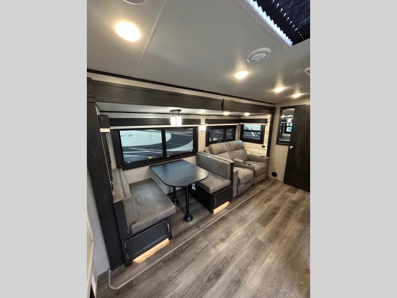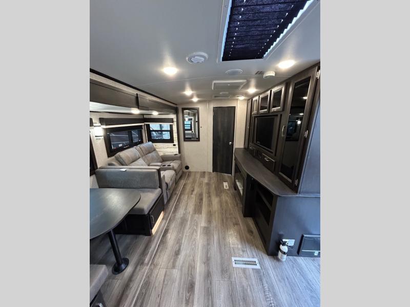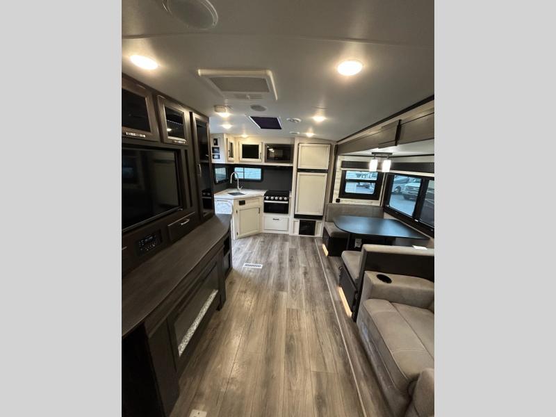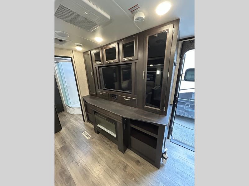 You will feel right at home in this travel trailer! The rear kitchen layout allows you to move about freely while you created a delicious meal with the three burner Furrion glass cooktop, the 8 cu. ft. refrigerator, and even the microwave. You can enjoy each meal comfortably at the booth dinette then play a card game or you can relax on the tri-fold sofa and enjoy the entertainment center with the electric fireplace and the 40" LED TV. You can start your days feeling clean and fresh by taking a hot, steamy shower in the glass 34" radius shower inside the walk-through bathroom, plus there is a linen closet and a small wardrobe for your storage needs. The front private bedroom offers a queen bed for a good night's rest with wardrobes on either side to keep your clothes neat, and even an entrance/exit door for you to slip out early in the morning for a quick fishing trip!