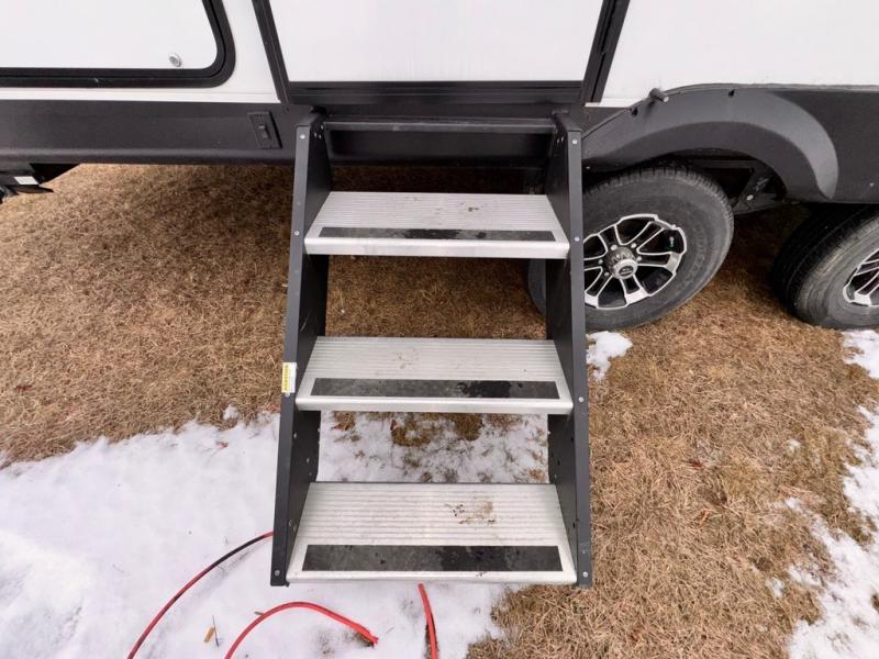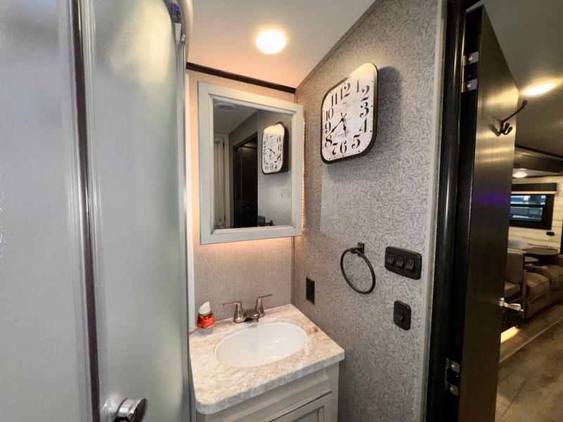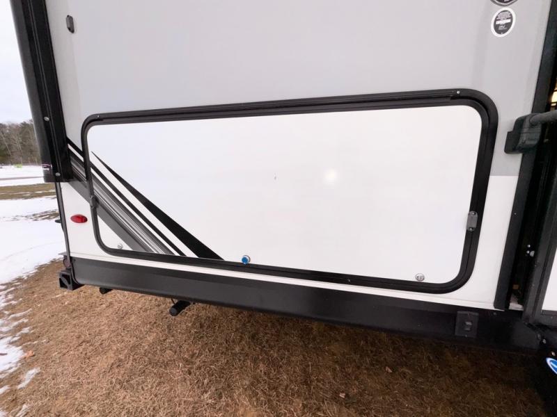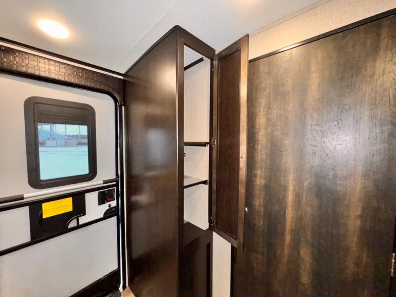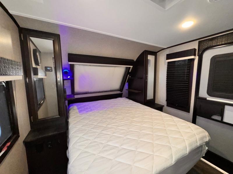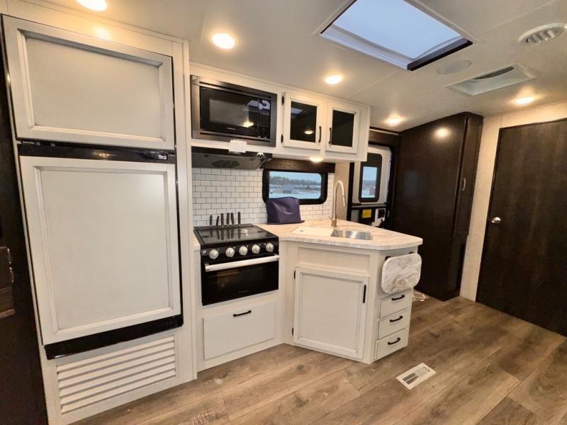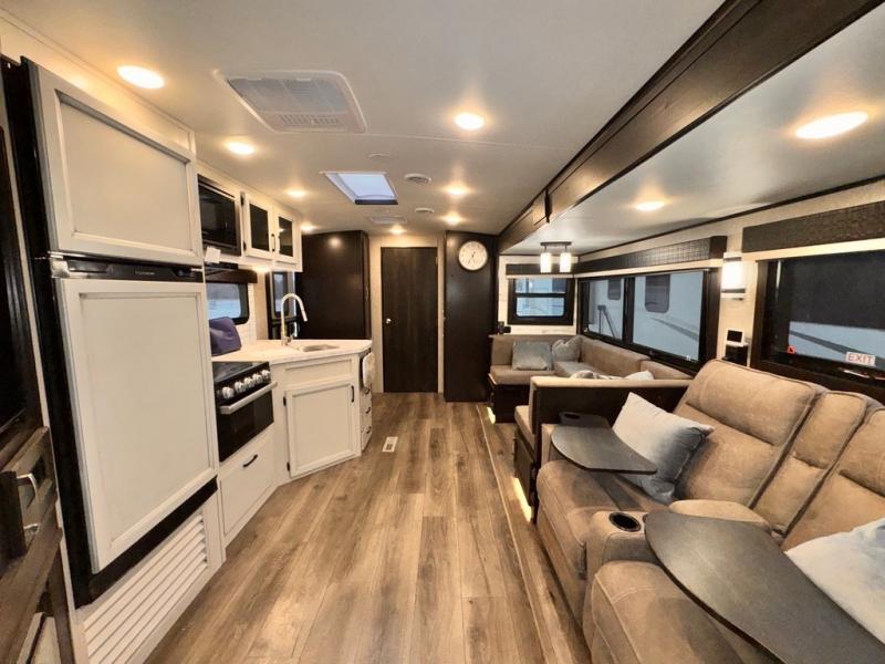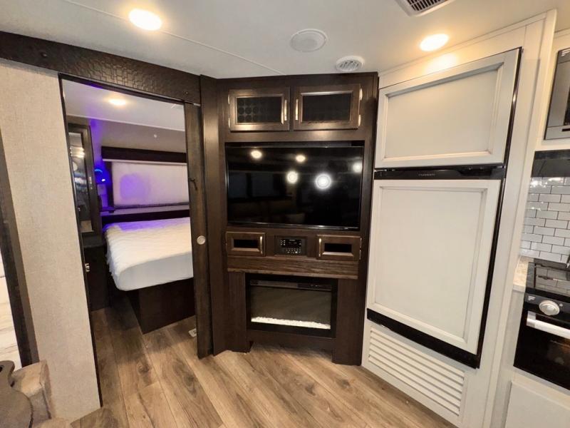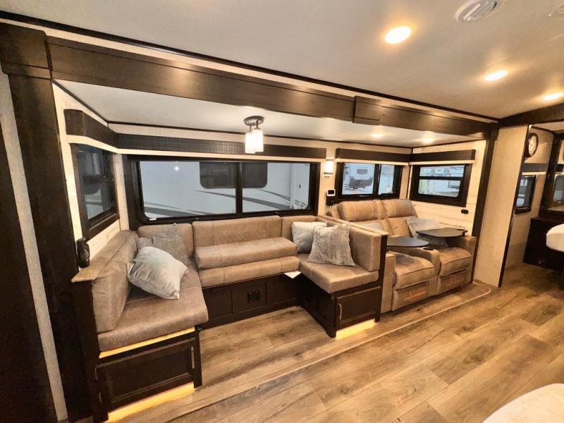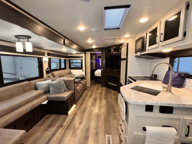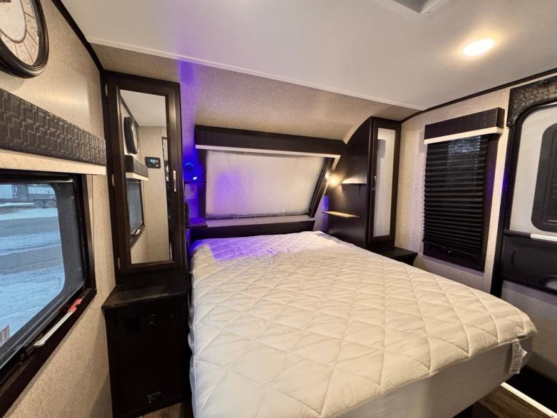 Step inside this dual entry travel trailer and see just how luxurious your next adventure will be! The full rear bathroom is packed with features you will love like the glass 34" radius shower with a skylight above, the porcelain foot flush toilet, and the large wardrobe to keep your linens handy. There are two pantries to store everyone's favorite snacks, a U-shaped dinette to enjoy your meals at, and a microwave to pop a bag of popcorn for movie night on the tri-fold sofa in front of the entertainment center. After a fun-filled day you can lay down on the queen bed in the front private bedroom or head outdoors and relax underneath the 19' electric awning with LED lights and marine-grade exterior speakers with blue LED accent lighting to keep the good times going!