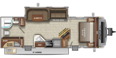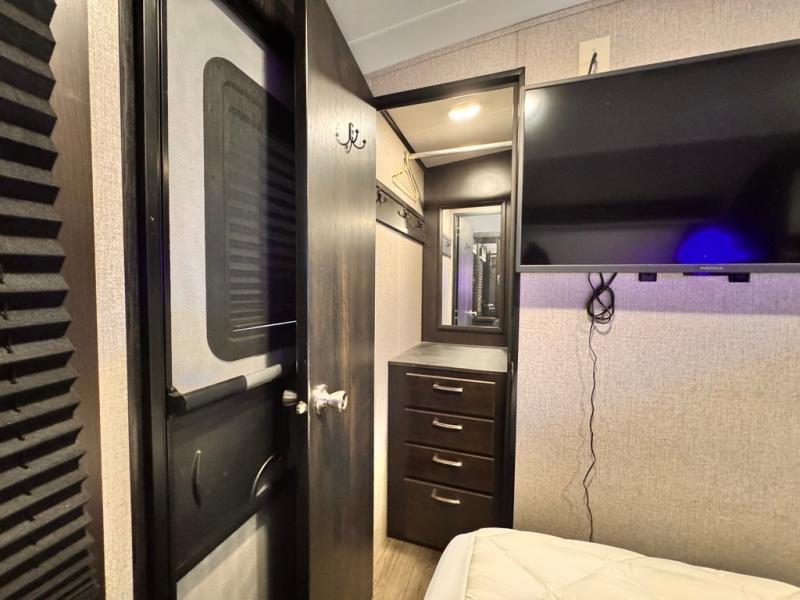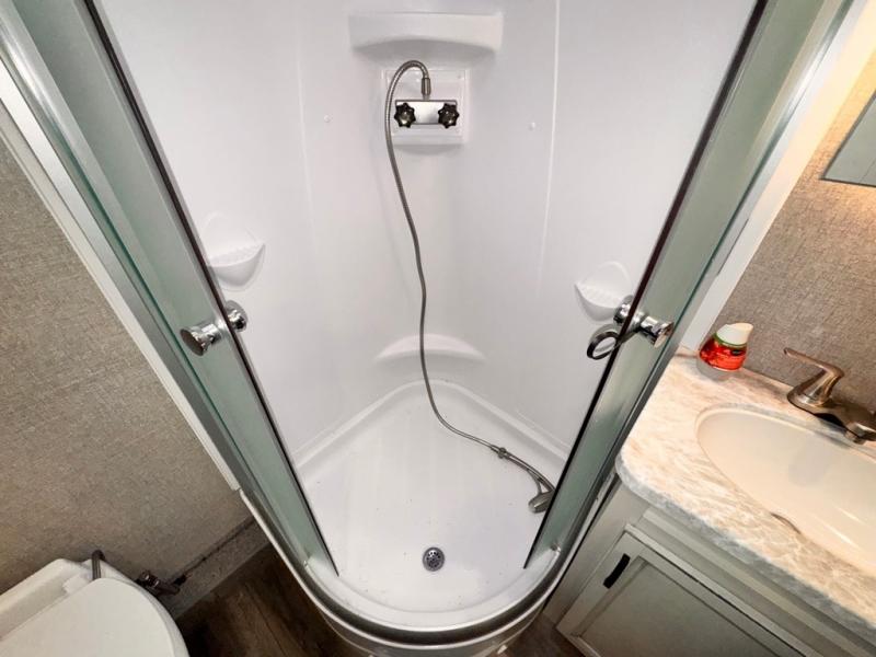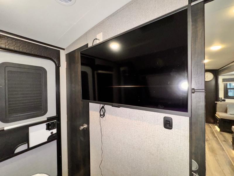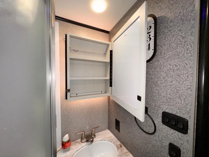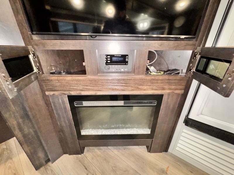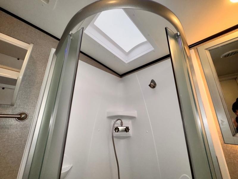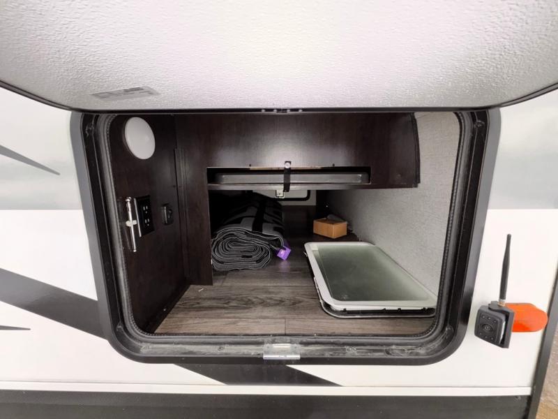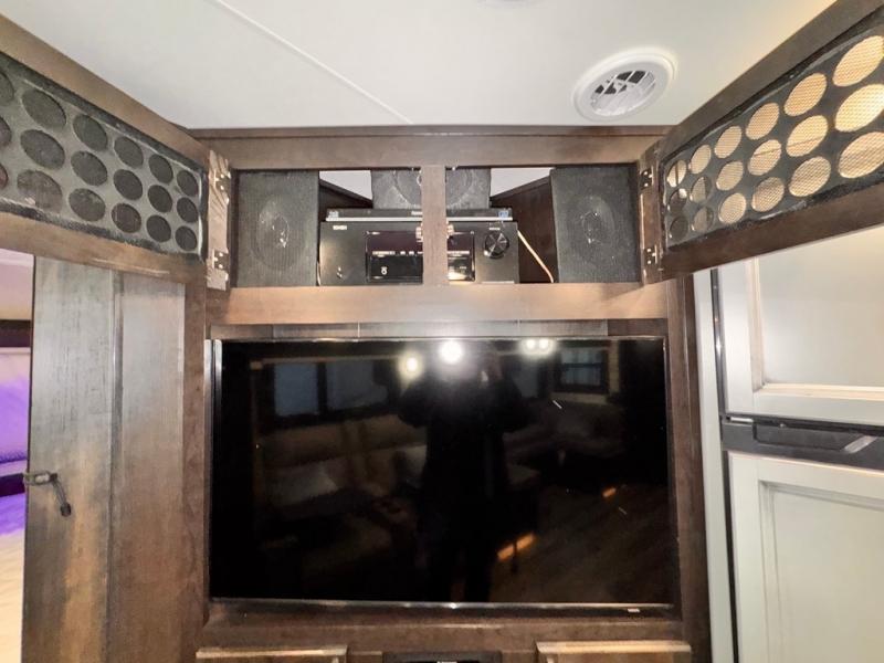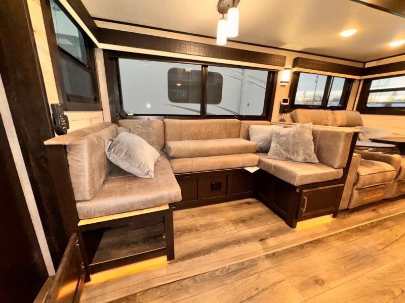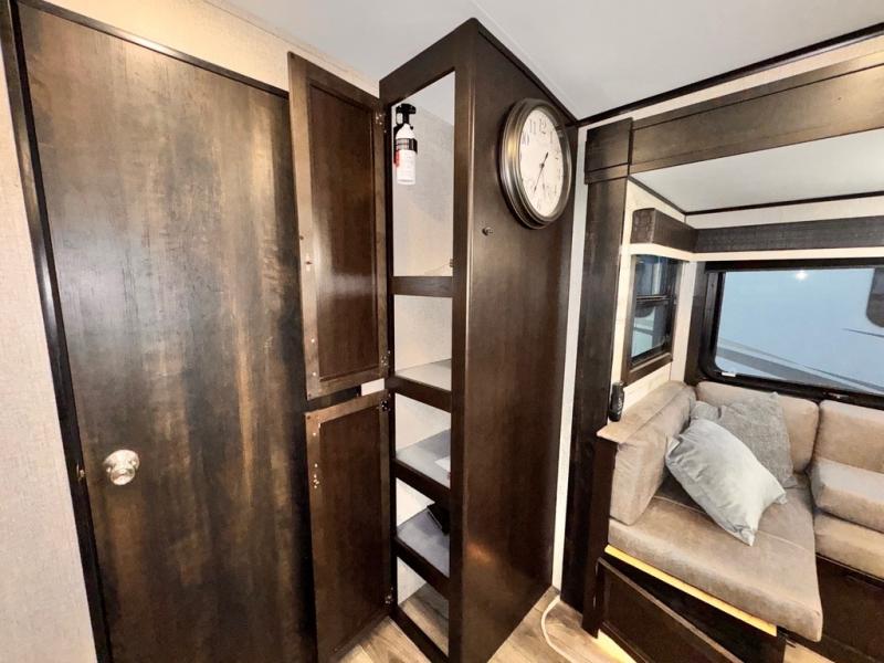 Step inside this dual entry travel trailer and see just how luxurious your next adventure will be! The full rear bathroom is packed with features you will love like the glass 34" radius shower with a skylight above, the porcelain foot flush toilet, and the large wardrobe to keep your linens handy. There are two pantries to store everyone's favorite snacks, a U-shaped dinette to enjoy your meals at, and a microwave to pop a bag of popcorn for movie night on the tri-fold sofa in front of the entertainment center. After a fun-filled day you can lay down on the queen bed in the front private bedroom or head outdoors and relax underneath the 19' electric awning with LED lights and marine-grade exterior speakers with blue LED accent lighting to keep the good times going!