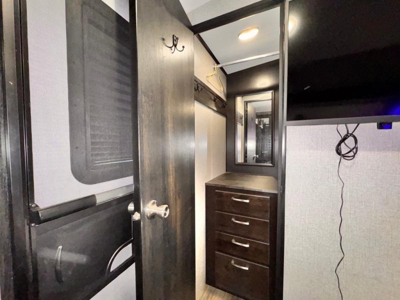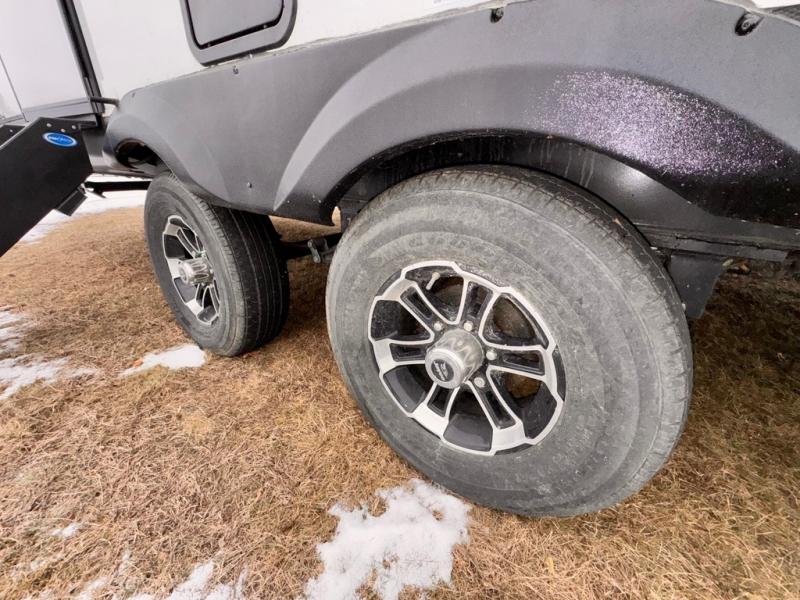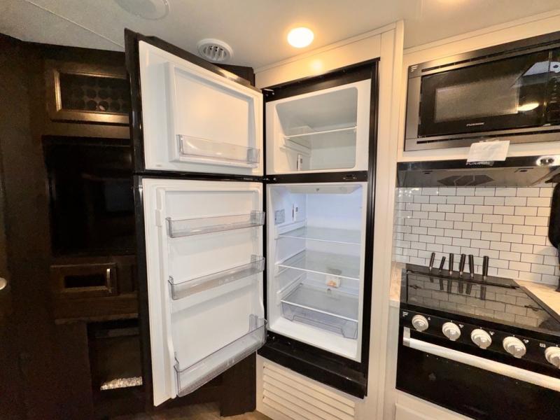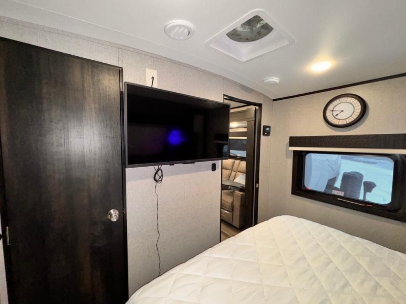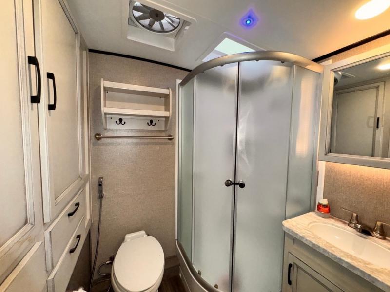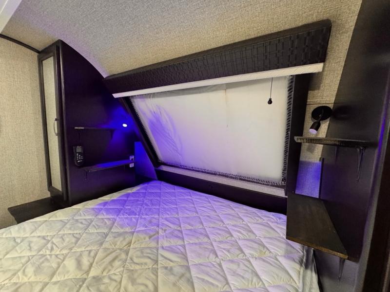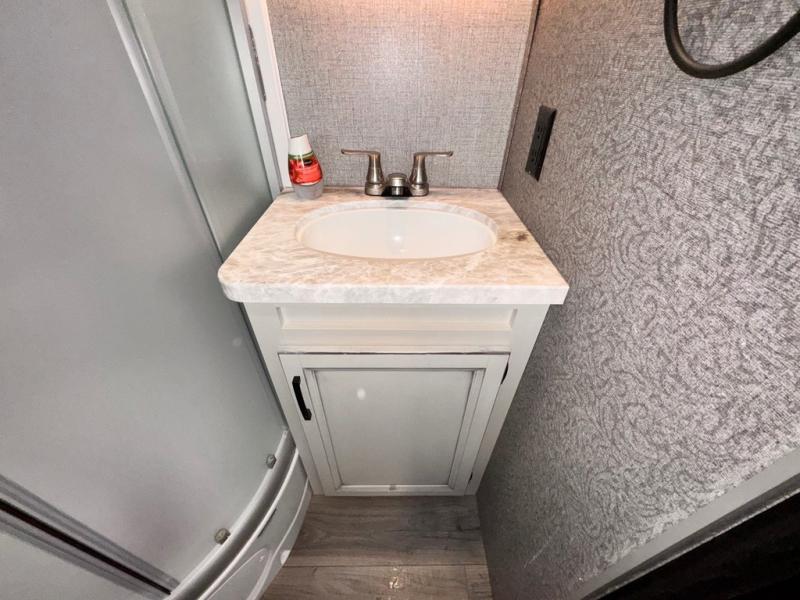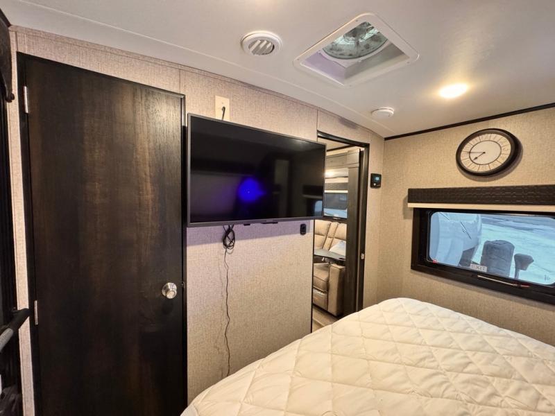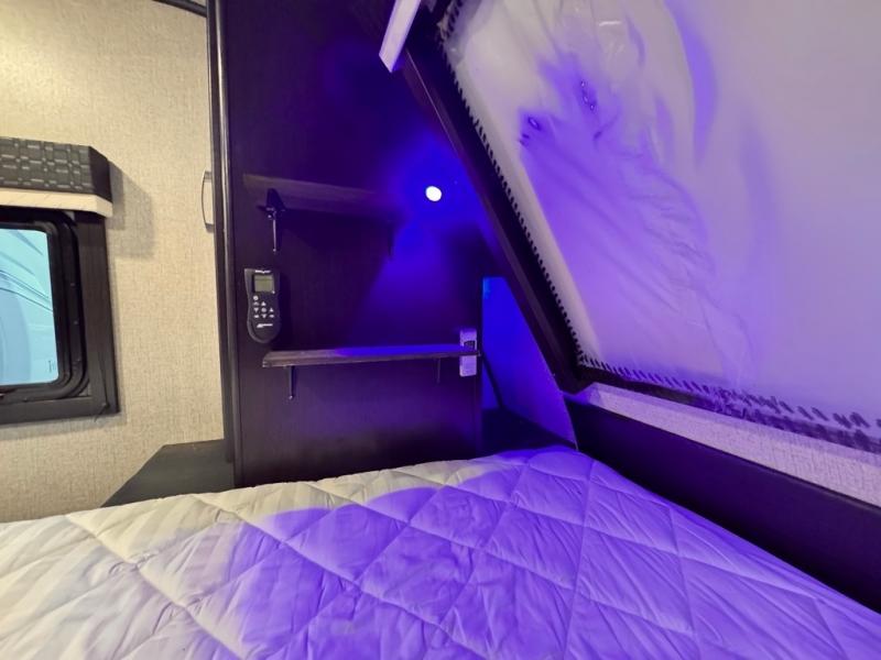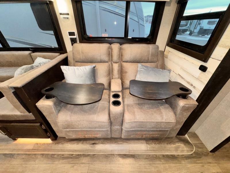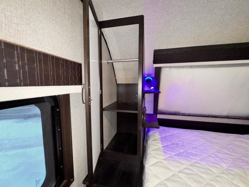 Step inside this dual entry travel trailer and see just how luxurious your next adventure will be! The full rear bathroom is packed with features you will love like the glass 34" radius shower with a skylight above, the porcelain foot flush toilet, and the large wardrobe to keep your linens handy. There are two pantries to store everyone's favorite snacks, a U-shaped dinette to enjoy your meals at, and a microwave to pop a bag of popcorn for movie night on the tri-fold sofa in front of the entertainment center. After a fun-filled day you can lay down on the queen bed in the front private bedroom or head outdoors and relax underneath the 19' electric awning with LED lights and marine-grade exterior speakers with blue LED accent lighting to keep the good times going!