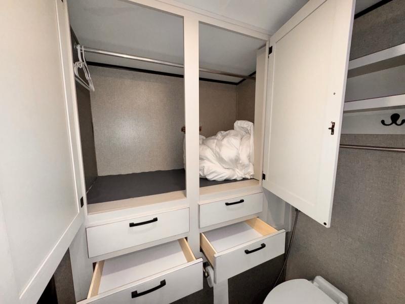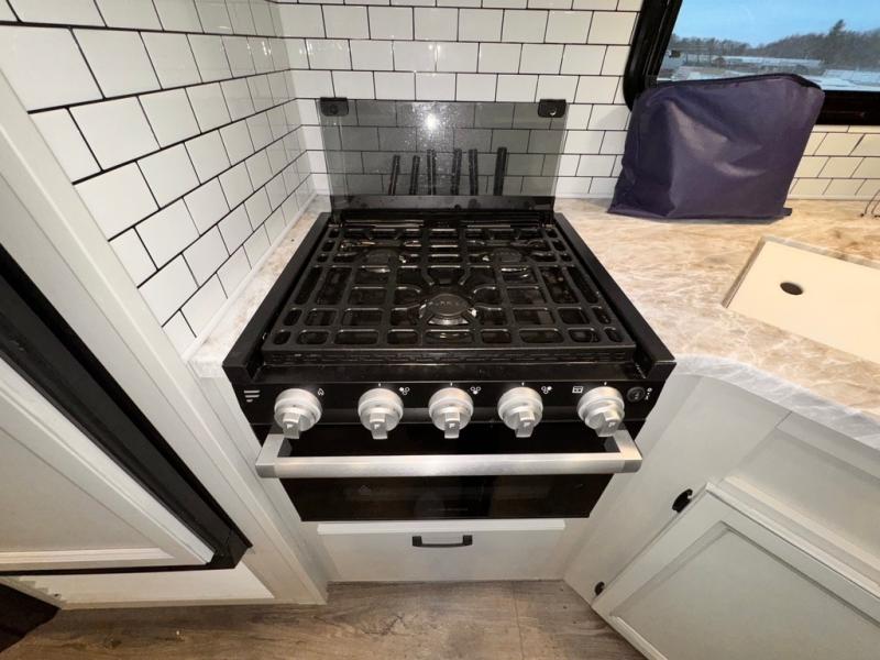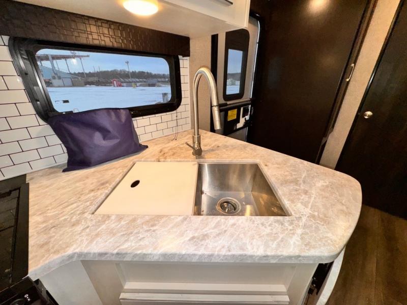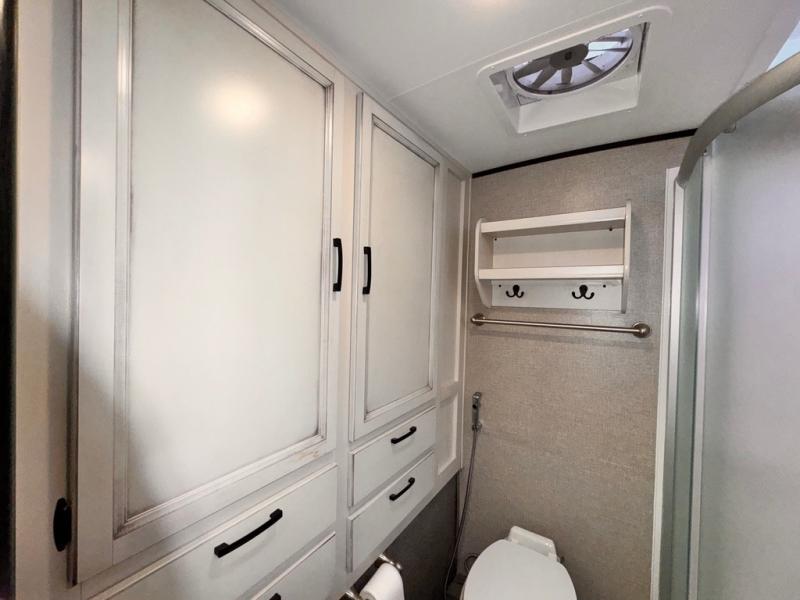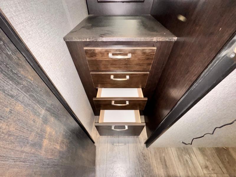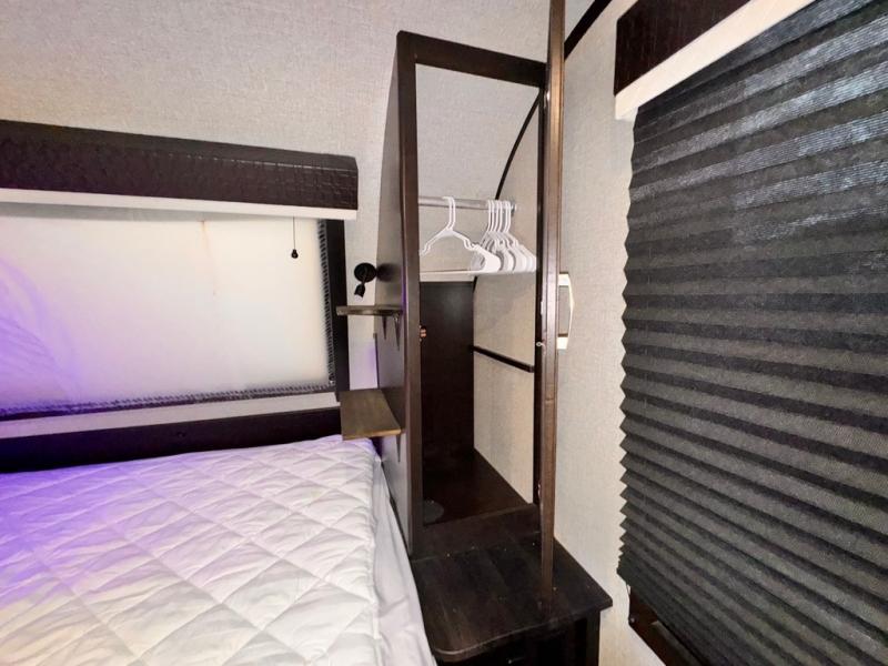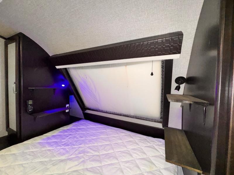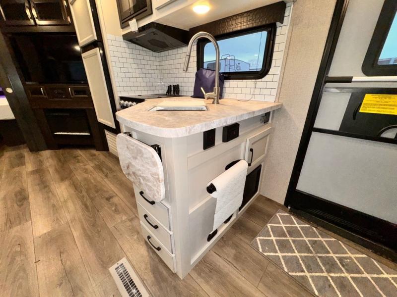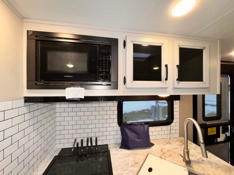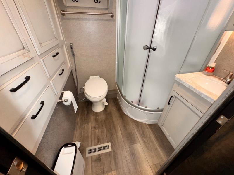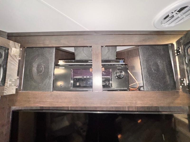 Step inside this dual entry travel trailer and see just how luxurious your next adventure will be! The full rear bathroom is packed with features you will love like the glass 34" radius shower with a skylight above, the porcelain foot flush toilet, and the large wardrobe to keep your linens handy. There are two pantries to store everyone's favorite snacks, a U-shaped dinette to enjoy your meals at, and a microwave to pop a bag of popcorn for movie night on the tri-fold sofa in front of the entertainment center. After a fun-filled day you can lay down on the queen bed in the front private bedroom or head outdoors and relax underneath the 19' electric awning with LED lights and marine-grade exterior speakers with blue LED accent lighting to keep the good times going!
